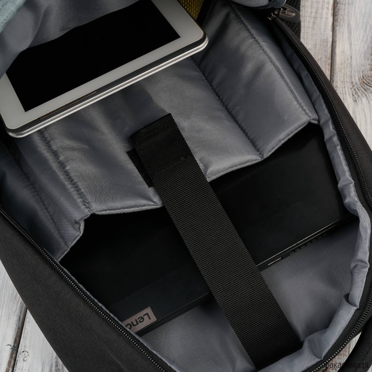 Druga, główna komora – wyposażona w dedykowaną przegrodę na laptopa do 16”, zabezpieczoną pianką dystansującą, która chroni urządzenie przed wstrząsami.