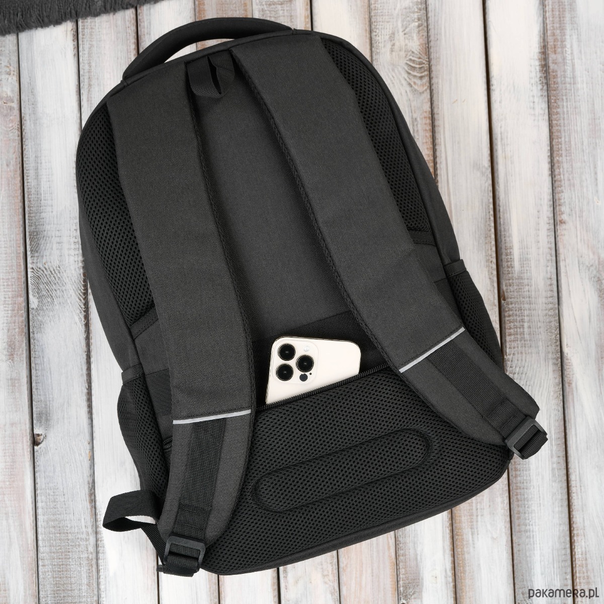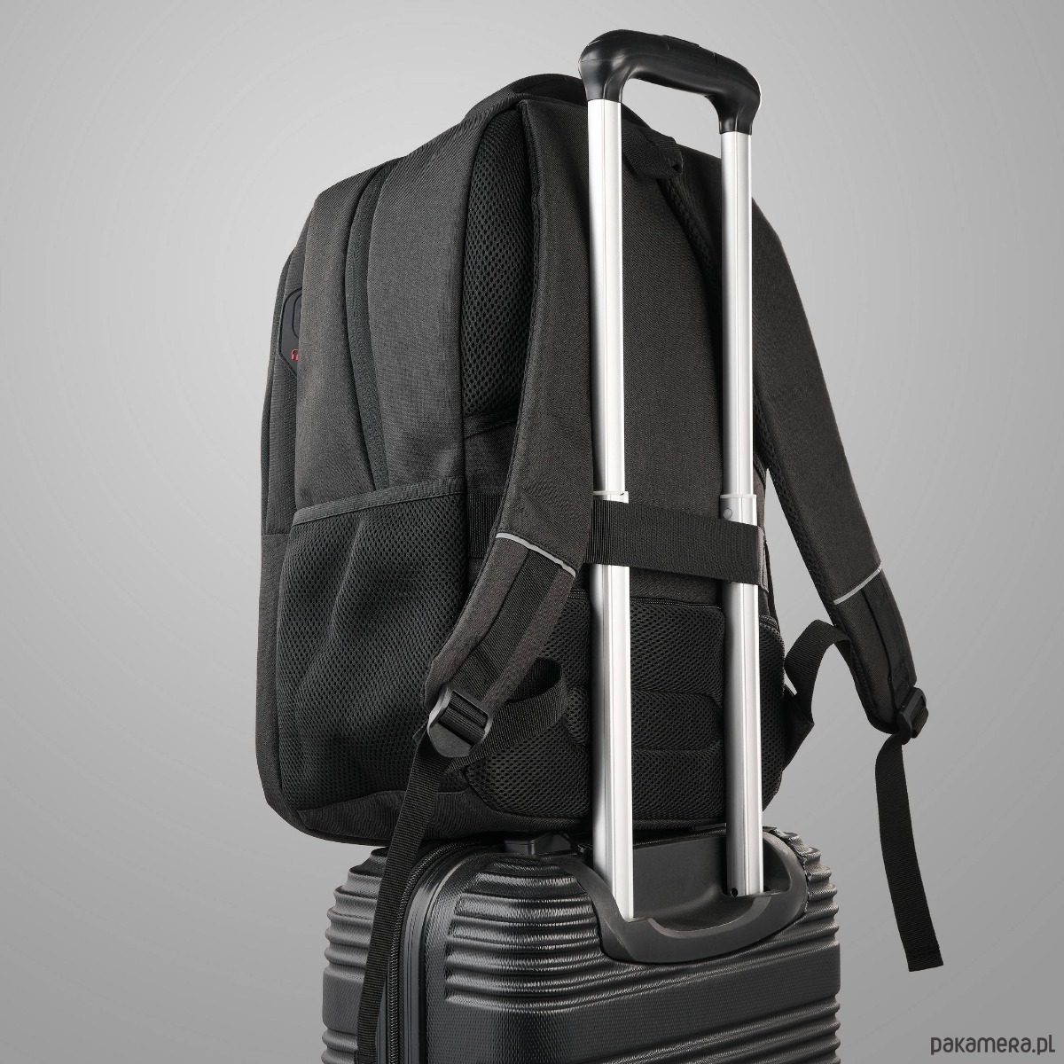 Szlufka z tyłu plecaka – umożliwia łatwe przymocowanie do walizki na kółkach, idealne podczas podróży służbowych.
