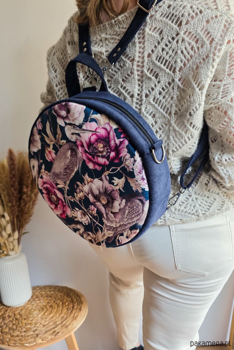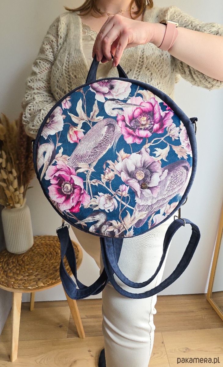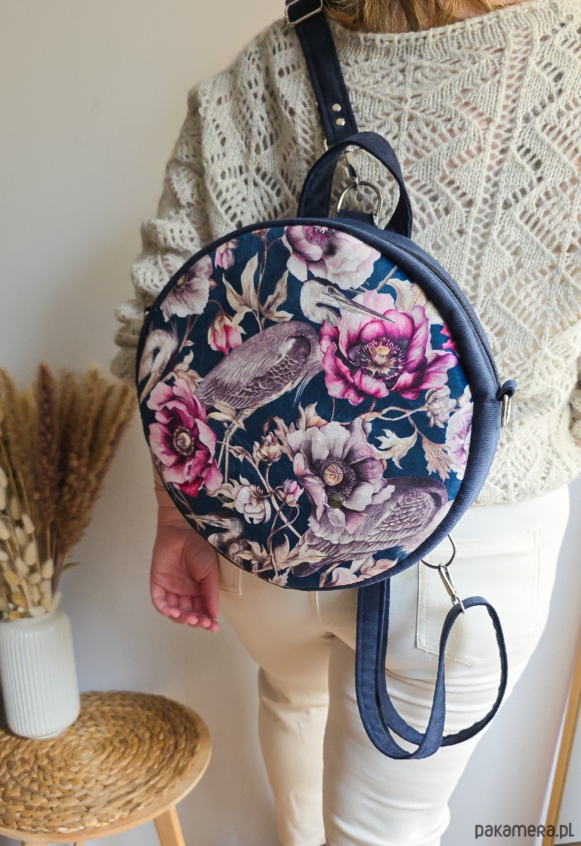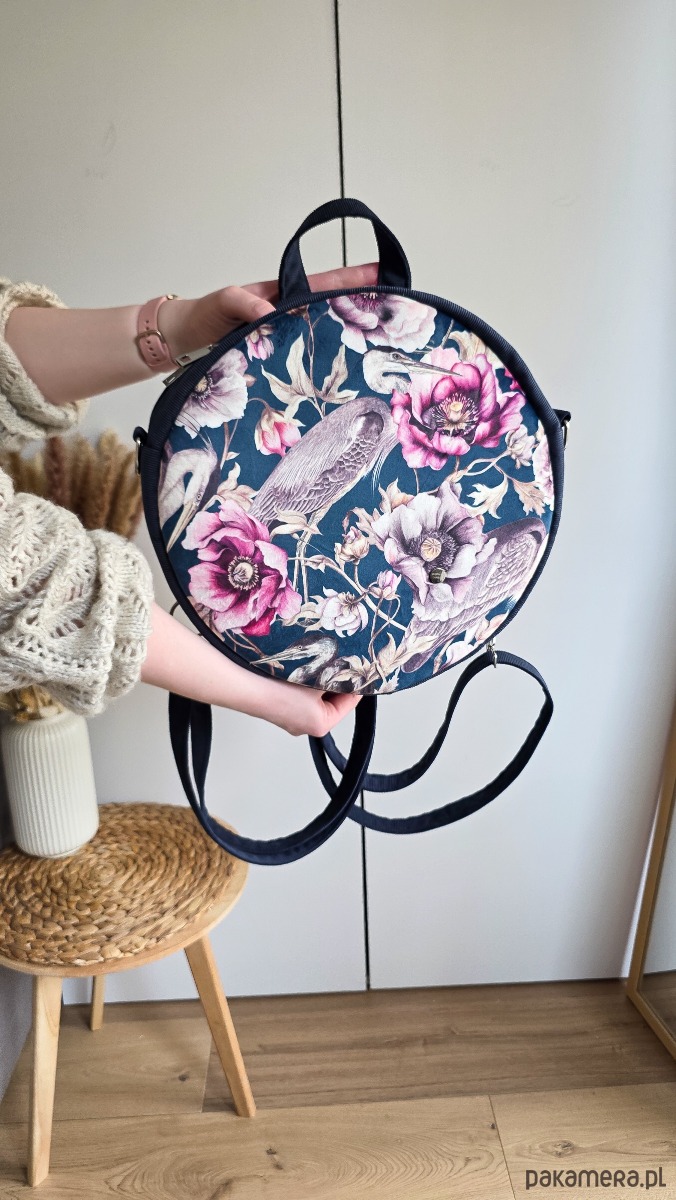 Plecak Okrągły z Motywem Kwiatów i Czapli Granatowy