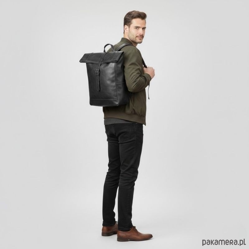 Buduje wizerunek – naturalna skóra i forma plecaka typu roll top dodają klasy i charakteru.