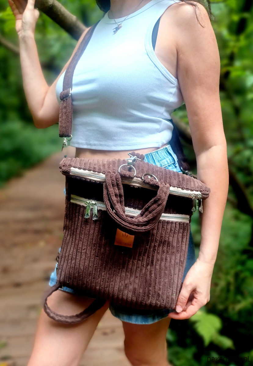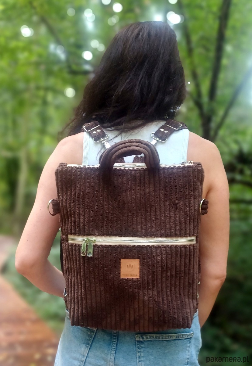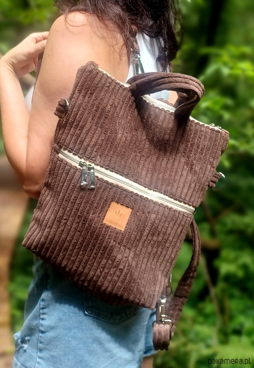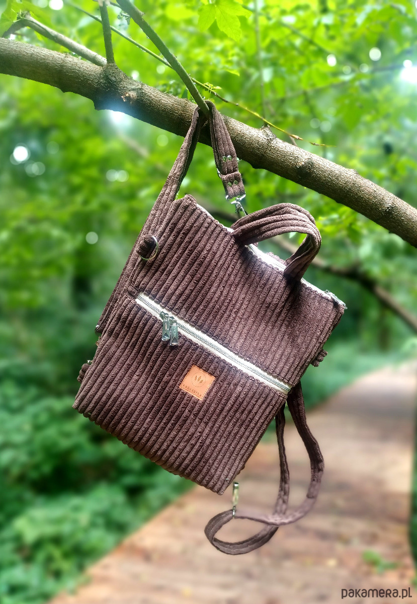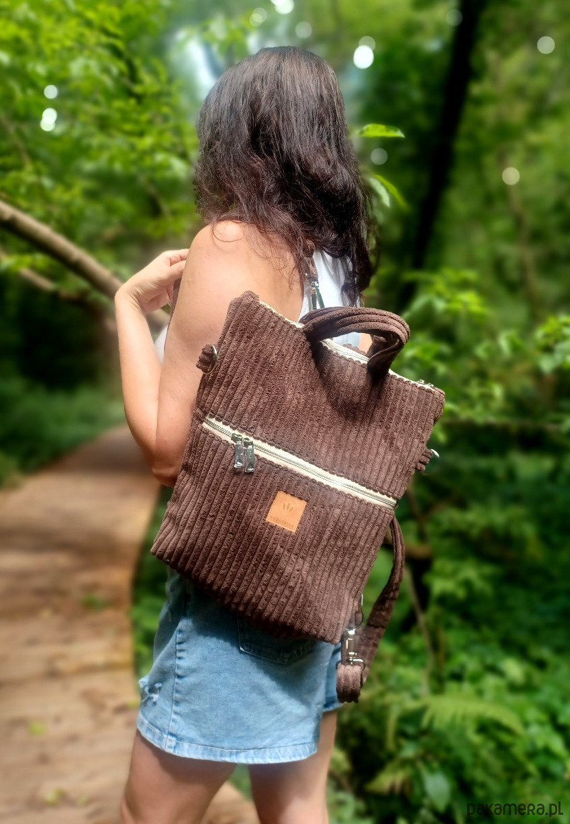 Torebko-plecak może służyć jako torebka albo jak plecak po przypięciu szelek do tyłu plecaka.