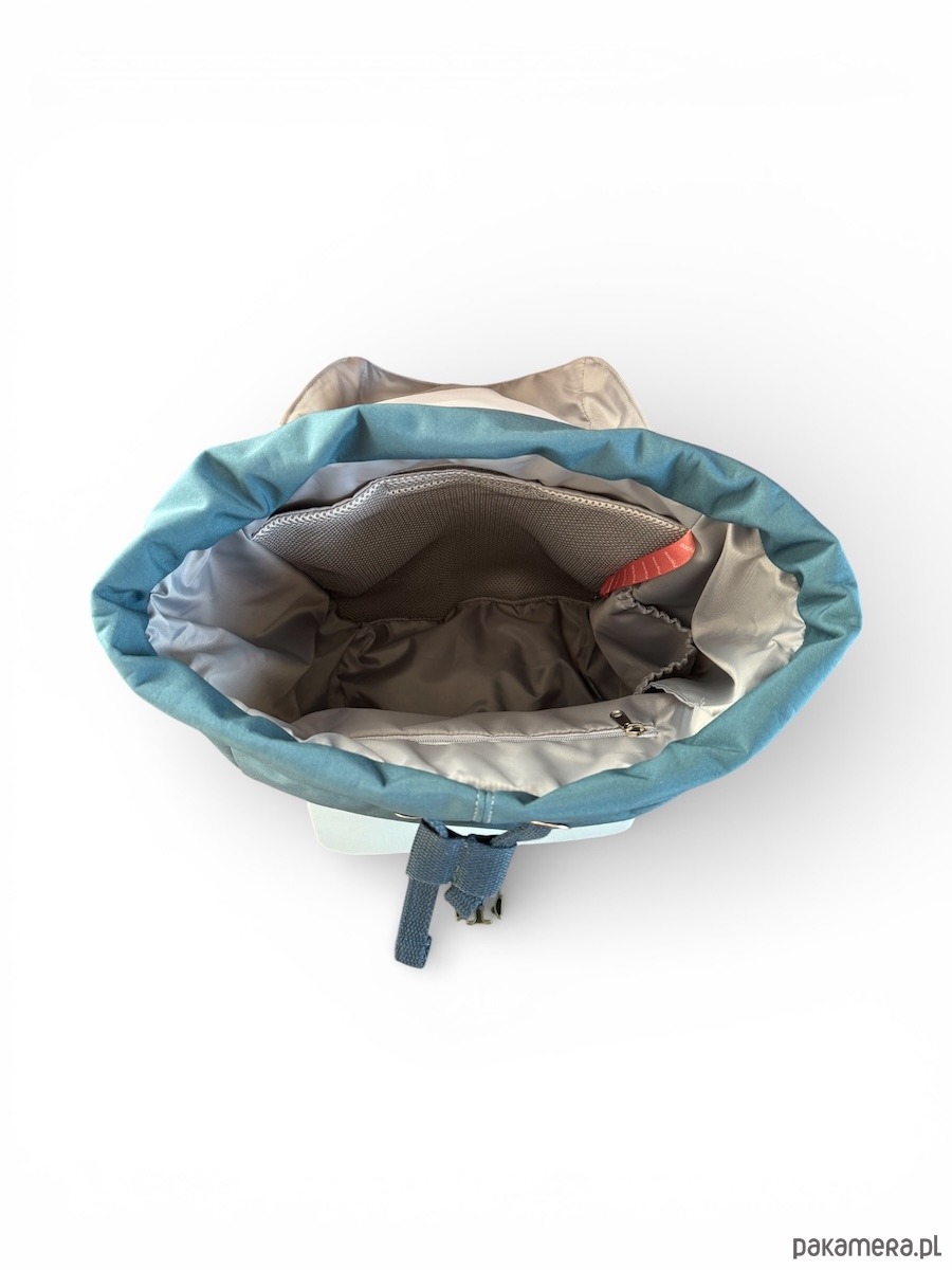 Wnętrze plecak jest podszyte wodoodporną podszewką. W środku znajduje się przegroda na laptopa, kieszeń na zamek, kieszeń na bidon oraz karabińczyk do dopięcia kluczy.