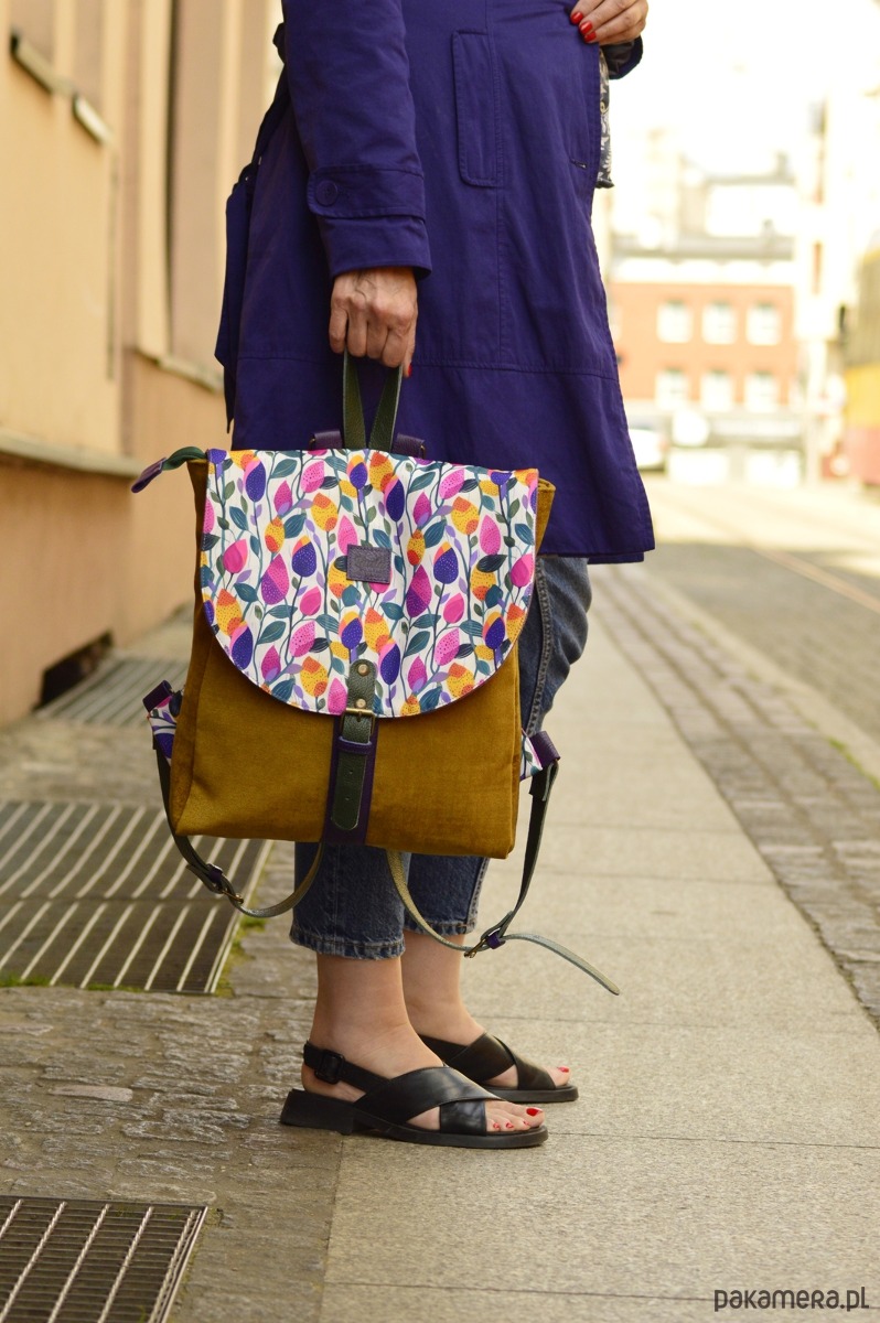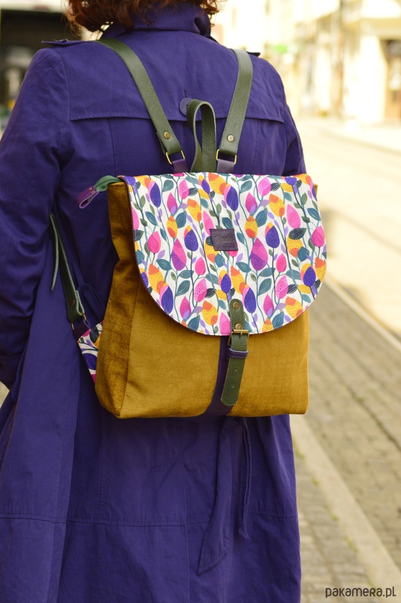Plecak powstał z wzorzystej tkaniny poliestrowej ( Klapa), musztardowego weluru ( korpus)oraz skóry naturalnej (łączenia, paski, zapięcie). Całość została wzmocniona warstwą wodoodporną i zapina się na zatrzaski. Wewnątrz znajdują się trzy kieszonki ( w tym jedna na suwak). Dodatkowo plecak ma kieszonkę z tyłu na zewnątrz.