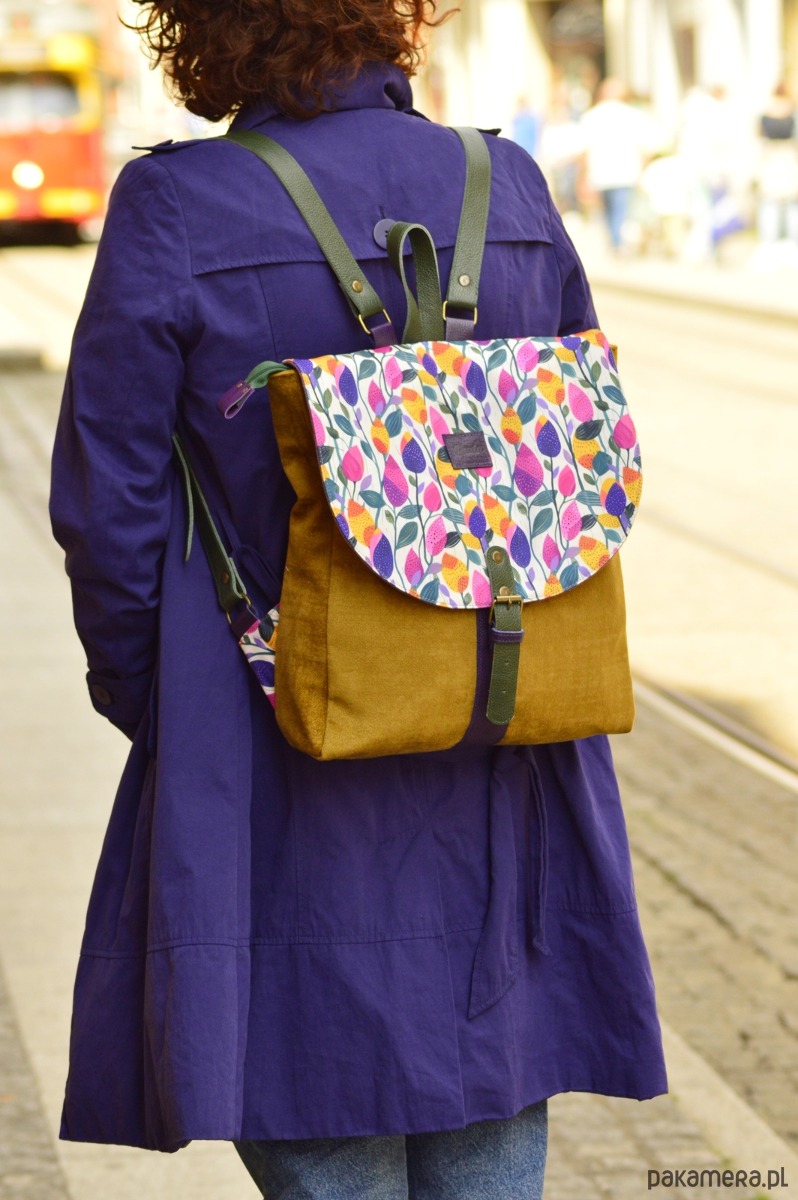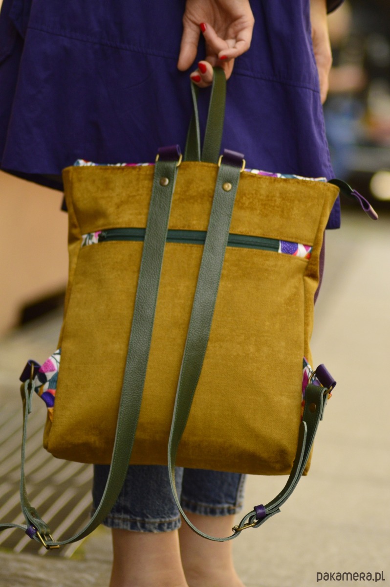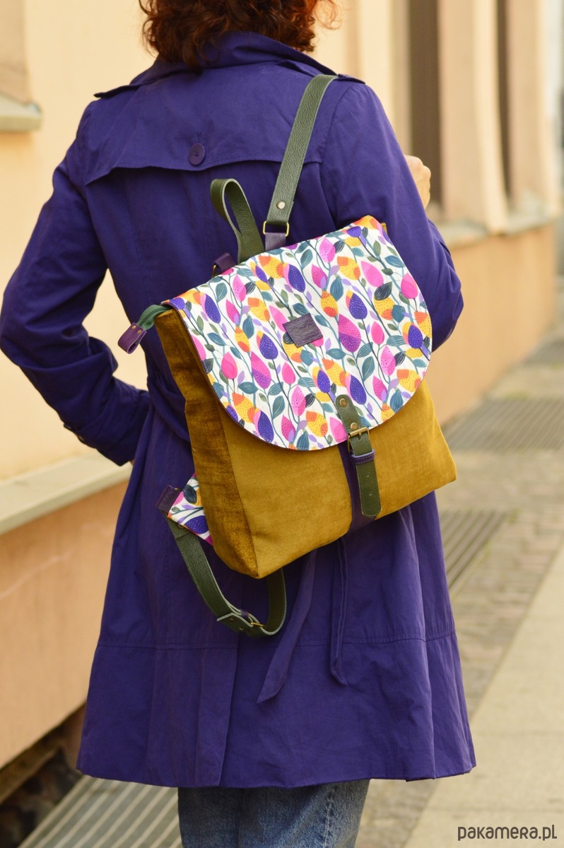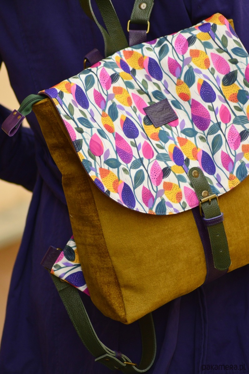 Plecak powstał z wzorzystej tkaniny poliestrowej ( Klapa), musztardowego weluru ( korpus)oraz skóry naturalnej (łączenia, paski, zapięcie). Całość została wzmocniona warstwą wodoodporną i zapina się na zatrzaski. Wewnątrz znajdują się trzy kieszonki ( w tym jedna na suwak). Dodatkowo plecak ma kieszonkę z tyłu na zewnątrz.