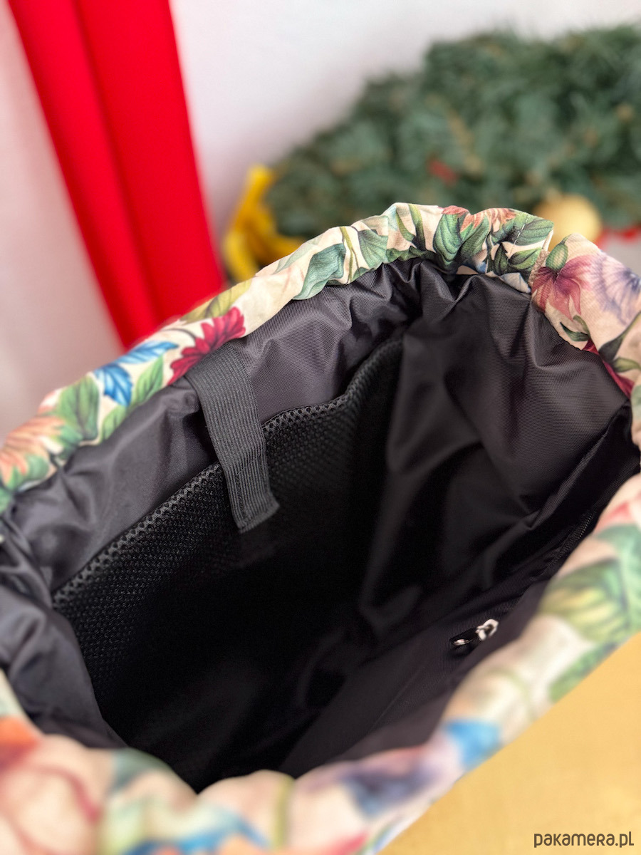 Środek został wykonany z podszewki wodoodpornej. W środku znajdziesz karabinek do dopięcia kluczy, kieszeń na zamek oraz przegrodę, która fantastycznie sprawdzi się na laptopa (w rozmiarze standard i maxi). Szelki plecaka są wykonane z mocnej, szerokiej na 32 mm taśmy bawełniano-poliestrowej, która jest obszyta od zewnętrznej strony welurem. Plecak posiada również krótką rączkę na tyle.