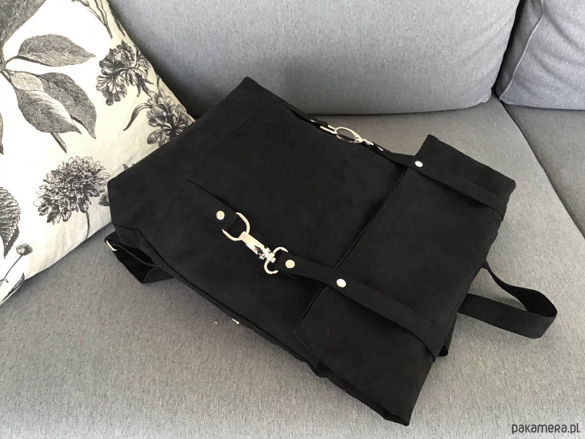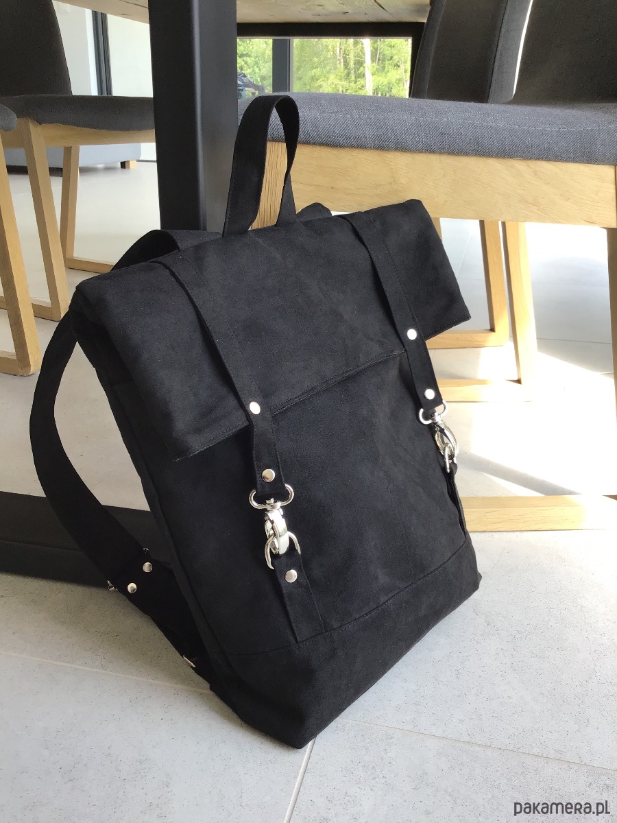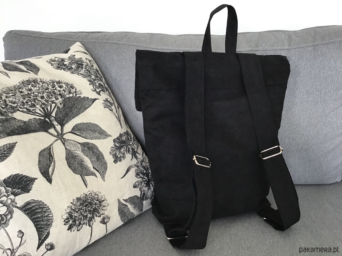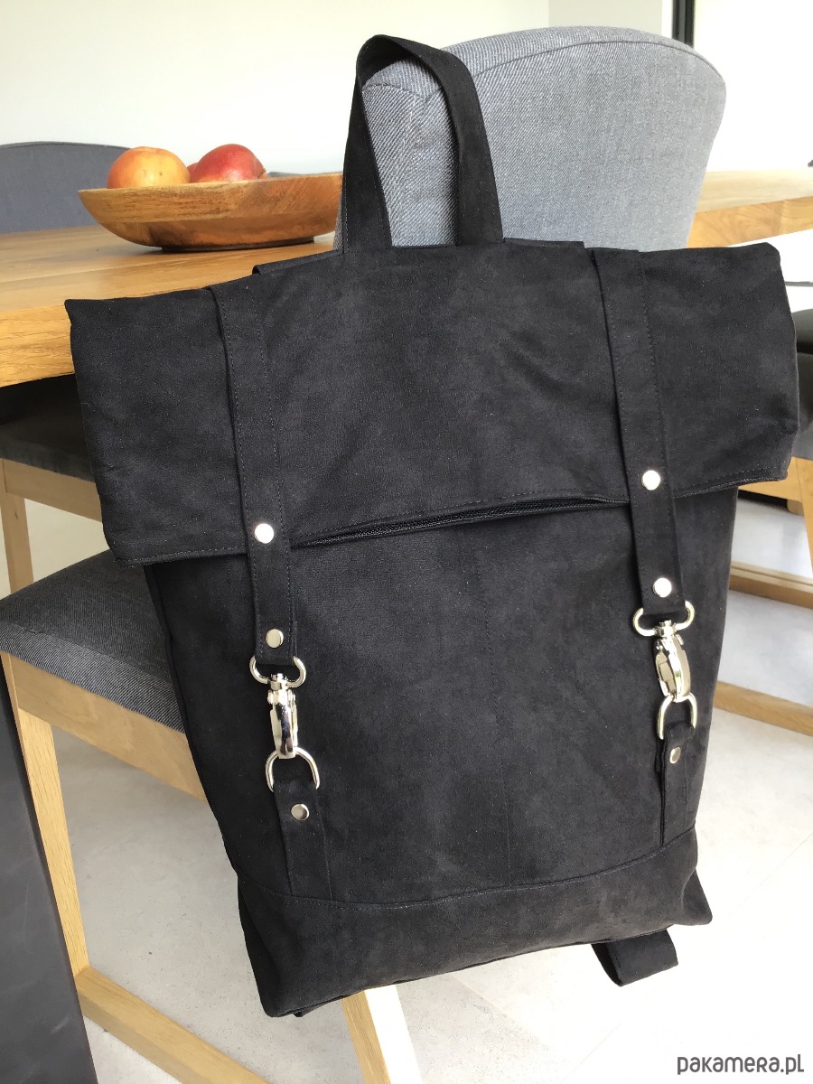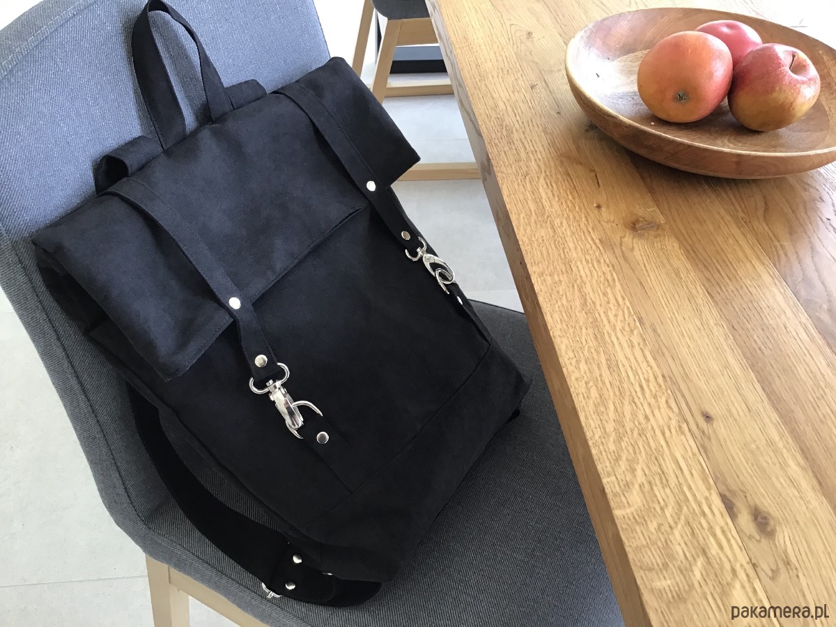 Pakowny plecak wykonany z alcantry (syntetycznego zamszu).