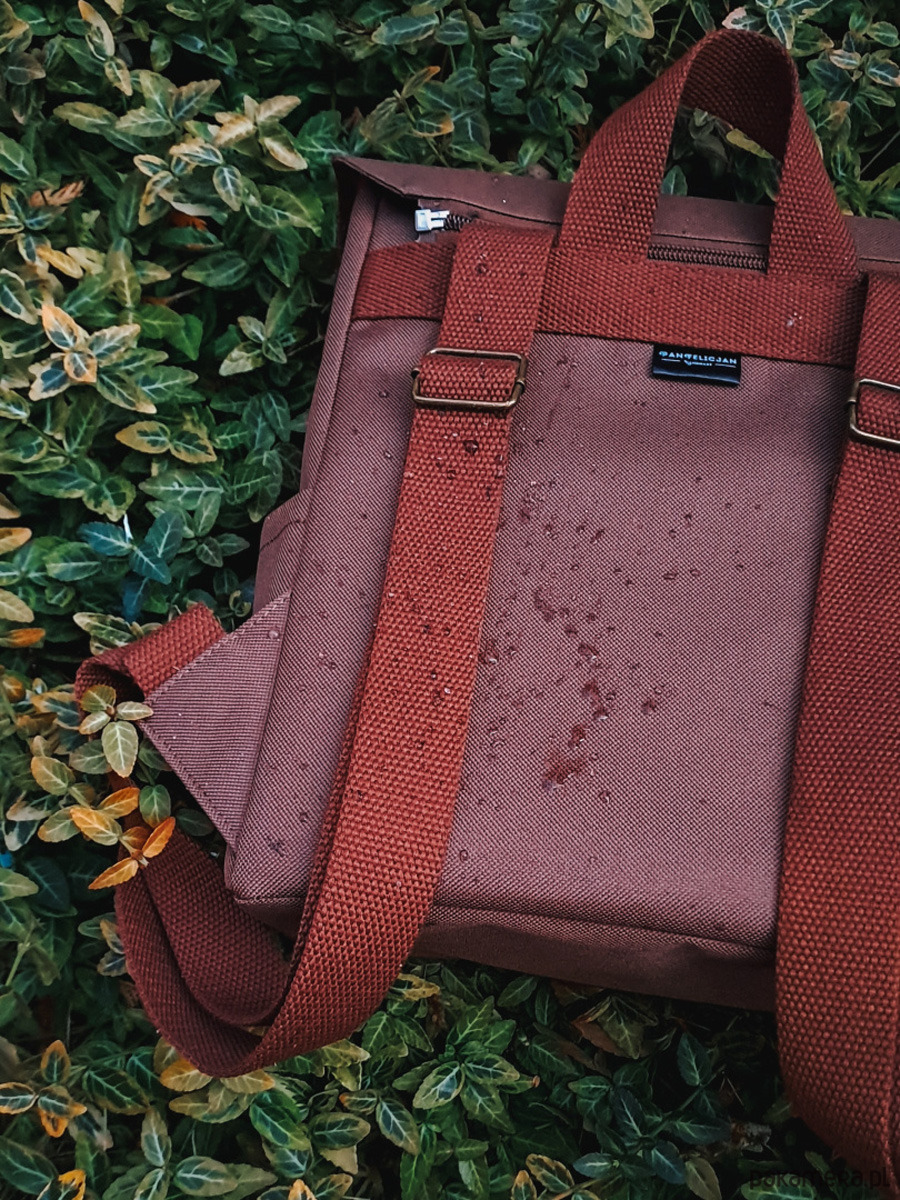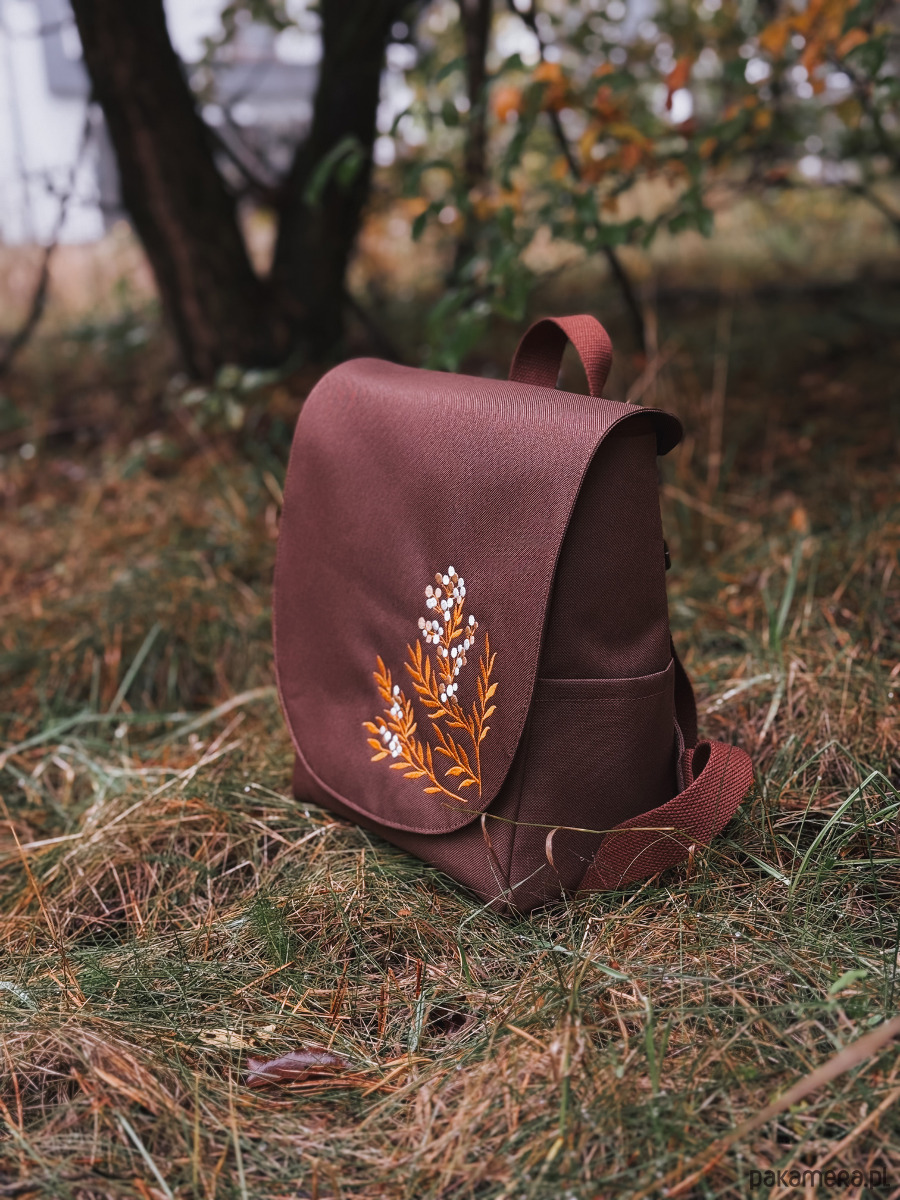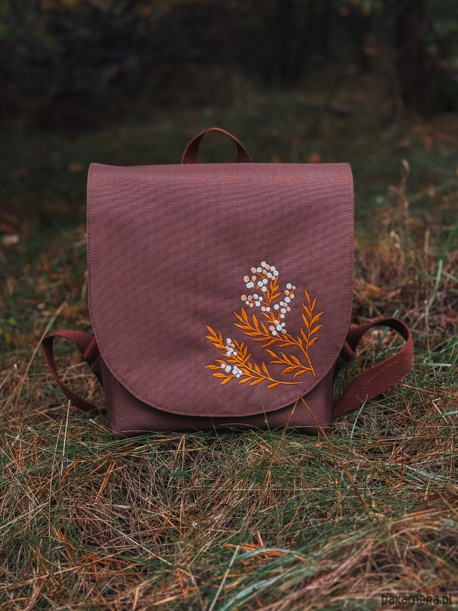 Plecak jest wodoodporny! Uszyłam go z wodoodpornej kodury. To materiał, kóry nie tylko nie przepuszcza wody, ale również niezwykle łatwo czyści się go mokrą gąbką. Dno i ścianki plecaka zostały mocno usztywnione - plecak zachowuje swój unikatowy kształt. Wnętrze plecaka wypełniłam bawełnianą podszewką, a w głównej komorze znajdziecie trzy dodatkowe kieszonki - jedna na suwak i dwie otwarte. Czwarta kieszonka mieści się pod klapką na przodzie plecaka, a piątą i szóstą znajdziecie na bocznych ściankach. Dużo ich? Wiem, że kochacie kieszonki! :) Paski plecaka to mocna, bawełniana taśma, kórej środek posiada dodatkowy rdzeń poliestrowy - są wytrzymałe i dostosowane do pojemności plecaka. Klapkę plecaka zdobi haft :)