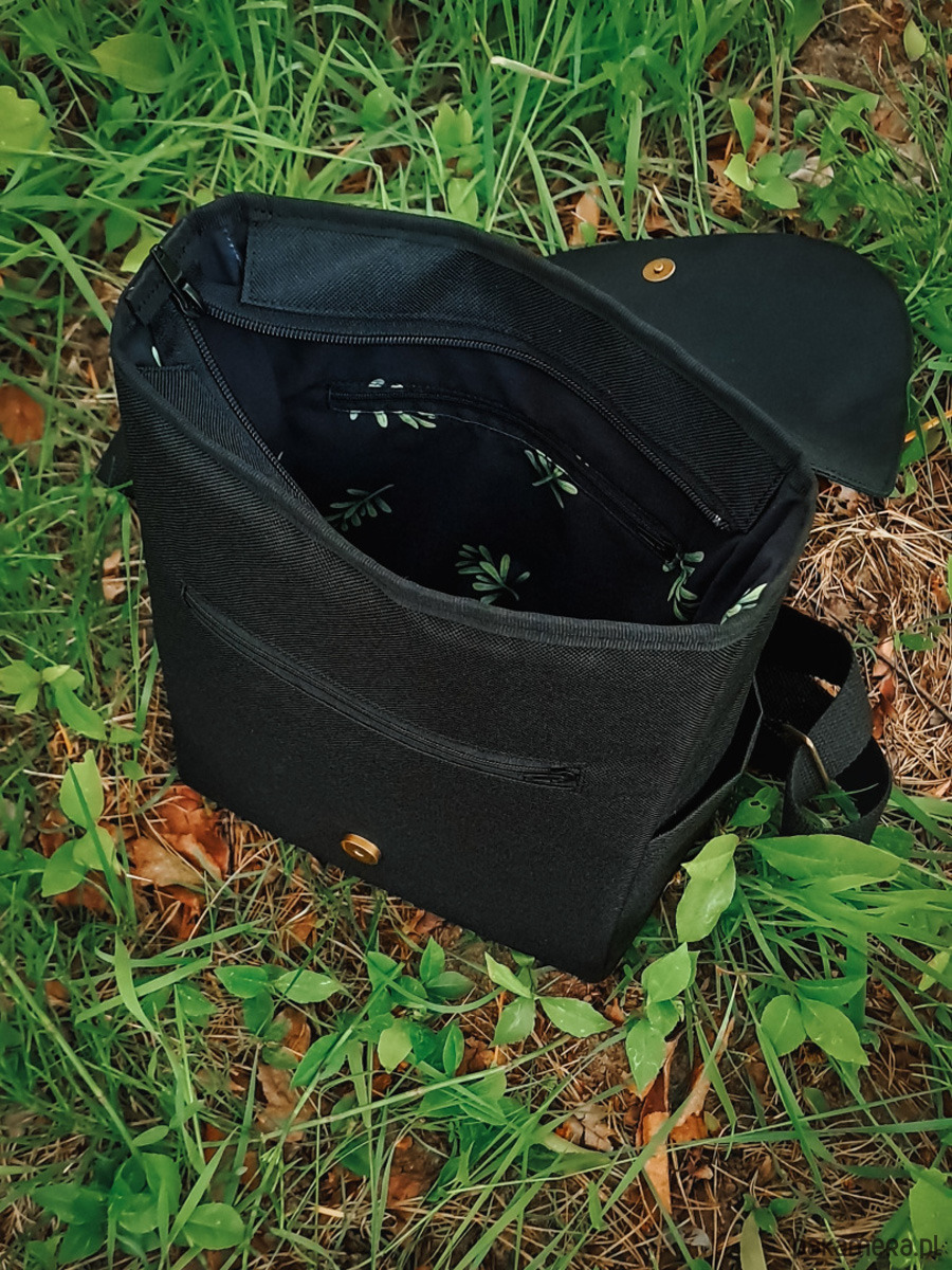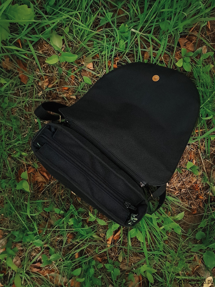 Plecak jest wodoodporny! Uszyłam go z wodoodpornej kodury. To materiał, kóry nie tylko nie przepuszcza wody, ale również niezwykle łatwo czyści się go mokrą gąbką. Dno i ścianki plecaka zostały mocno usztywnione - plecak zachowuje swój unikatowy kształt. Wnętrze plecaka wypełniłam bawełnianą podszewką, a w głównej komorze znajdziecie trzy dodatkowe kieszonki - jedna na suwak i dwie otwarte. Czwarta kieszonka mieści się pod klapką na przodzie plecaka, a piątą i szóstą znajdziecie na bocznych ściankach. Dużo ich? Wiem, że kochacie kieszonki! :) Paski plecaka to mocna, bawełniana taśma, kórej środek posiada dodatkowy rdzeń poliestrowy - są wytrzymałe i dostosowane do pojemności plecaka. Klapkę plecaka zdobi haft :)