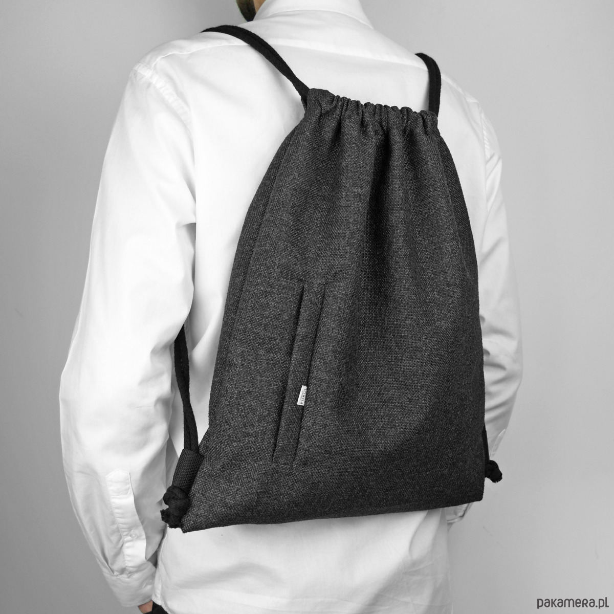 Uniwersalny plecak worek z grubej, wytrzymałej tkaniny.