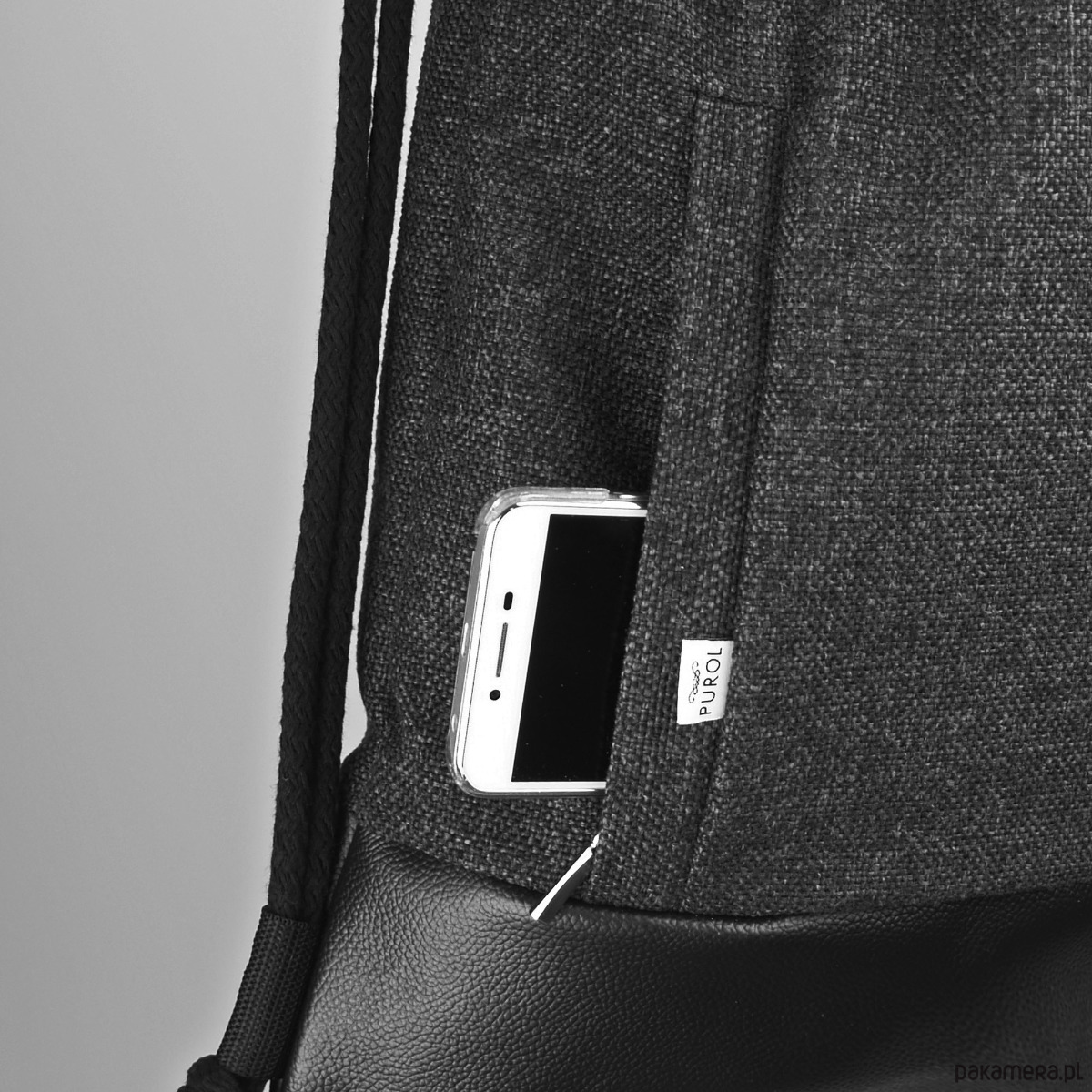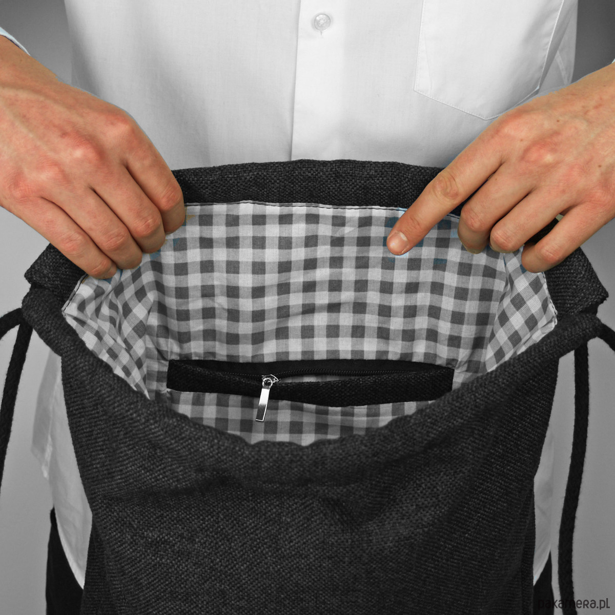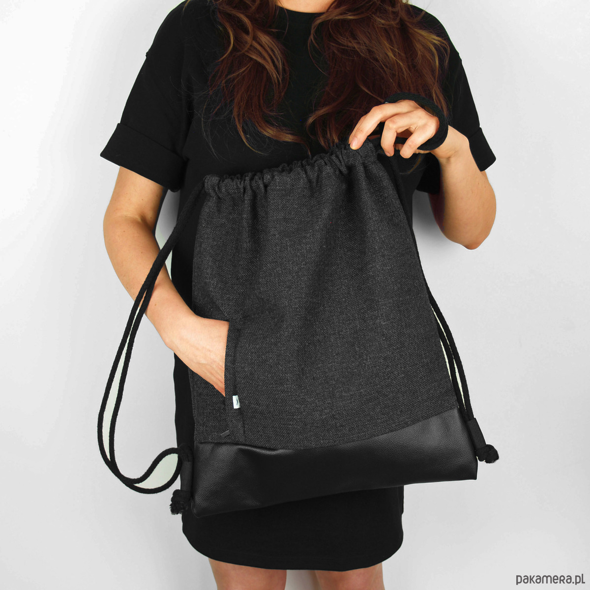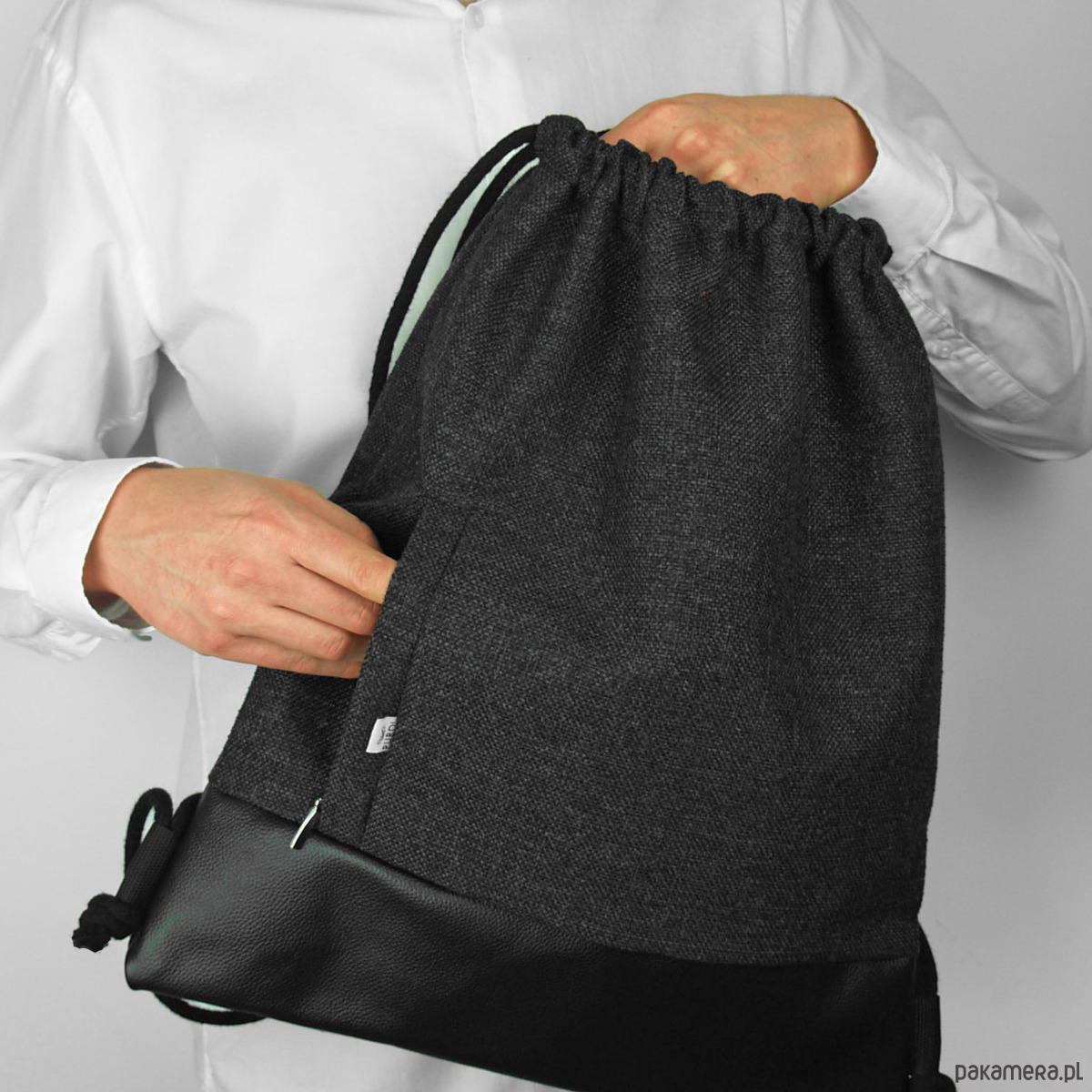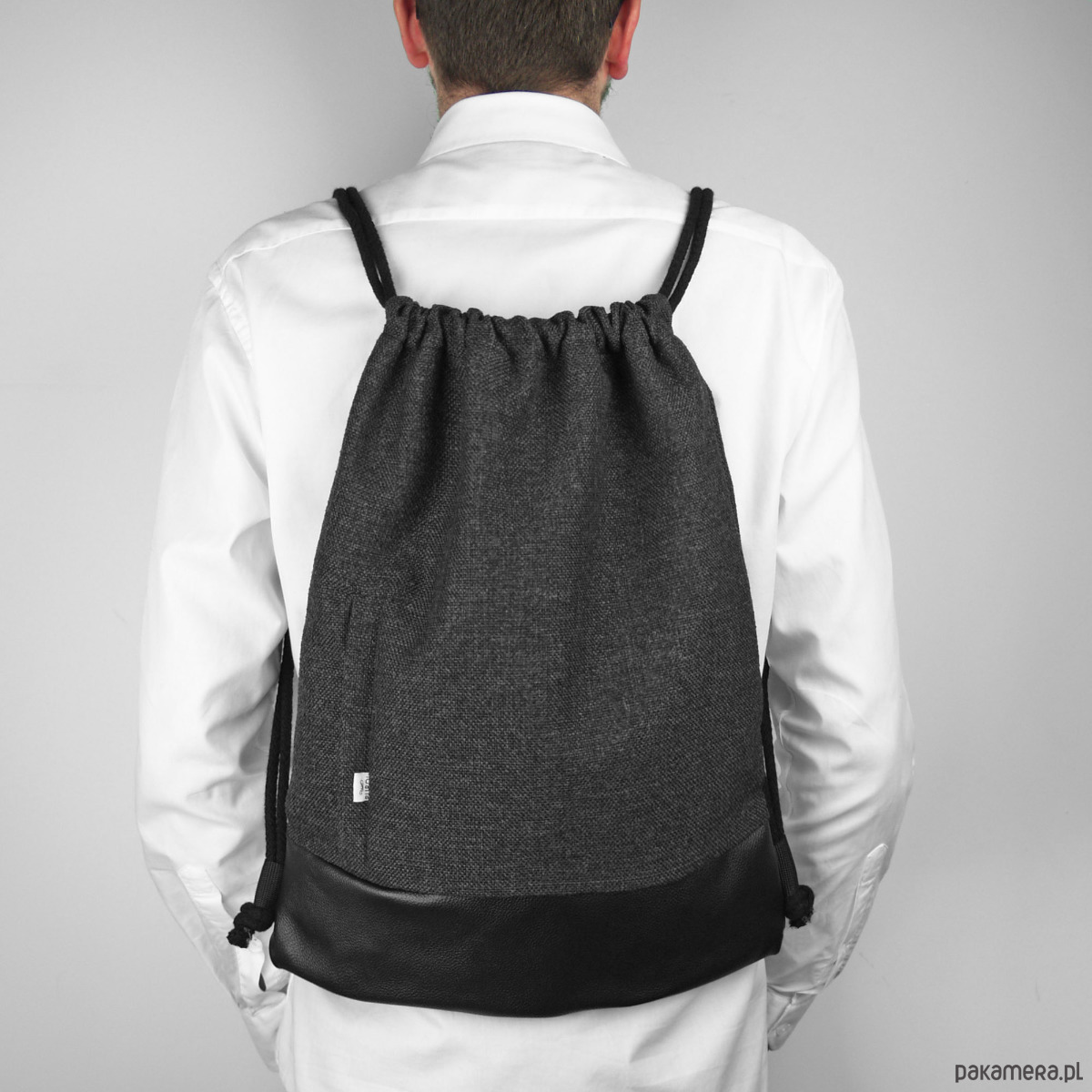 Miejski plecak worek z grubej, wytrzymałej tkaniny.