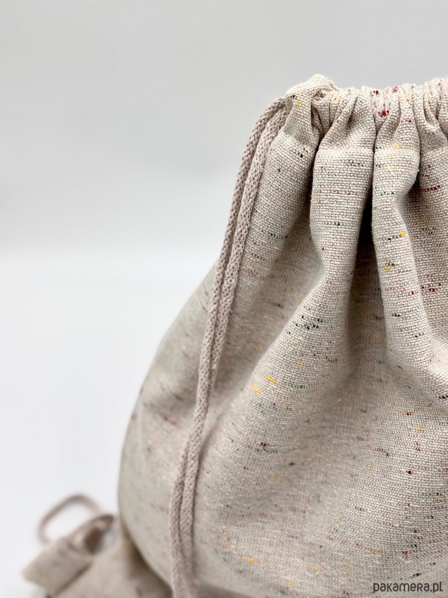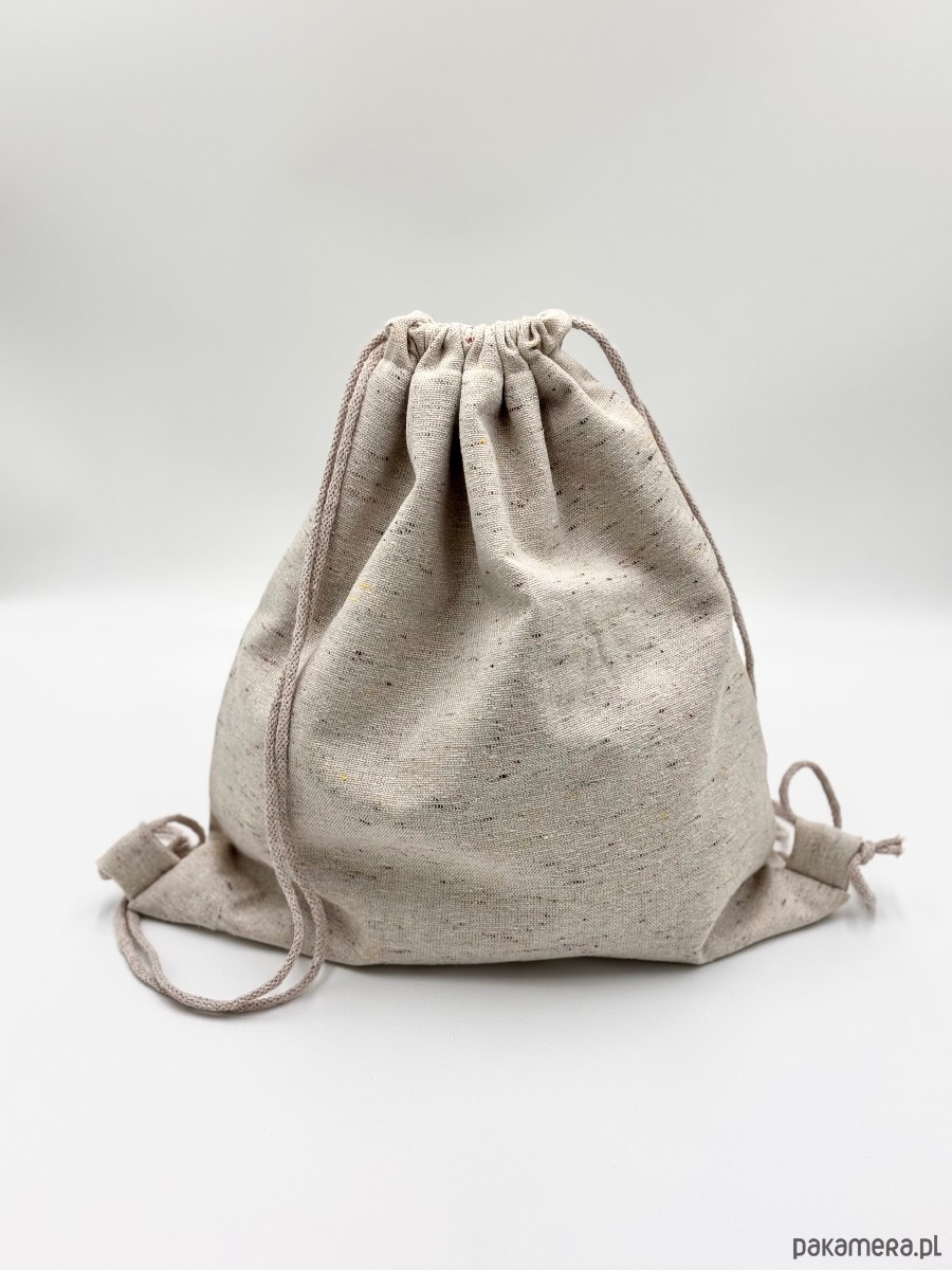 Workoplecak uszyty z miękkiej, nakrapianej tkaniny przypominającej płótno.
