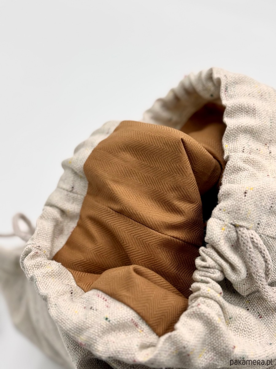 W środku worka znajduje się bawełniana podszewka w kolorze karmelowym, z kieszonką.
