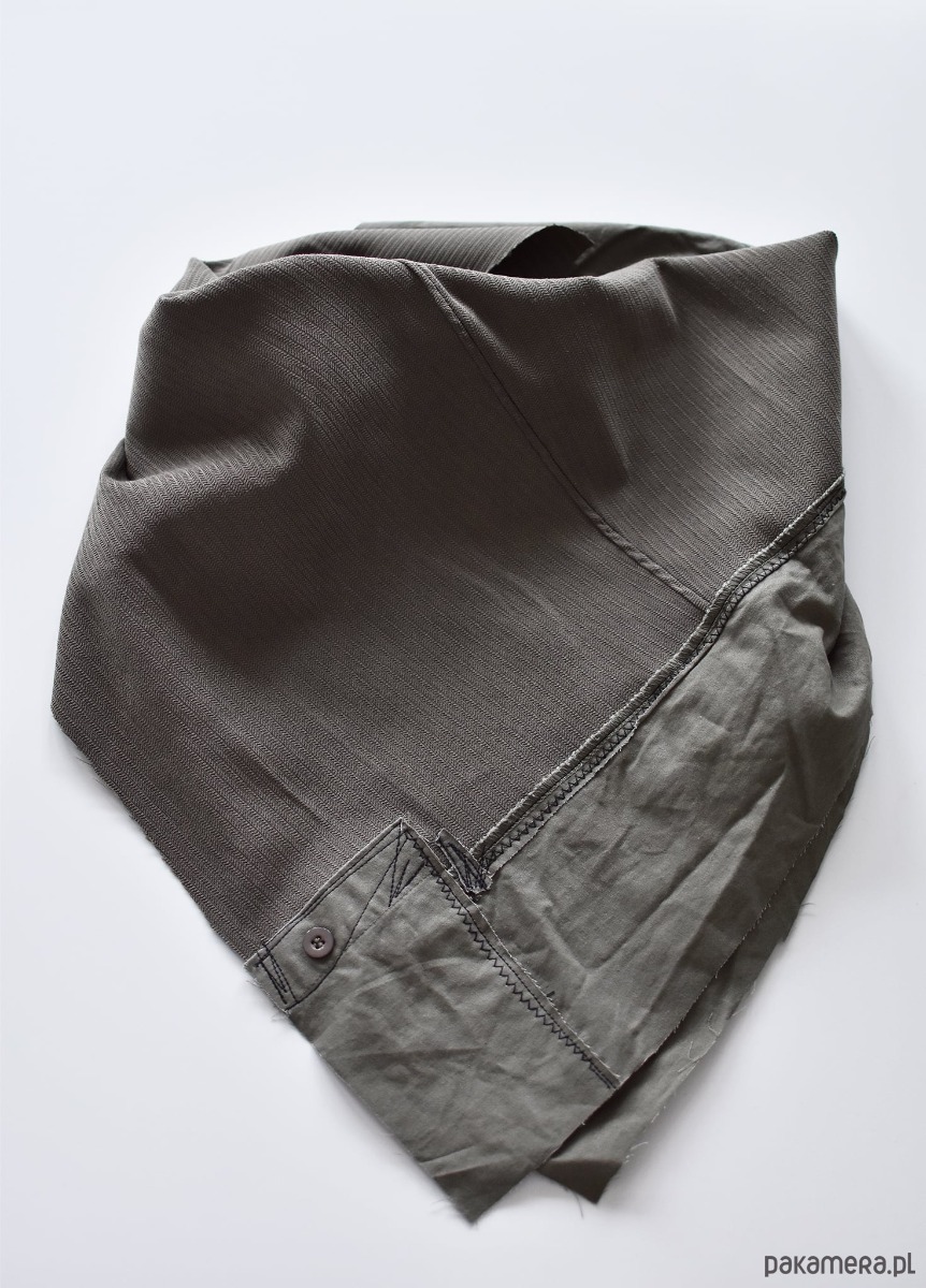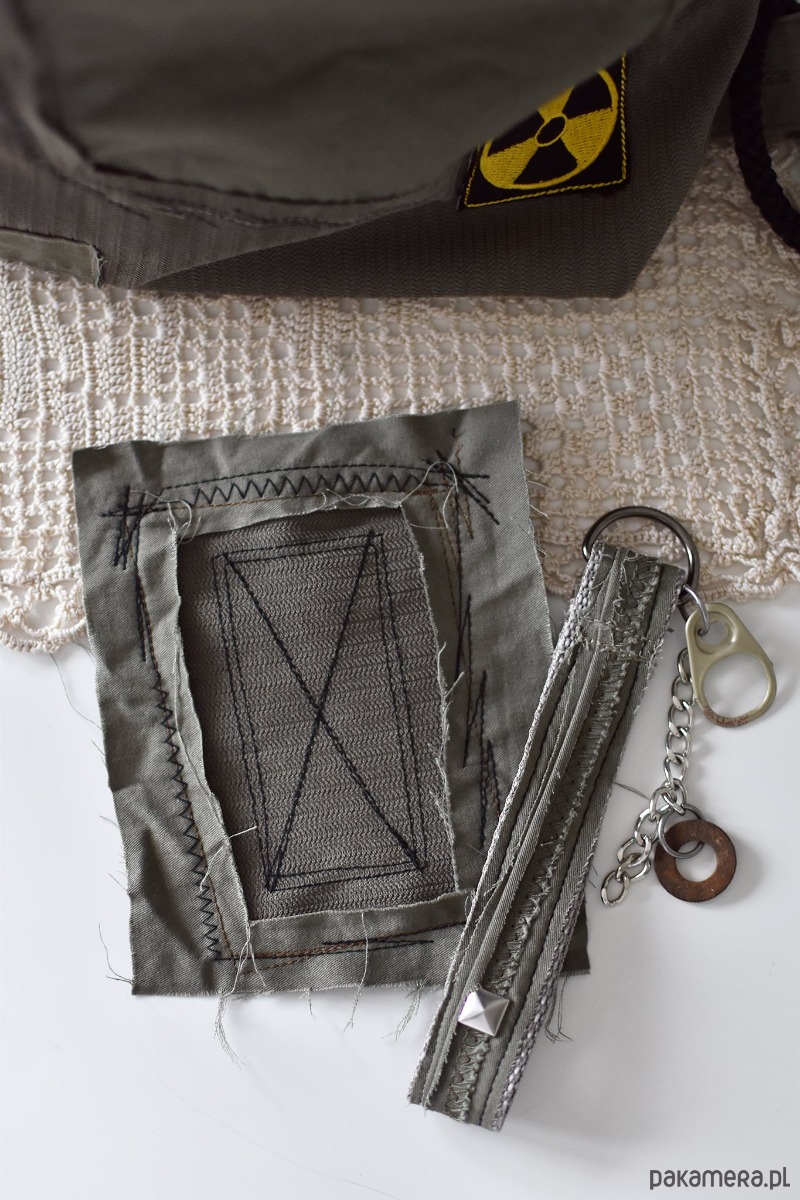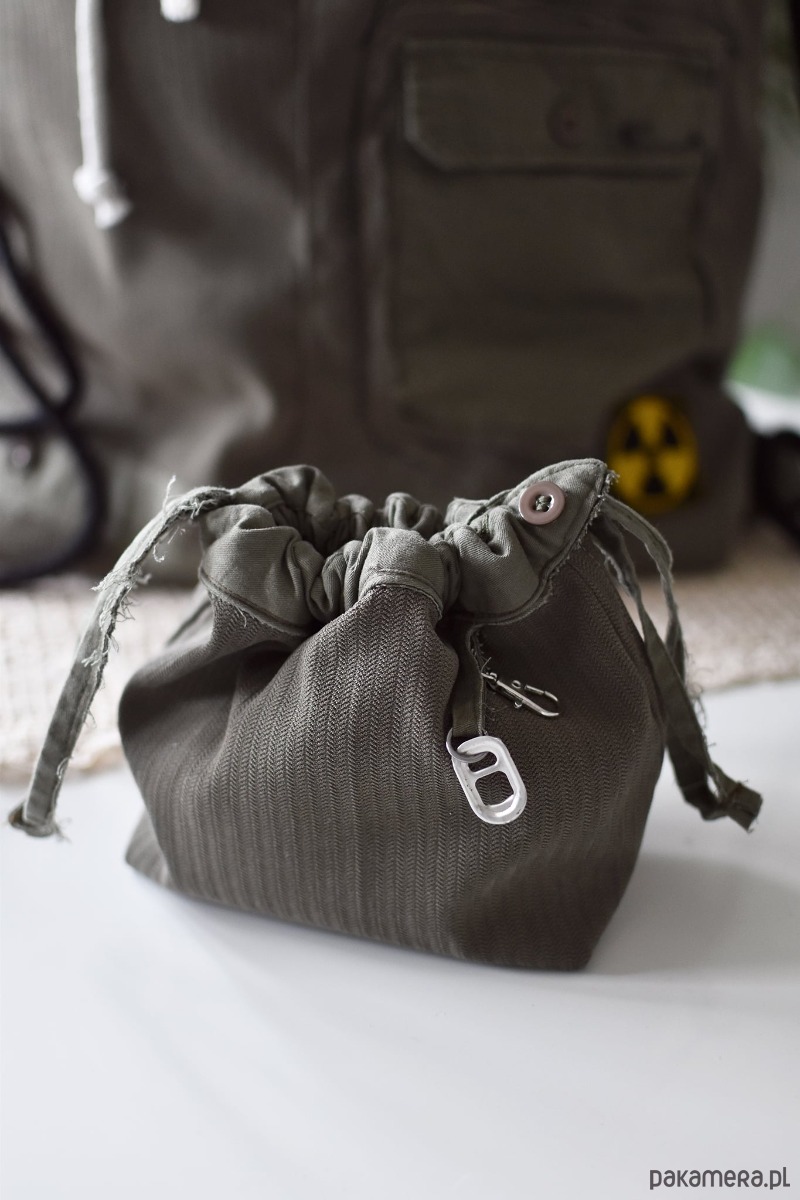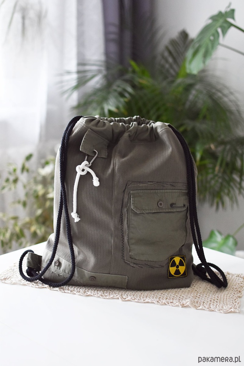 Ręcznie szyty plecak worek z materiałów z recyklingu z dodatkami. Jedyny taki egzemplarz.