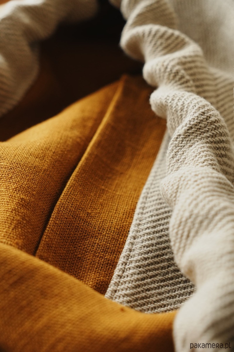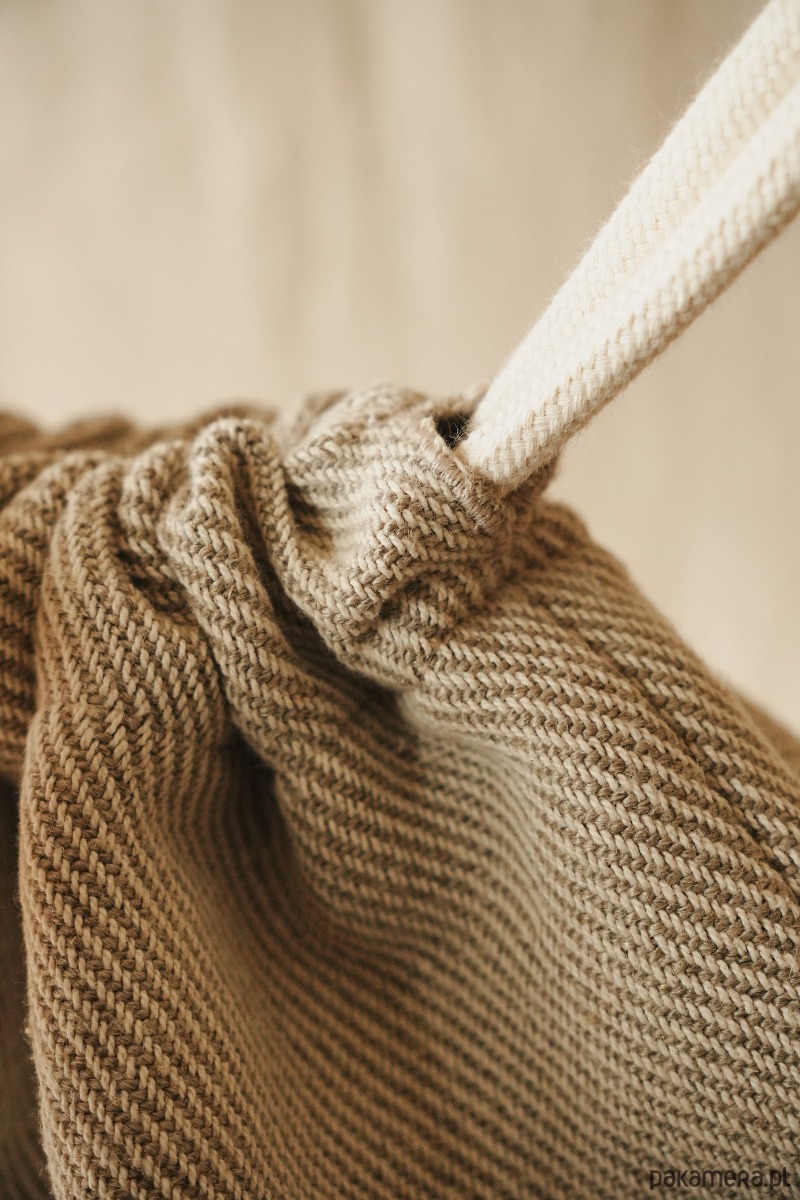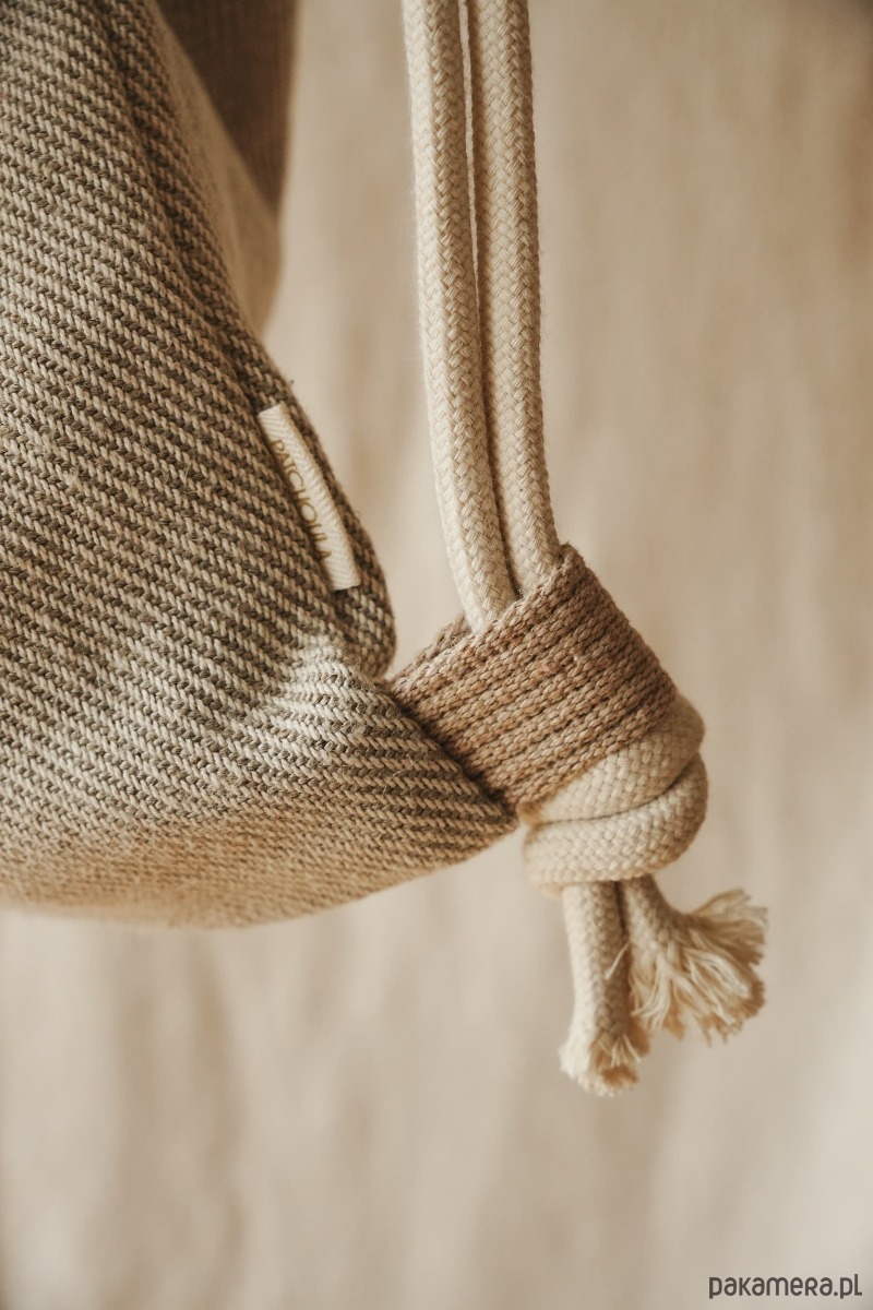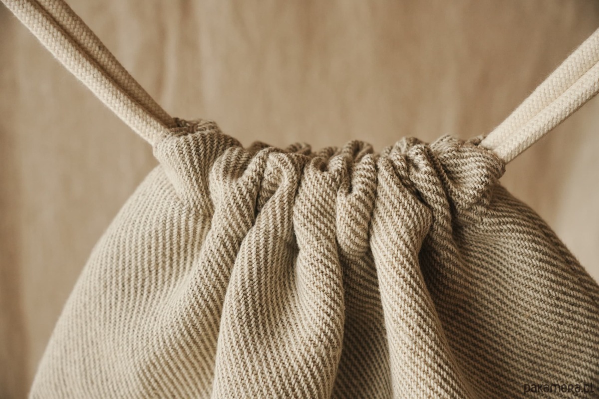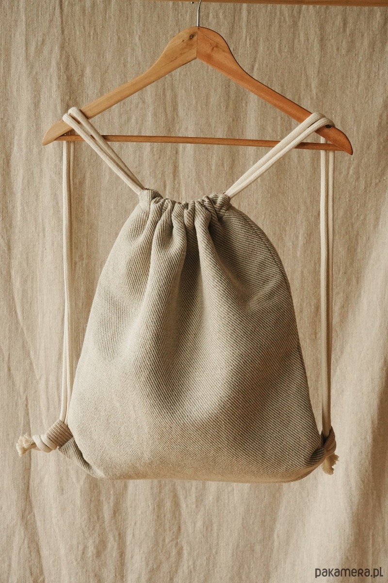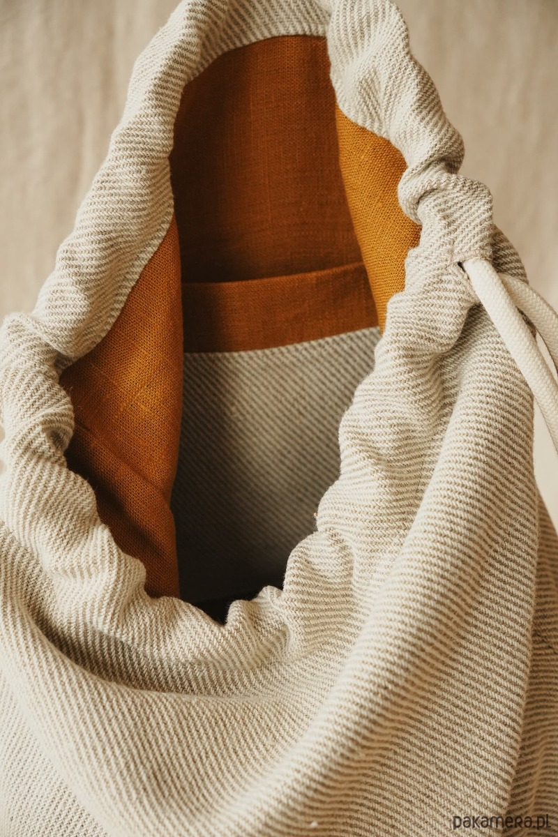 Na zewnątrz szara bawełniana tkanina w delikatną kratkę, wewnątrz podszewka z lnu w kolorze musztardowym i mała kieszonka na drobiazgi. Całość dopełniają bawełniane sznurki, dzięki którym można zamknąć plecak.
