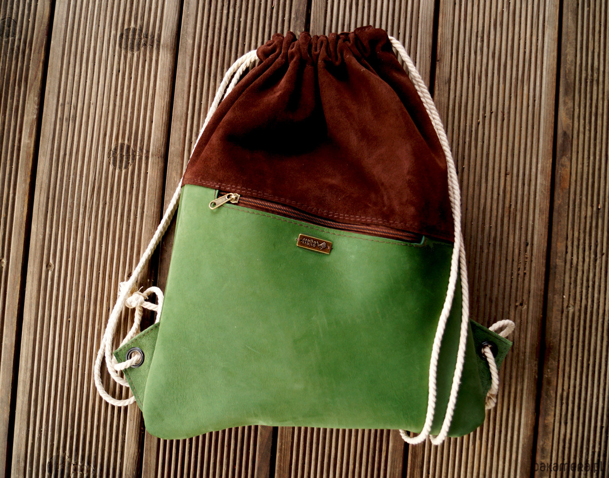 Bardzo wygodny, miękki, pojemny plecak typu WOREK uszyty ze skór naturalnych zamszowych, w kolorze brązu i zieleni.