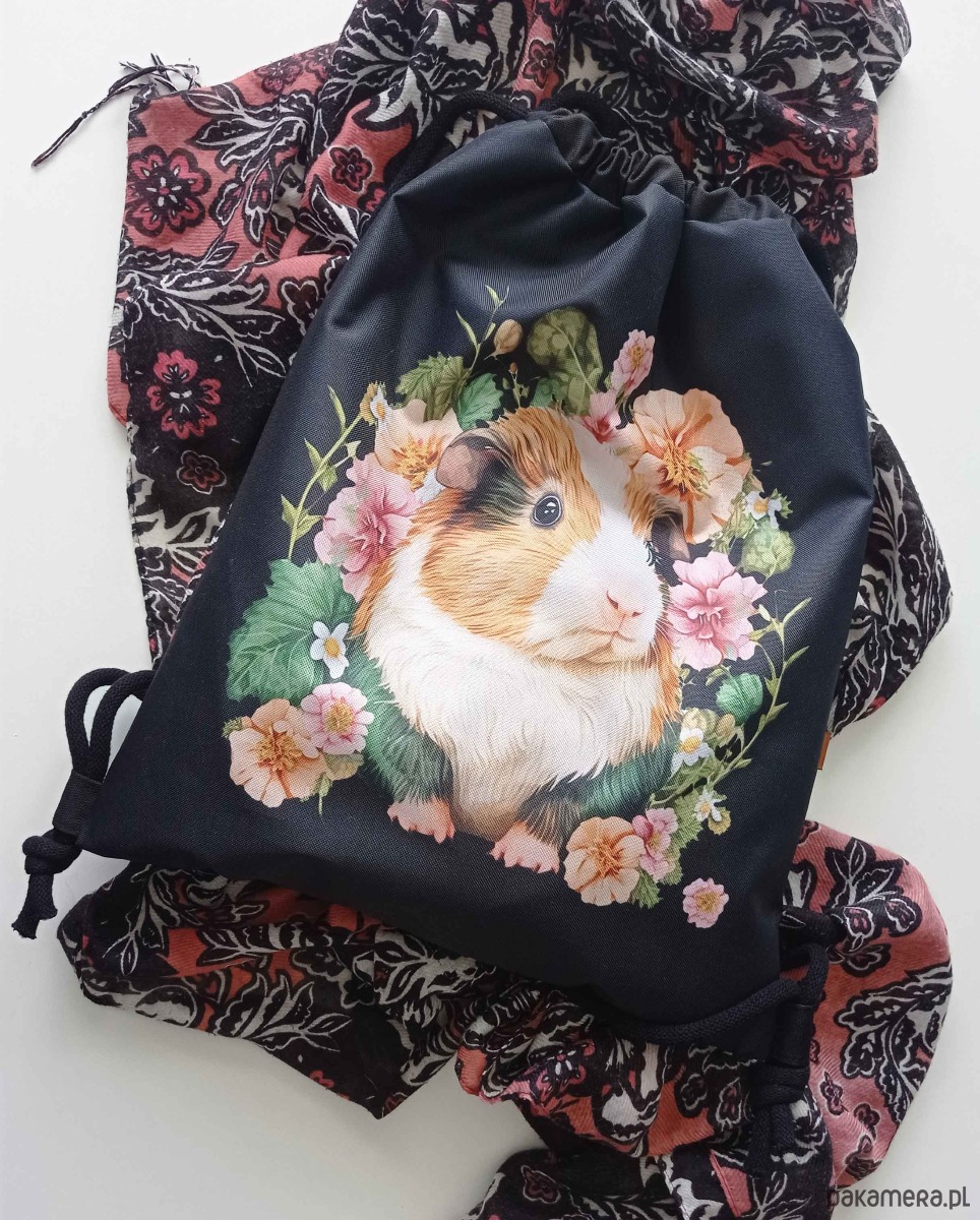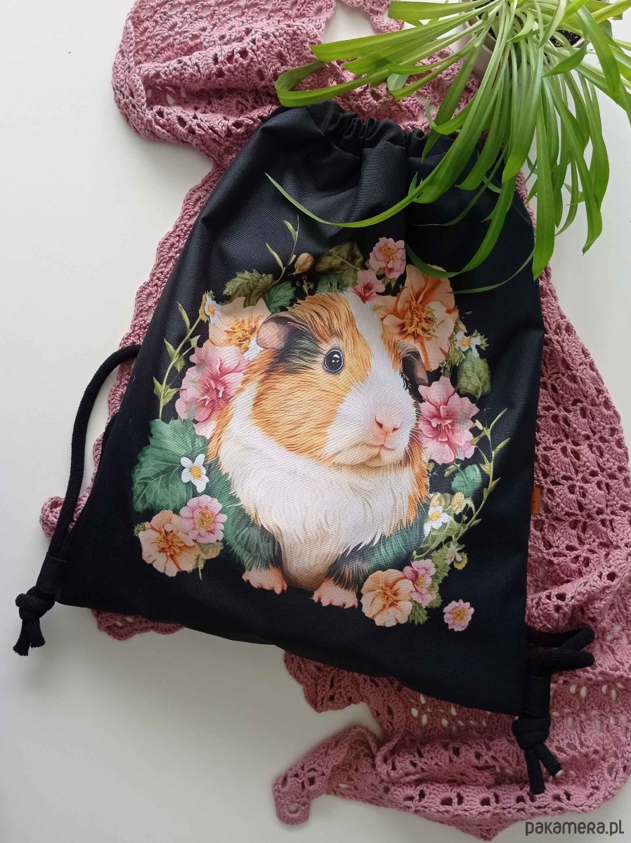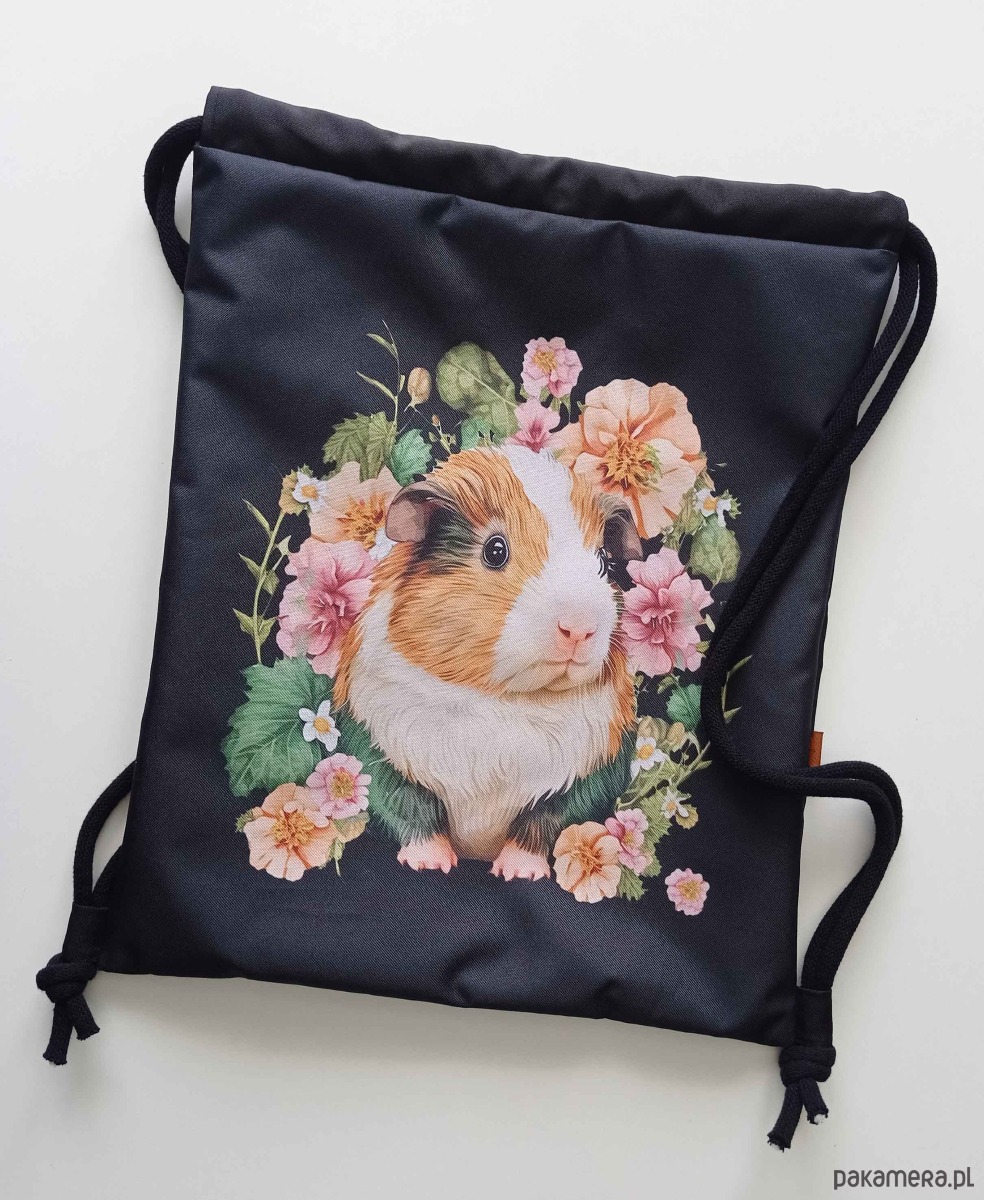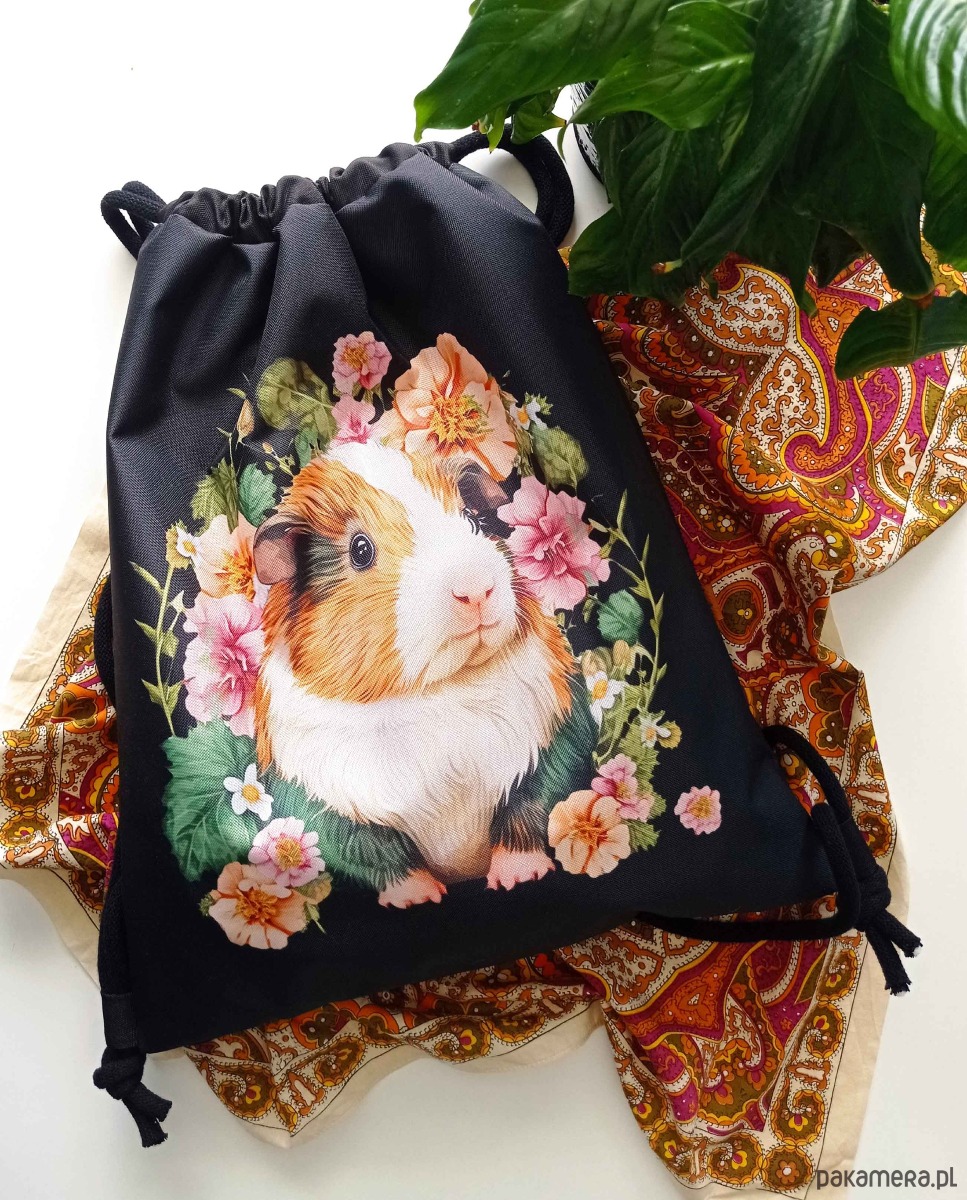 Piękny plecak-worek z tkaniny wodoodpornej z motywem uroczej świnki morskiej w kwiatach.