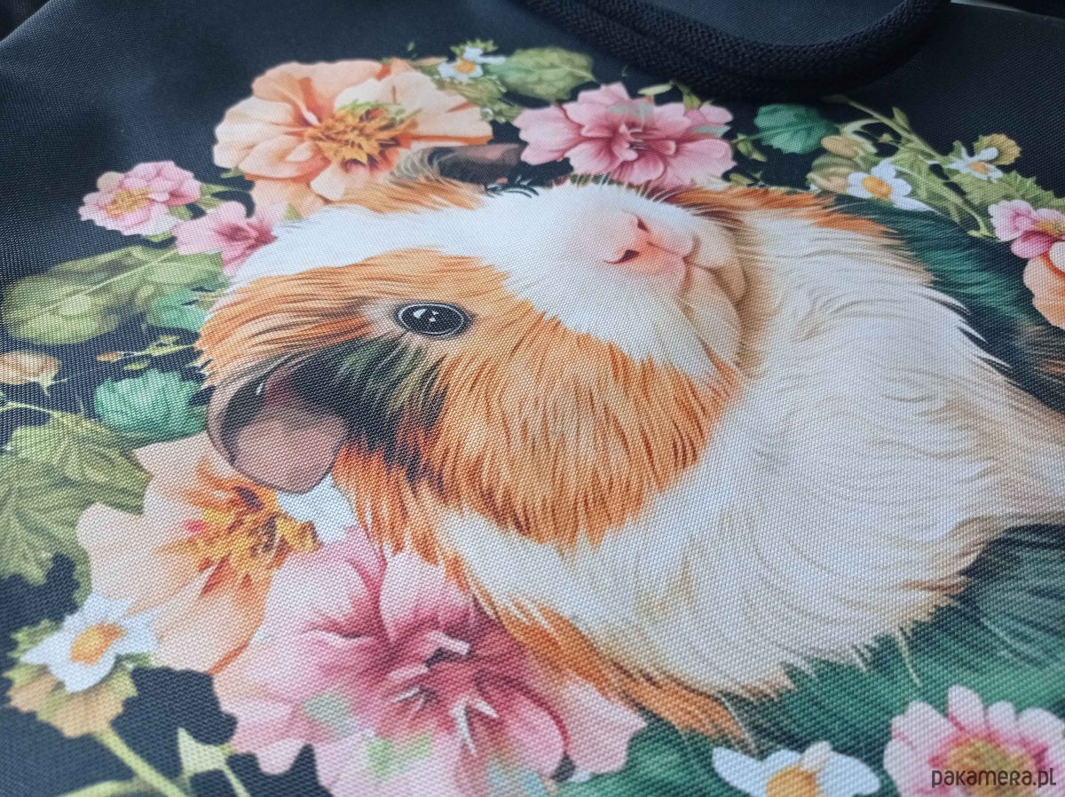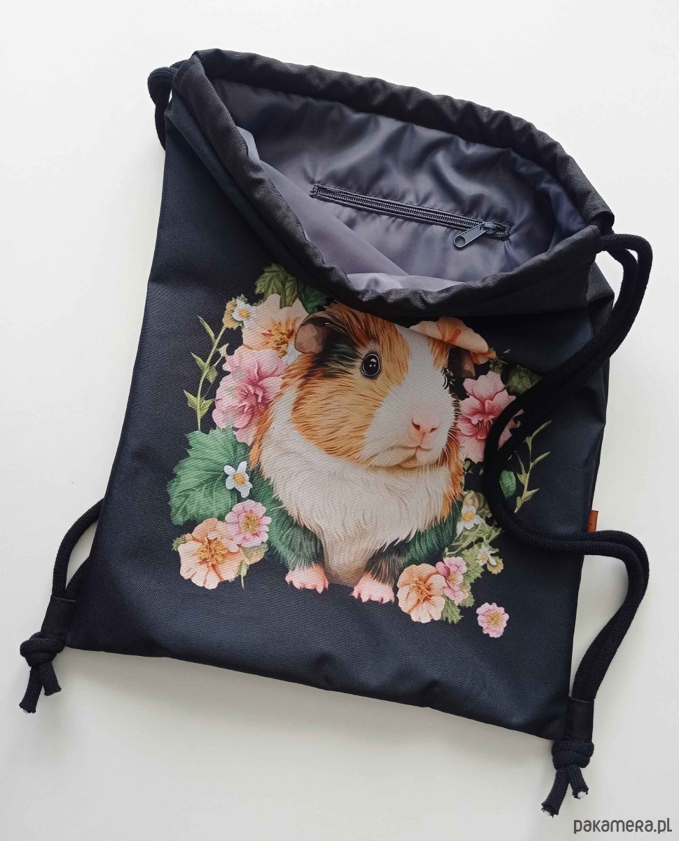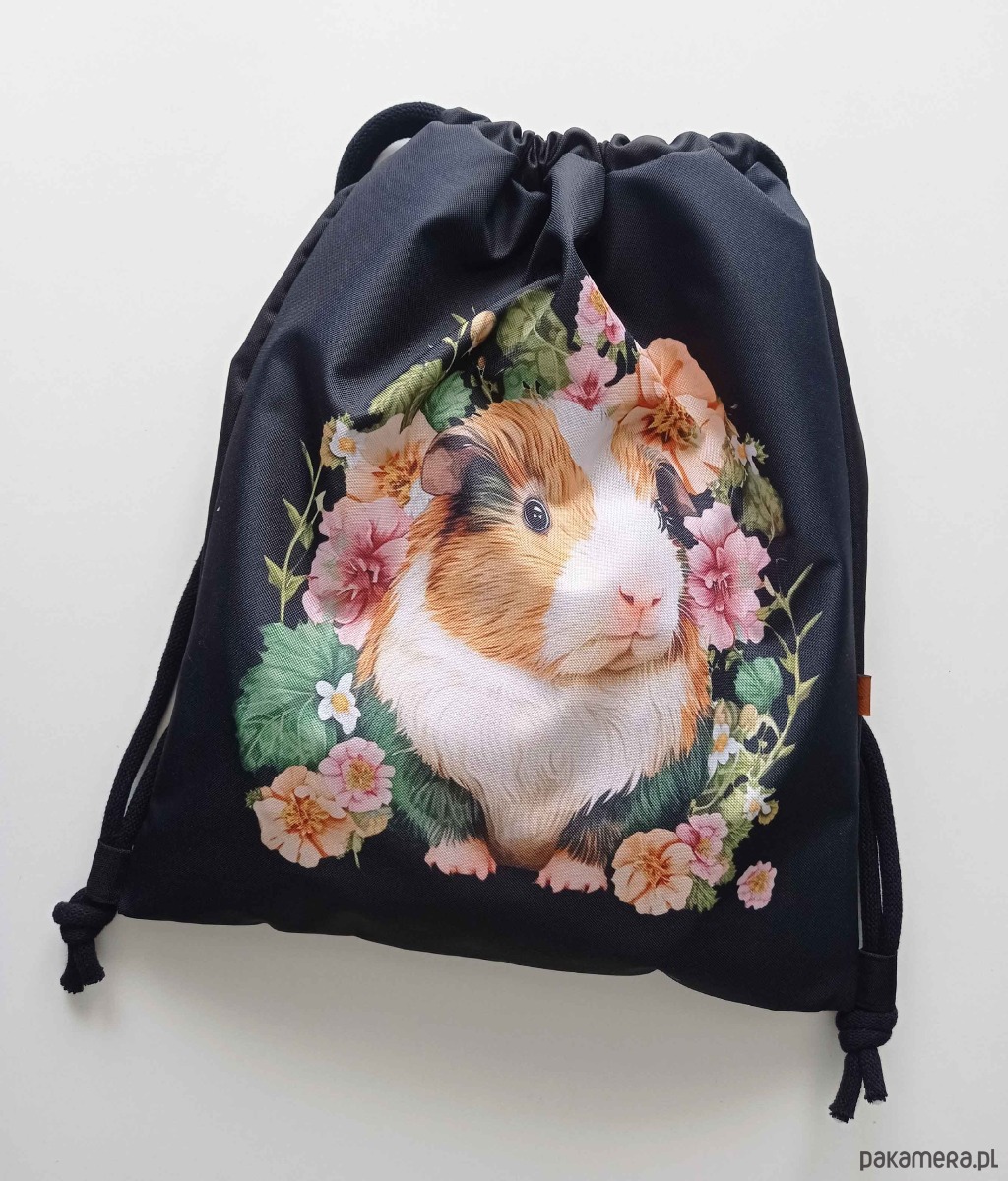 Piękny plecak-worek z tkaniny wodoodpornej z motywem uroczej świnki morskiej w kwiatach.
