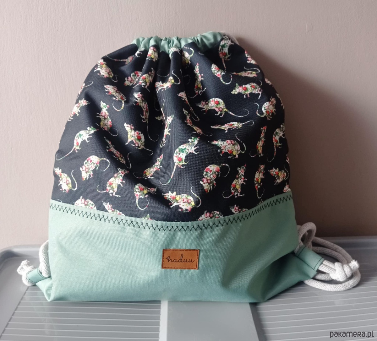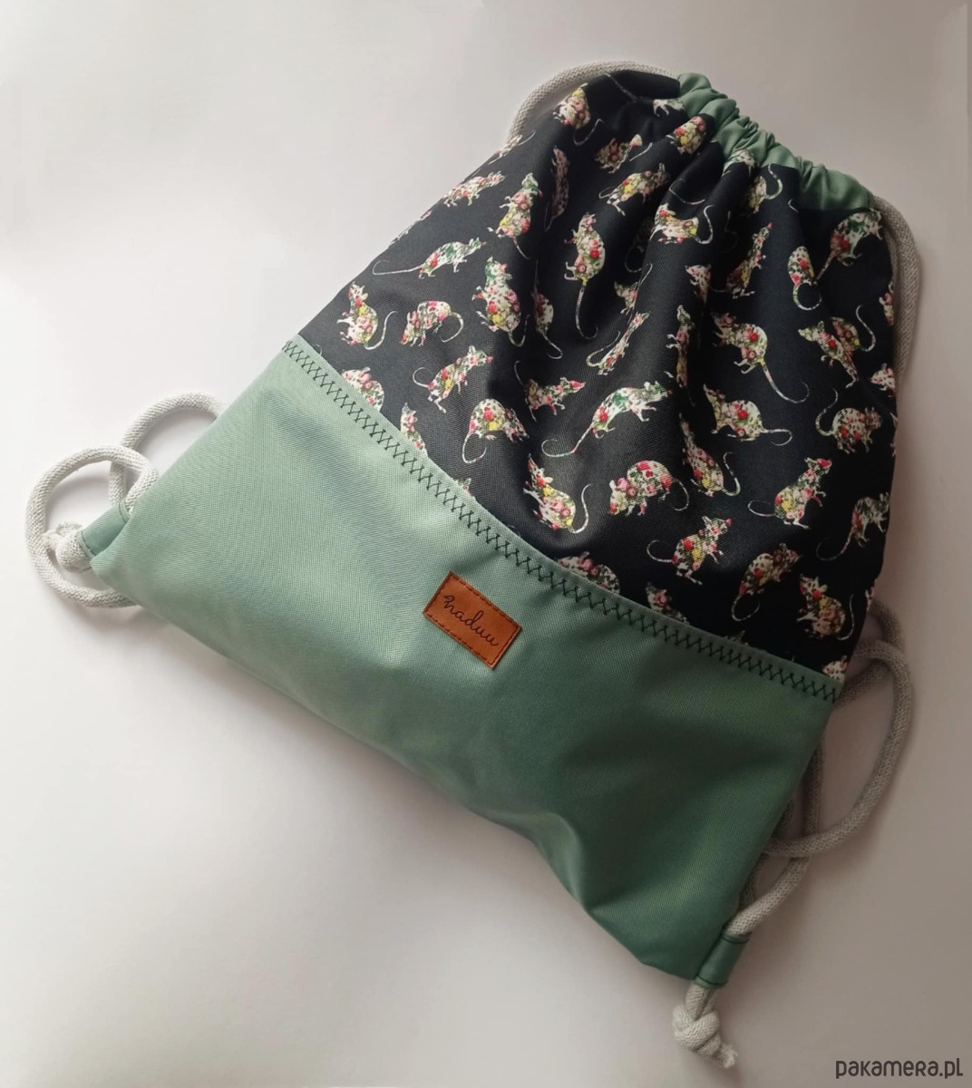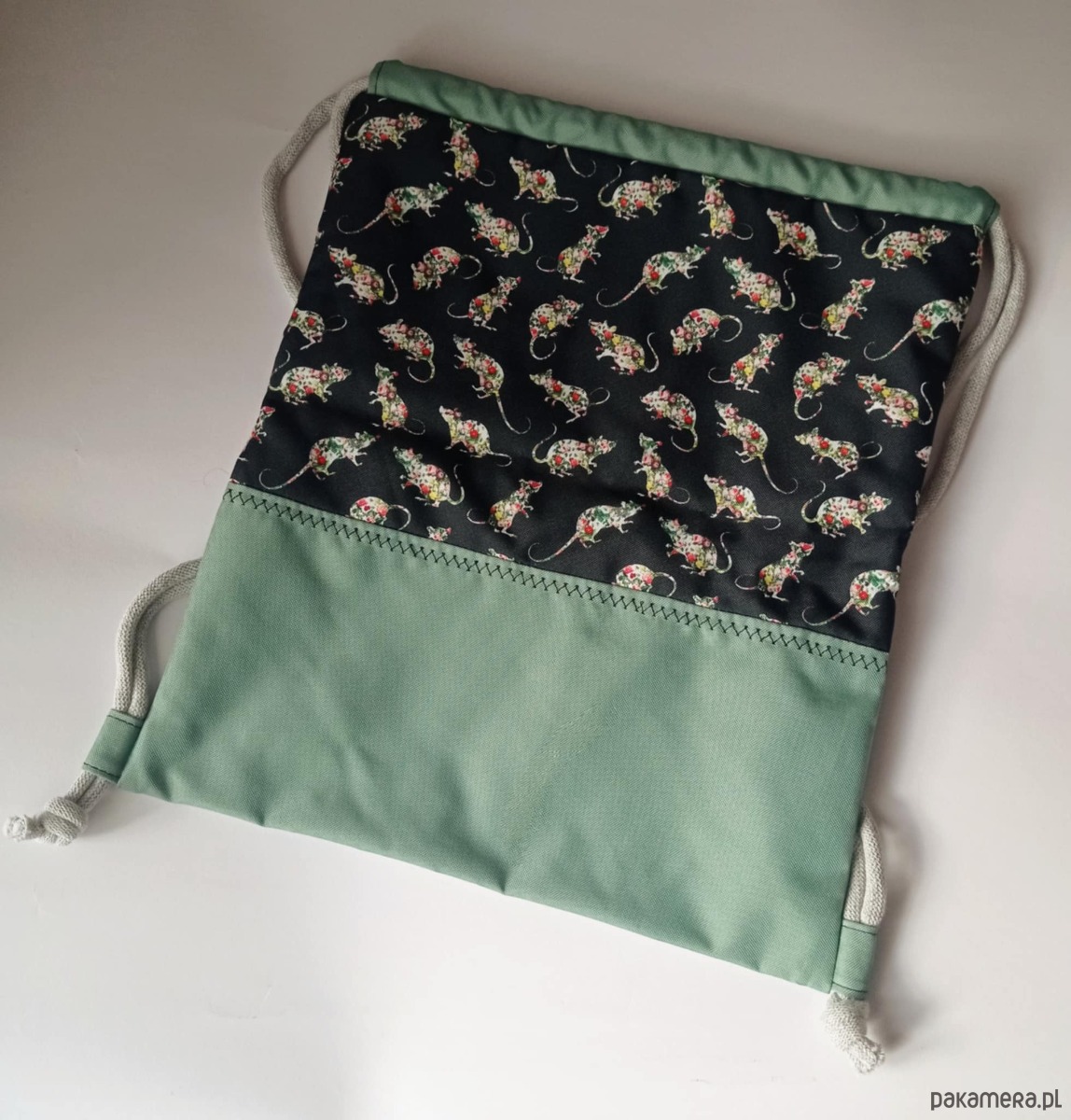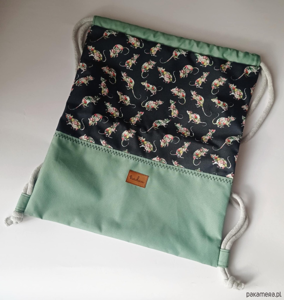 Piękny plecak-worek z tkanin wodoodpornych z motywem szczurów w kwiatowy wzór.