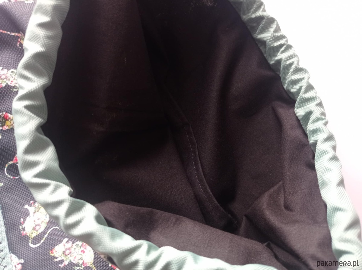 Plecak bardzo pojemny, z otwartą kieszenią wewnętrzną. Wewnątrz czarna, bawełniana, gładka podszewka. Sznurki szare.