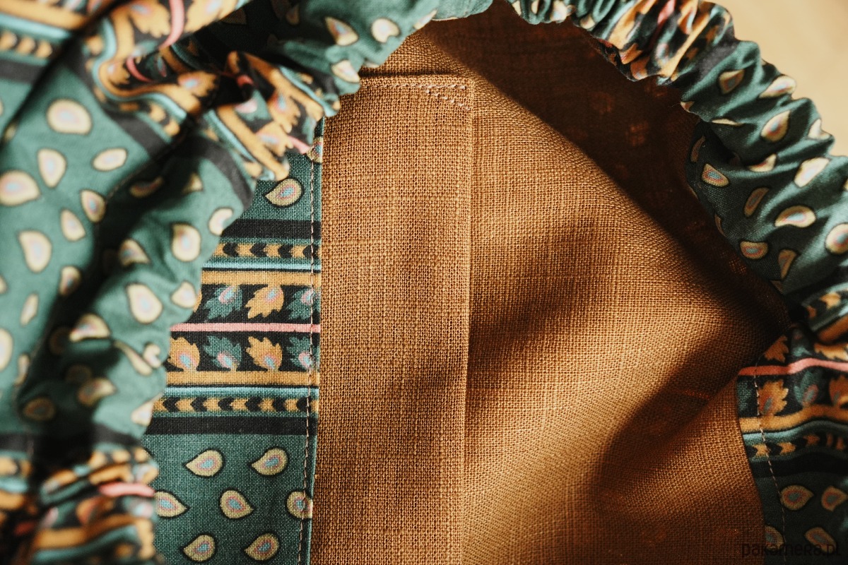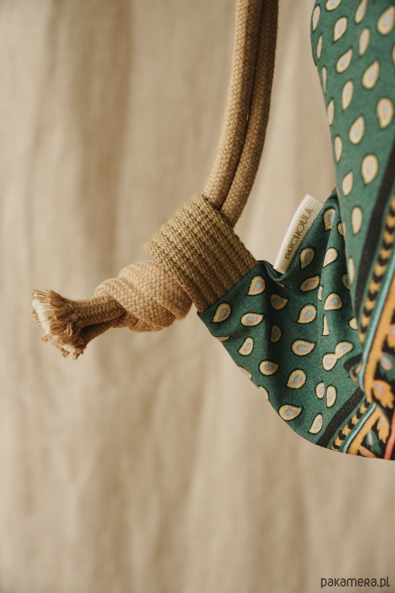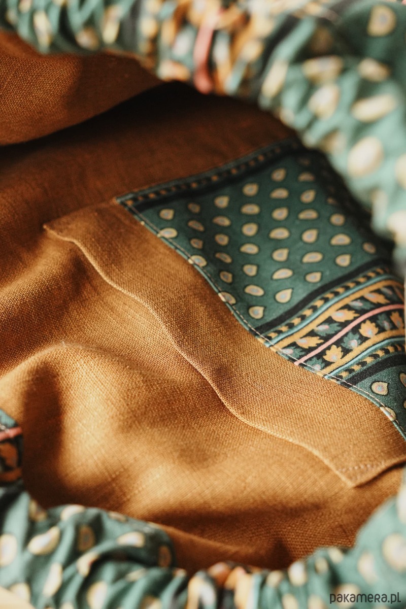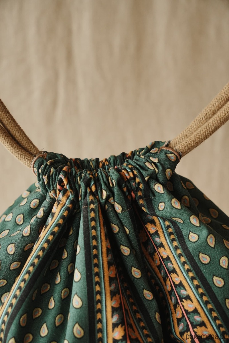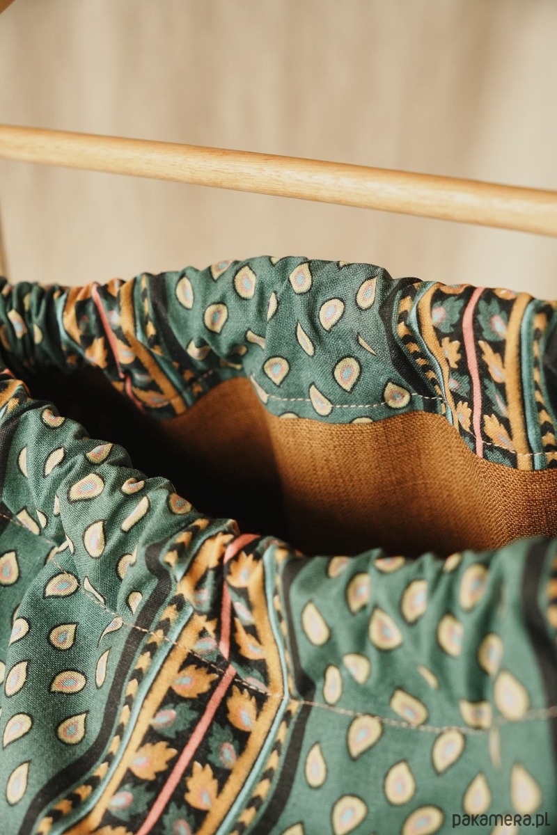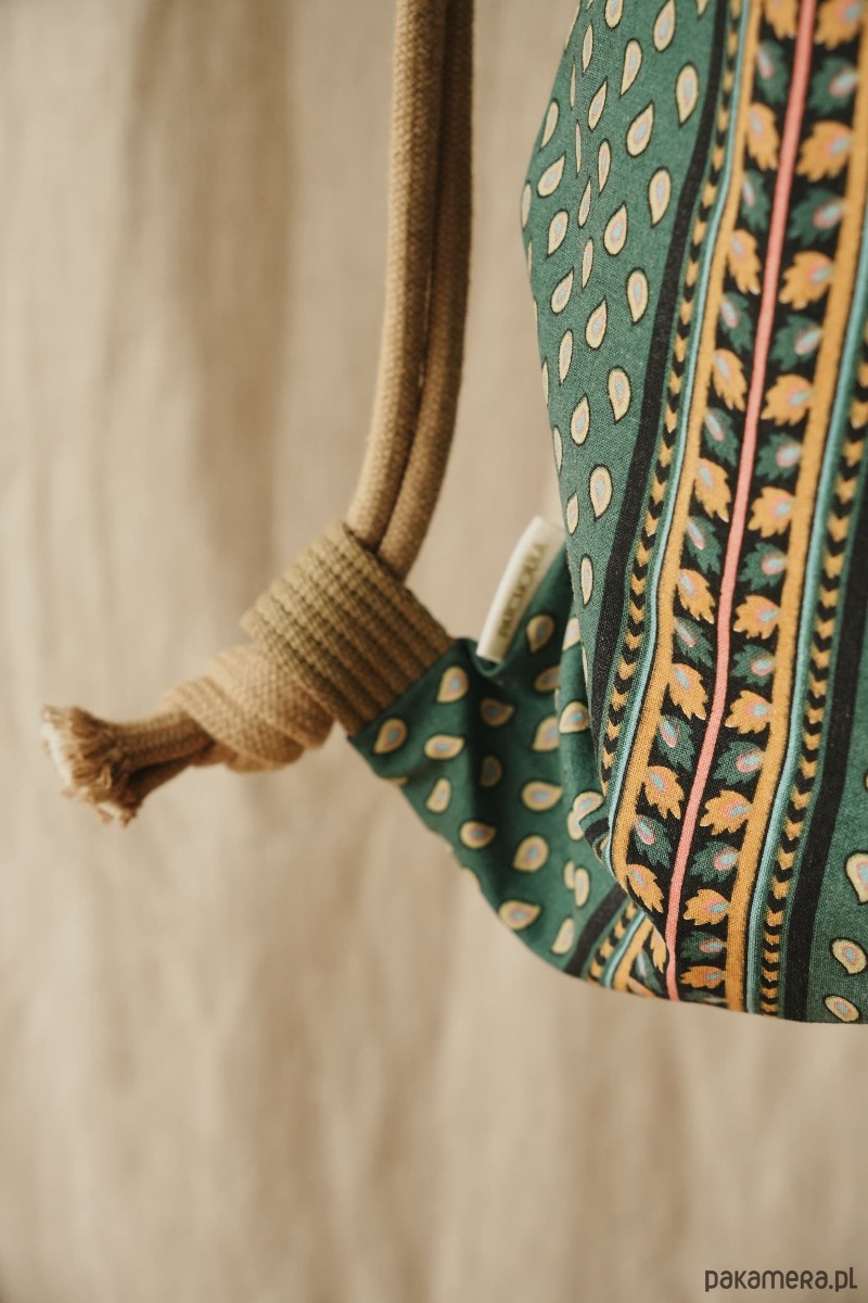Na zewnątrz unikatowa, bawełniana tkanina, wewnątrz podszewka z lnu w kolorze musztardowym i mała kieszonka na drobiazgi. Całość dopełniają bawełniane, sznurki, dzięki którym można zamknąć plecak.