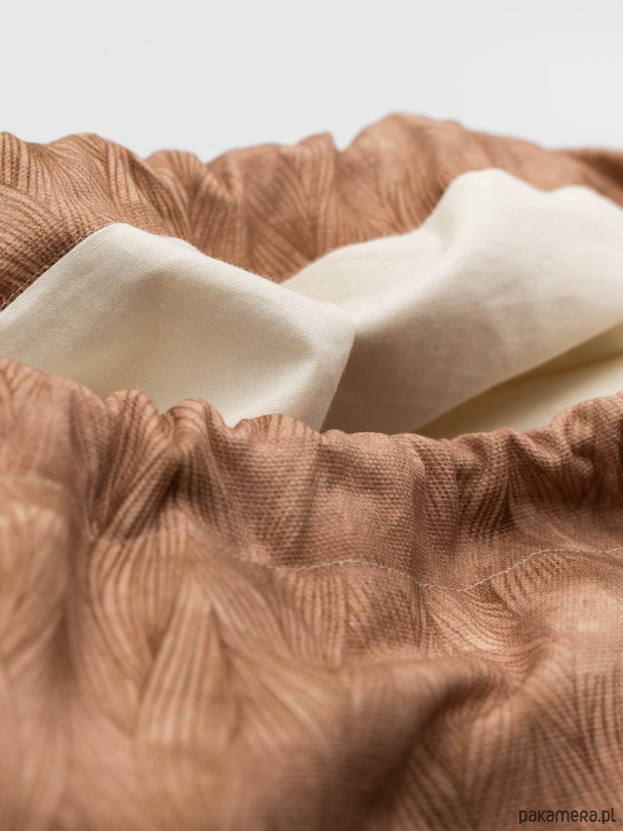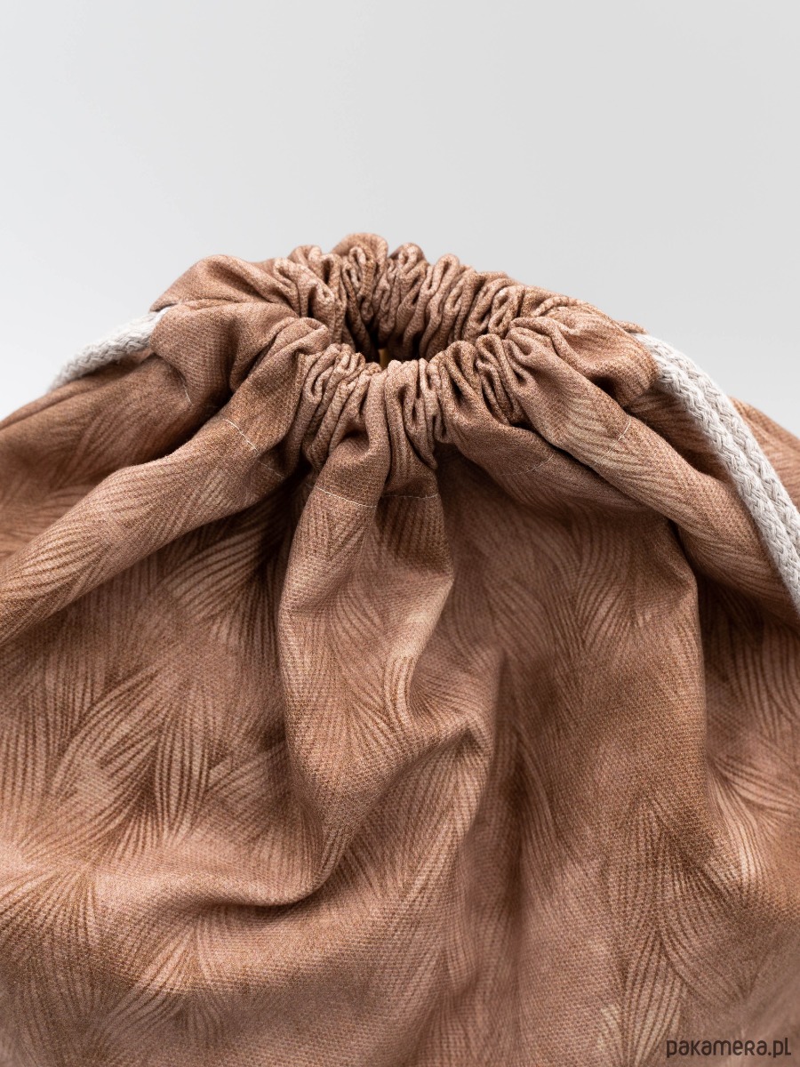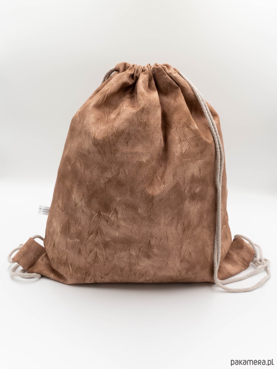 Workoplecak uszyty z tkaniny w kolorze ciemnego beżu, wzór w warkocze.
