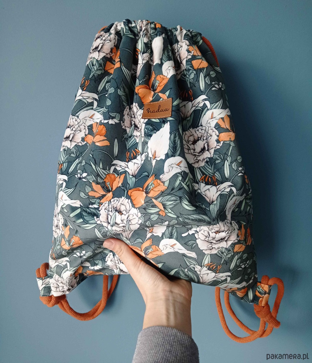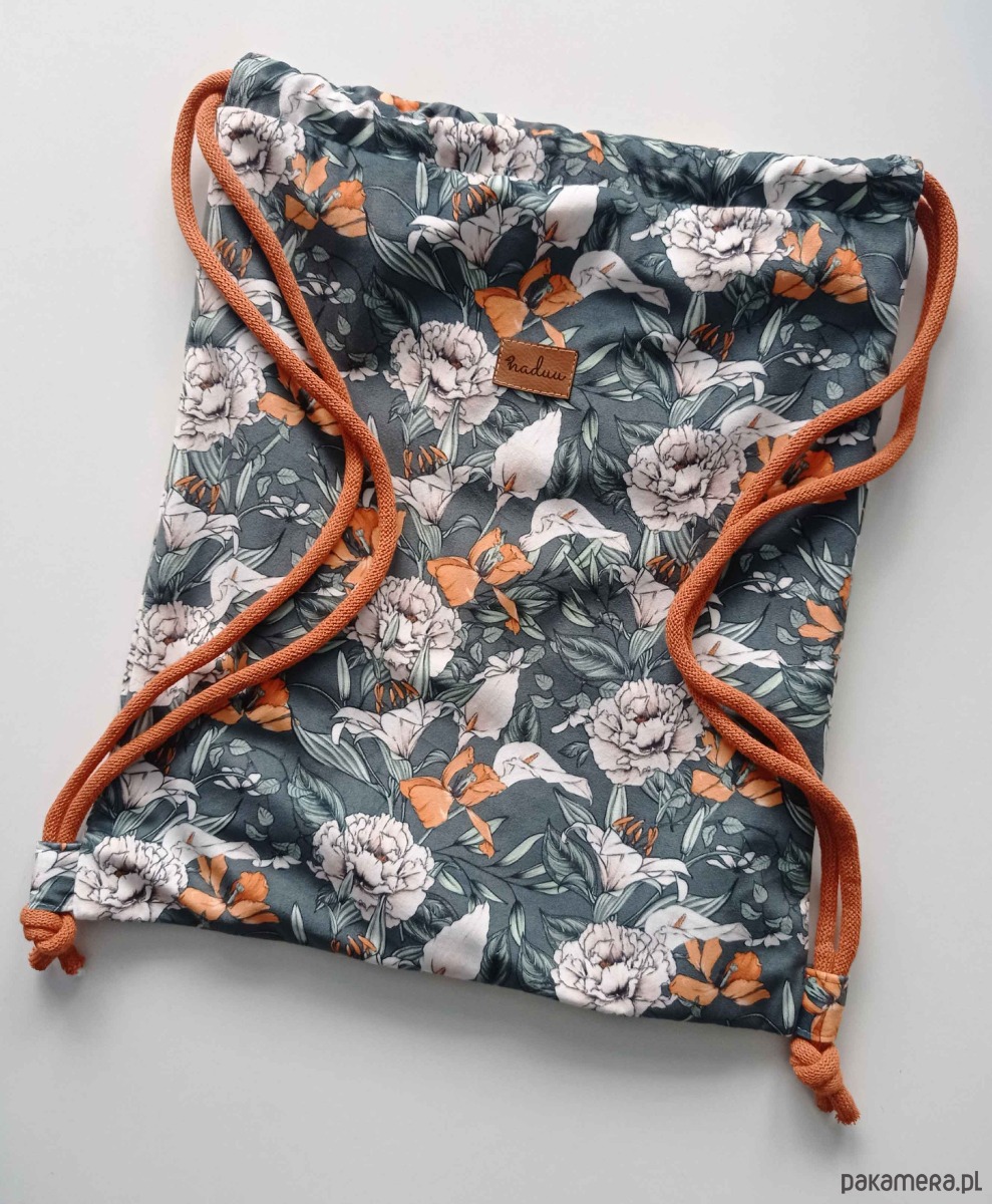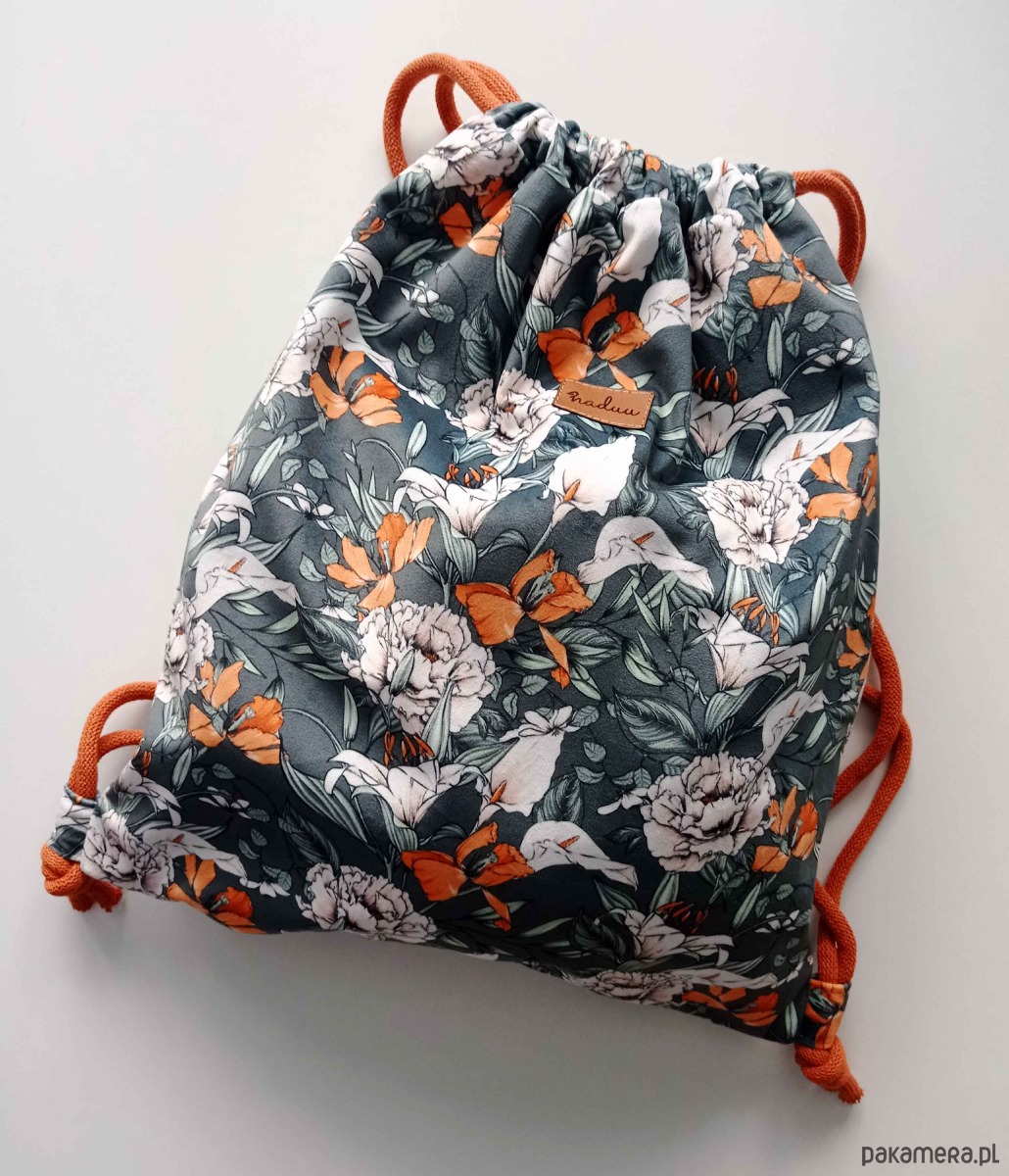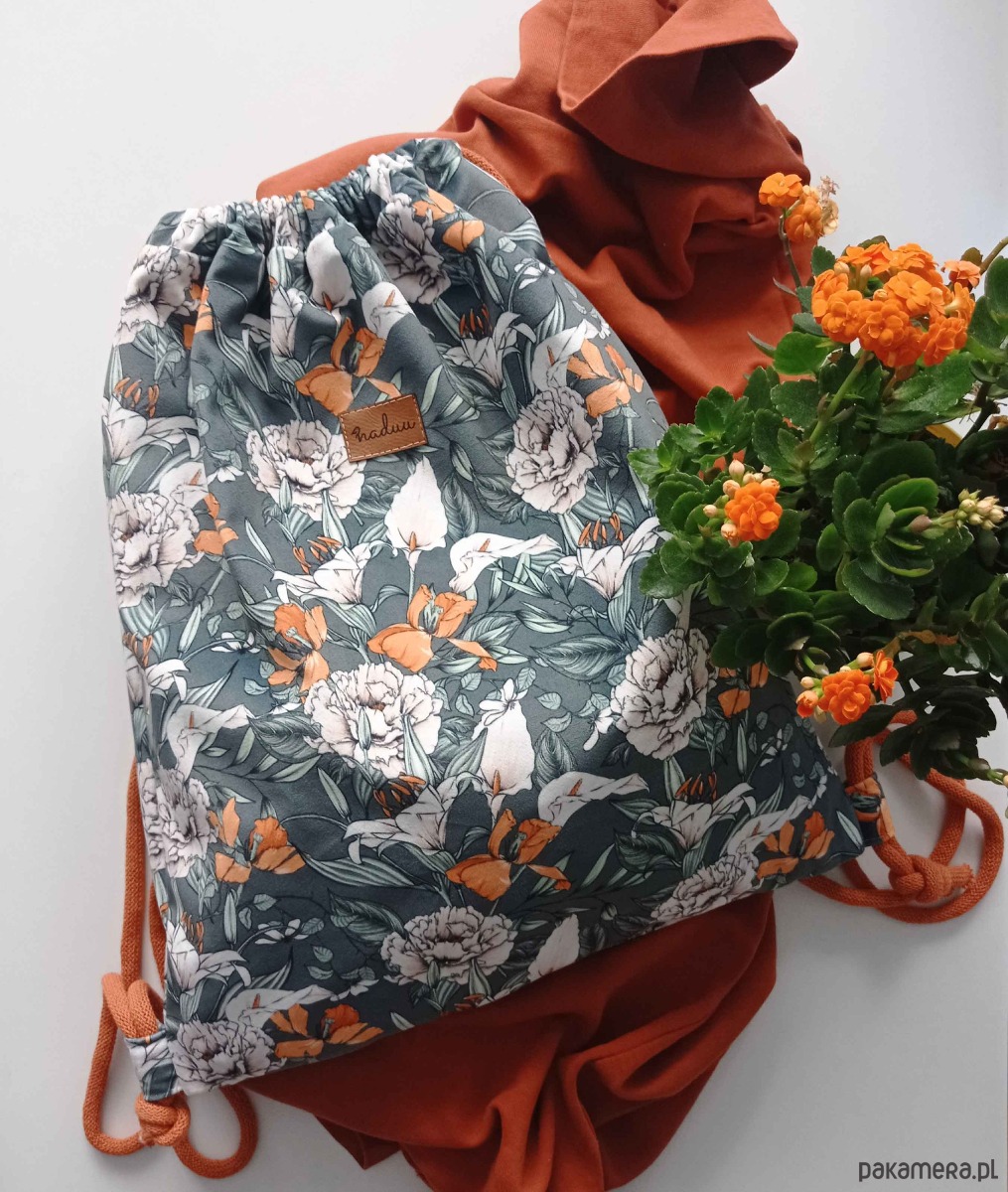 Piękny plecak-worek z weluru z motywem kwiatów.