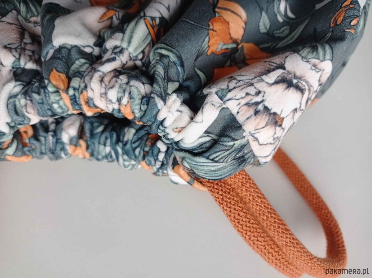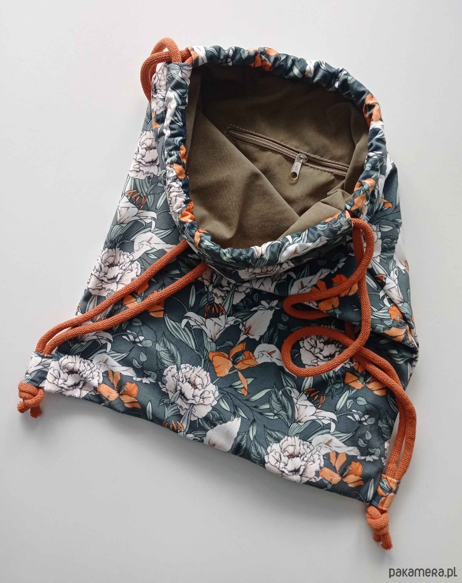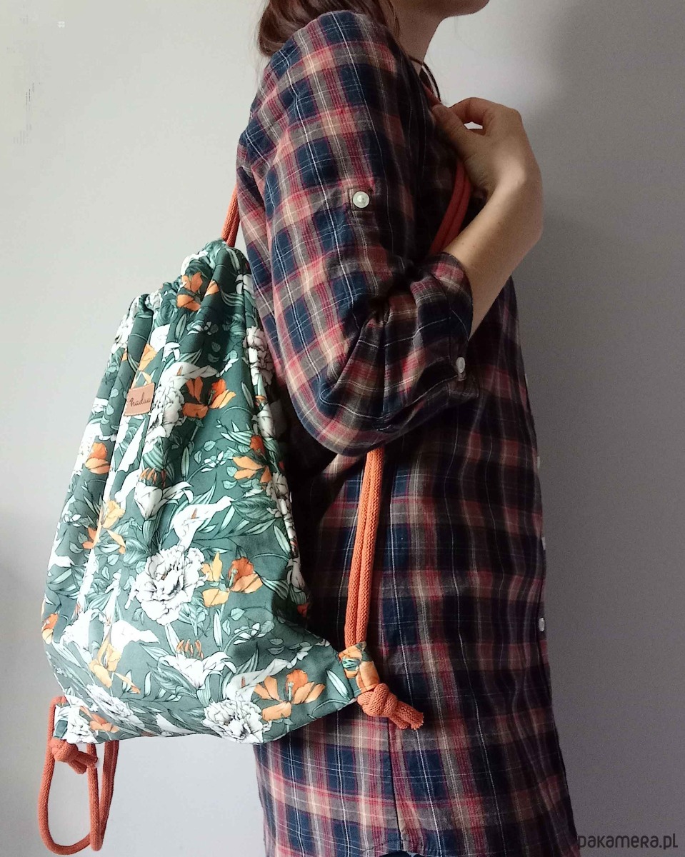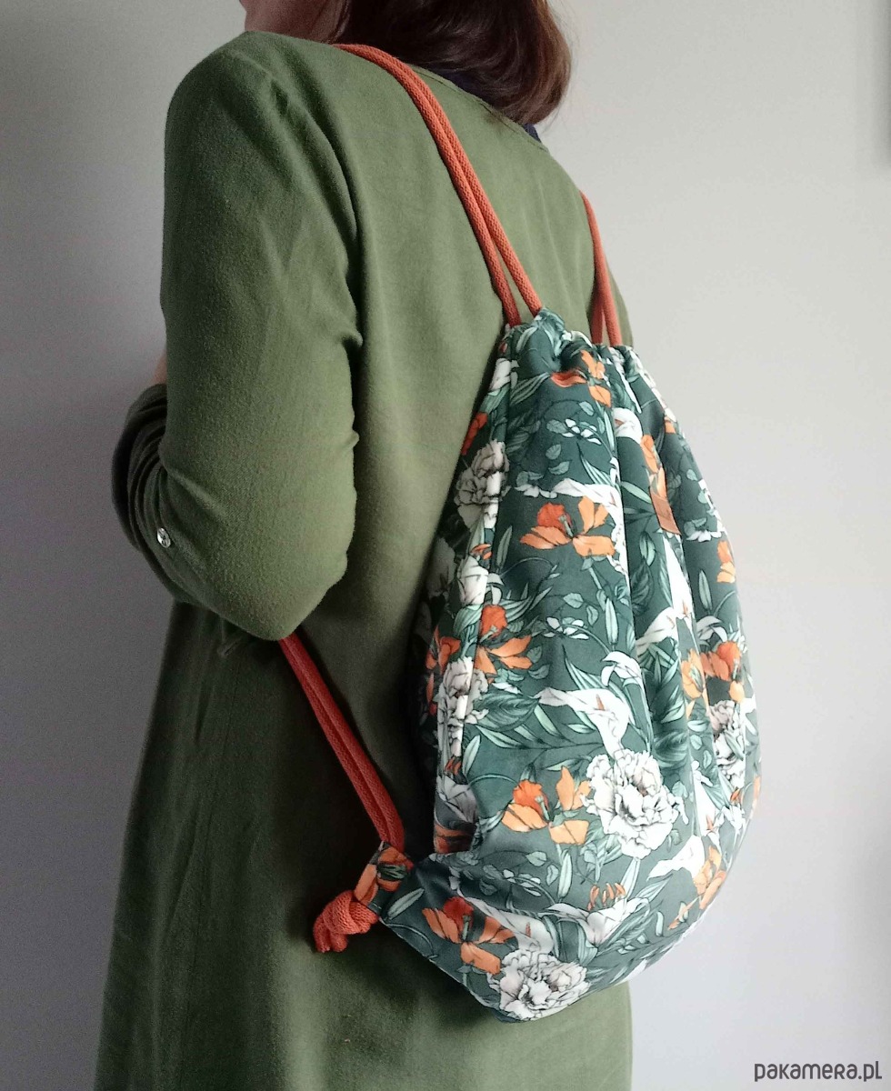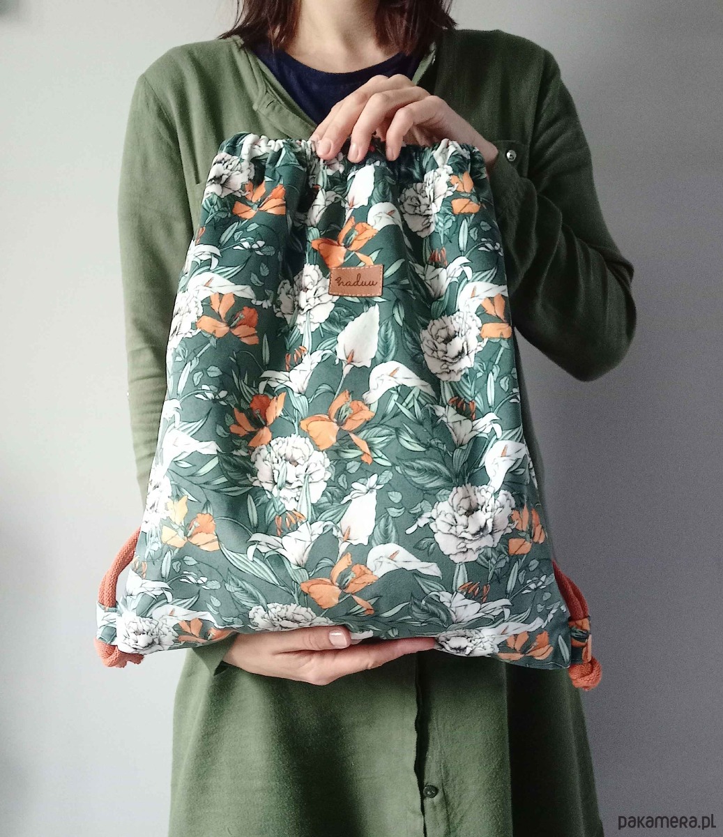 Piękny plecak-worek z weluru z motywem kwiatów.