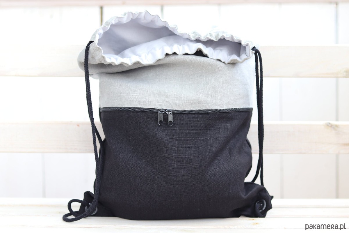 Plecak/worek wykonany z lnu w kolorze jasnoszarym i czarnym z kieszenią na zamek. Rączki zrobione z bawełnianego sznurka, na dole przechodzą przez metalowe oczka. W środku znajduje się szara bawełniana podszewka. Zewnętrzna kieszeń zamykana na zamek błyskawiczny. Produkt jest już wstępnie wyprany (dekatyzowany). Oznacza to, że w następnym praniu tkanina nie będzie się kurczyć.