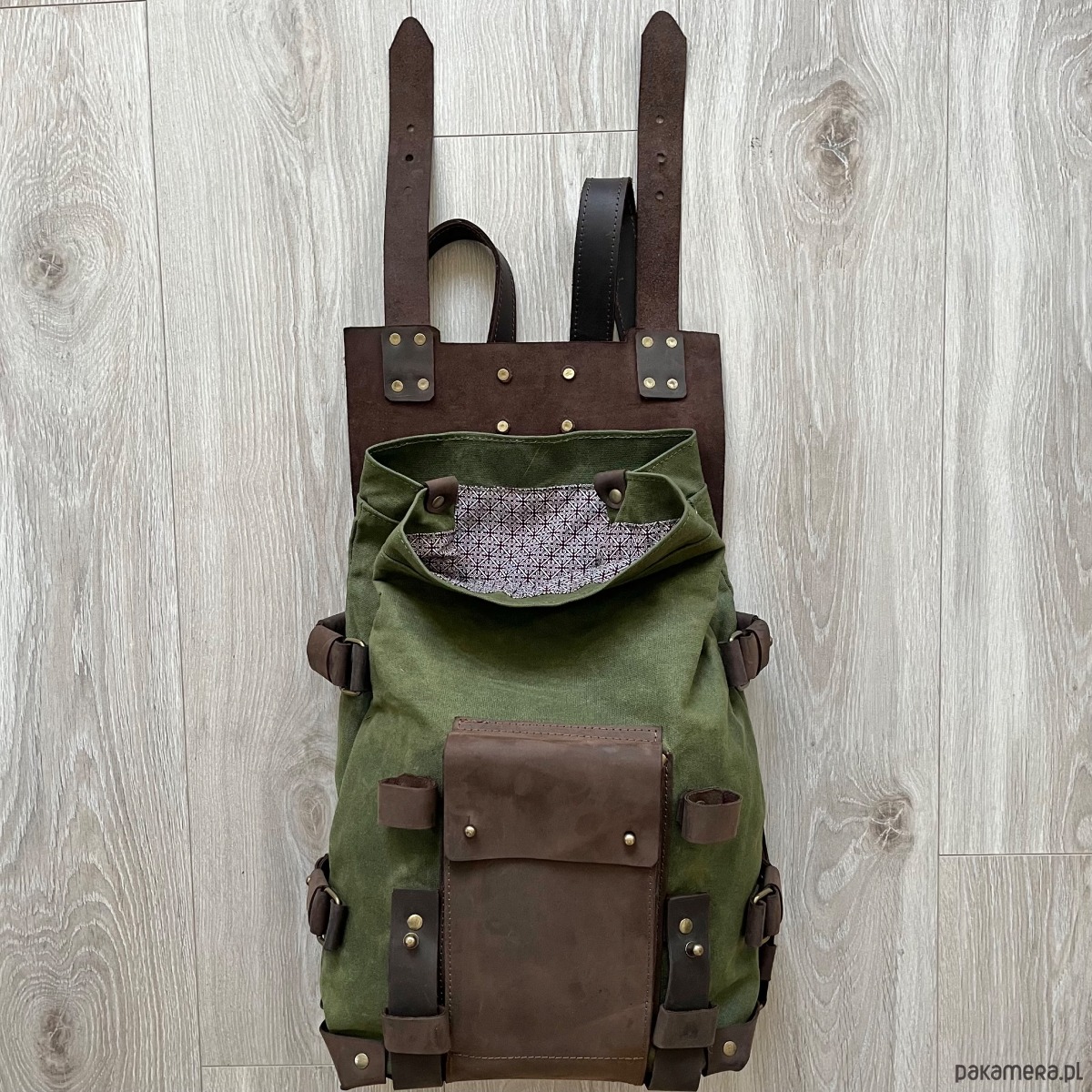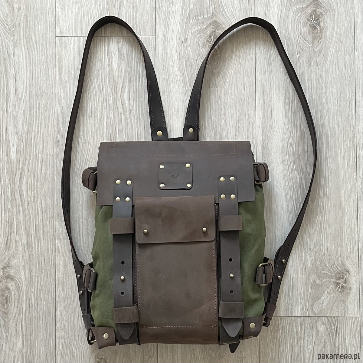 Plecak zielono-brązowy ze skóry i bawełny woskowanej Vintage.