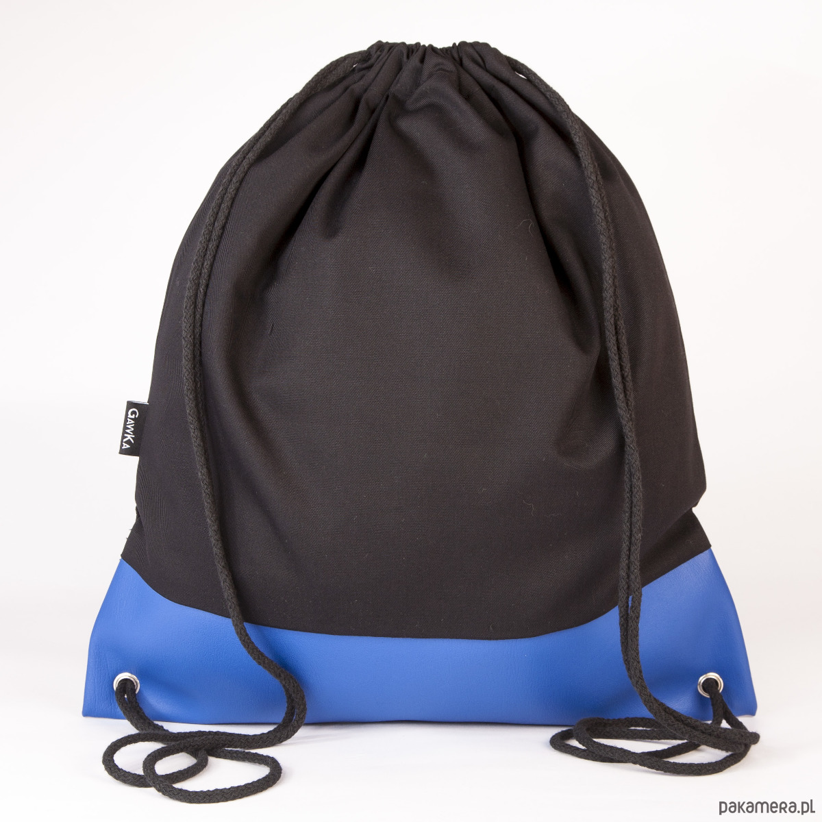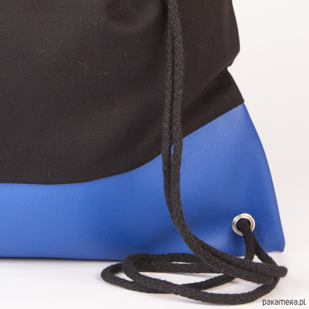 Ręcznie szyty plecak, wykonany z bawełnianej,wytrzymałej tkaniny (75%bawełna 25%poliester). Dół wykonany z niebieskiej ekoskóry, po bokach bawełniane sznurki w możliwością regulacji. W środku mała kieszonka.