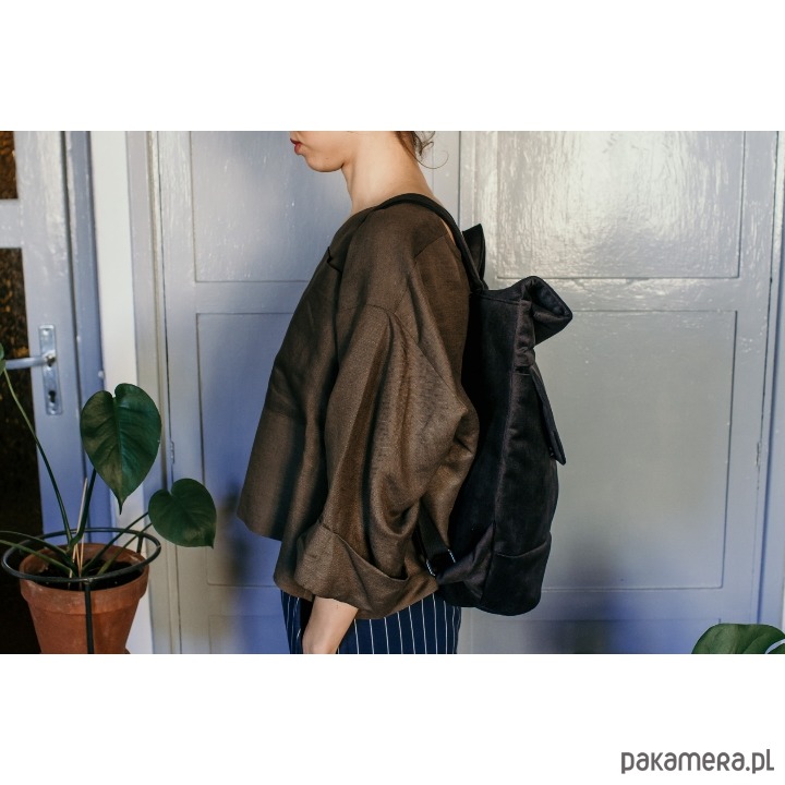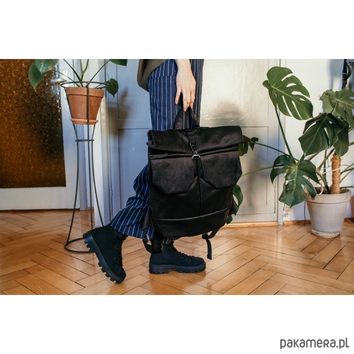 Plecak roll top LUNO to niezastąpiony kompan codziennych eskapad, zarówno tych miejskich, jak i turystycznych, pieszych czy rowerowych. Został uszyty z ekologicznego, impregnowanego zamszu w kolorze czarno szarym. Dwie obszerne kieszenie z przodu zapinane są na magnes. W środku plecak posiada podszewkę z nieprzemakalnej tkaniny ripstop, kieszeń zapinaną na zamek oraz pasek z karabińczykiem na klucze. Zewnętrzny materiał bardzo łatwo czyści się ze wszelkich zabrudzeń. W ramiączka i tył plecaka została wszyta miękka gąbka. Dno konstrukcji jest usztywnione, tak aby całość nie zniekształcała się pod wpływem ciężaru.