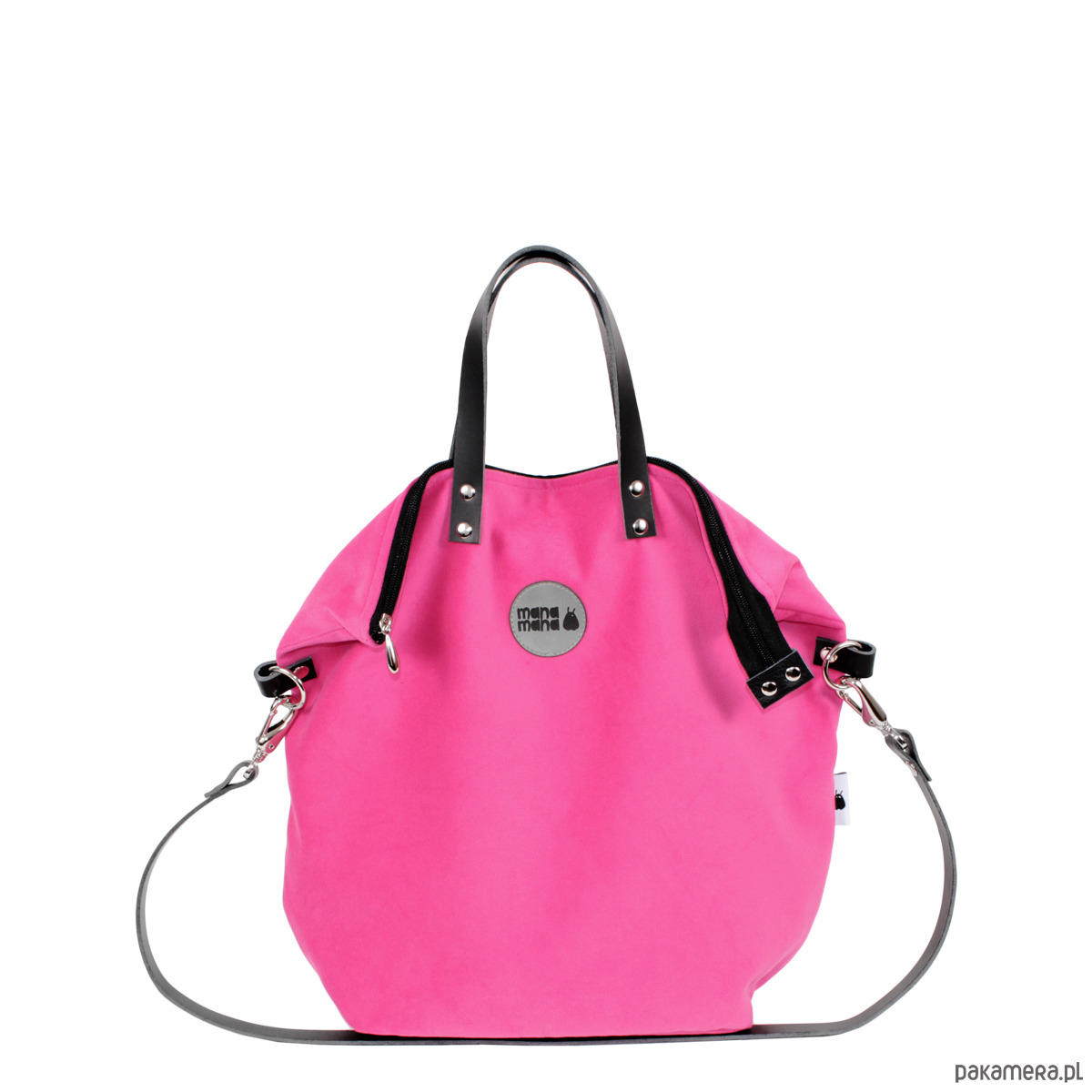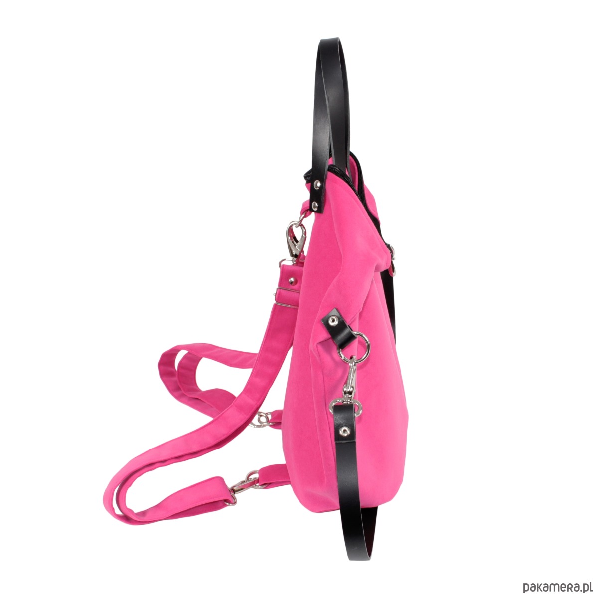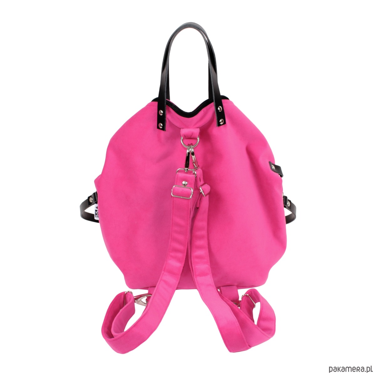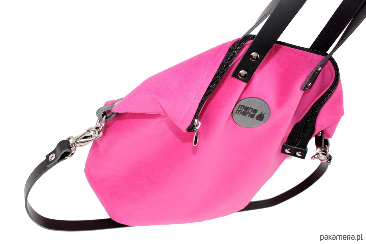 Torebka dwa w jednym czyli plecako-torba w fasonie worka wykonana z różowego eko-zamszu. Wewnątrz znajduje się wytrzymała, podszewka, a w niej trzy kieszonki – dwie otwarte i jedna zamykana na zamek błyskawiczny. Torba posiada skórzane uchwyty i zapięcie na zamek błyskawiczny. W tylnej części znajdują się mocowania i regulowane paski służące do noszenia torby na plecach. W komplecie jest także pasek skórzany który służy do noszenia plecaczka jako torby na jedno ramię.