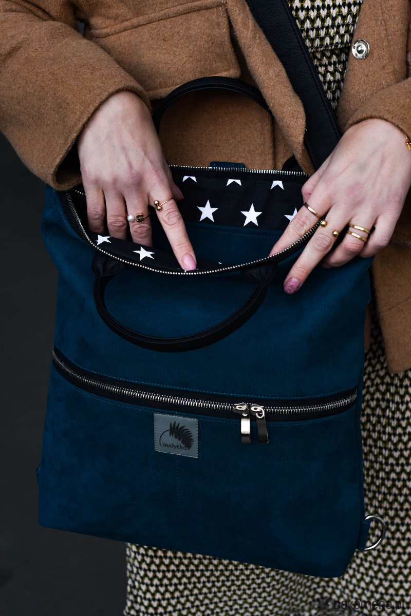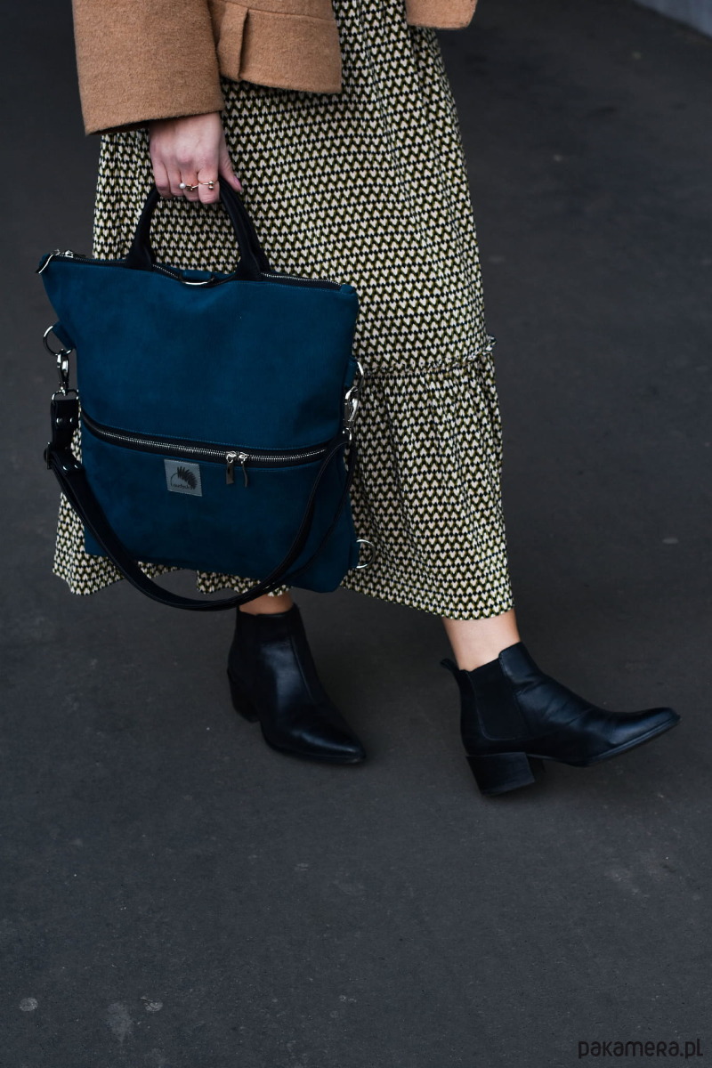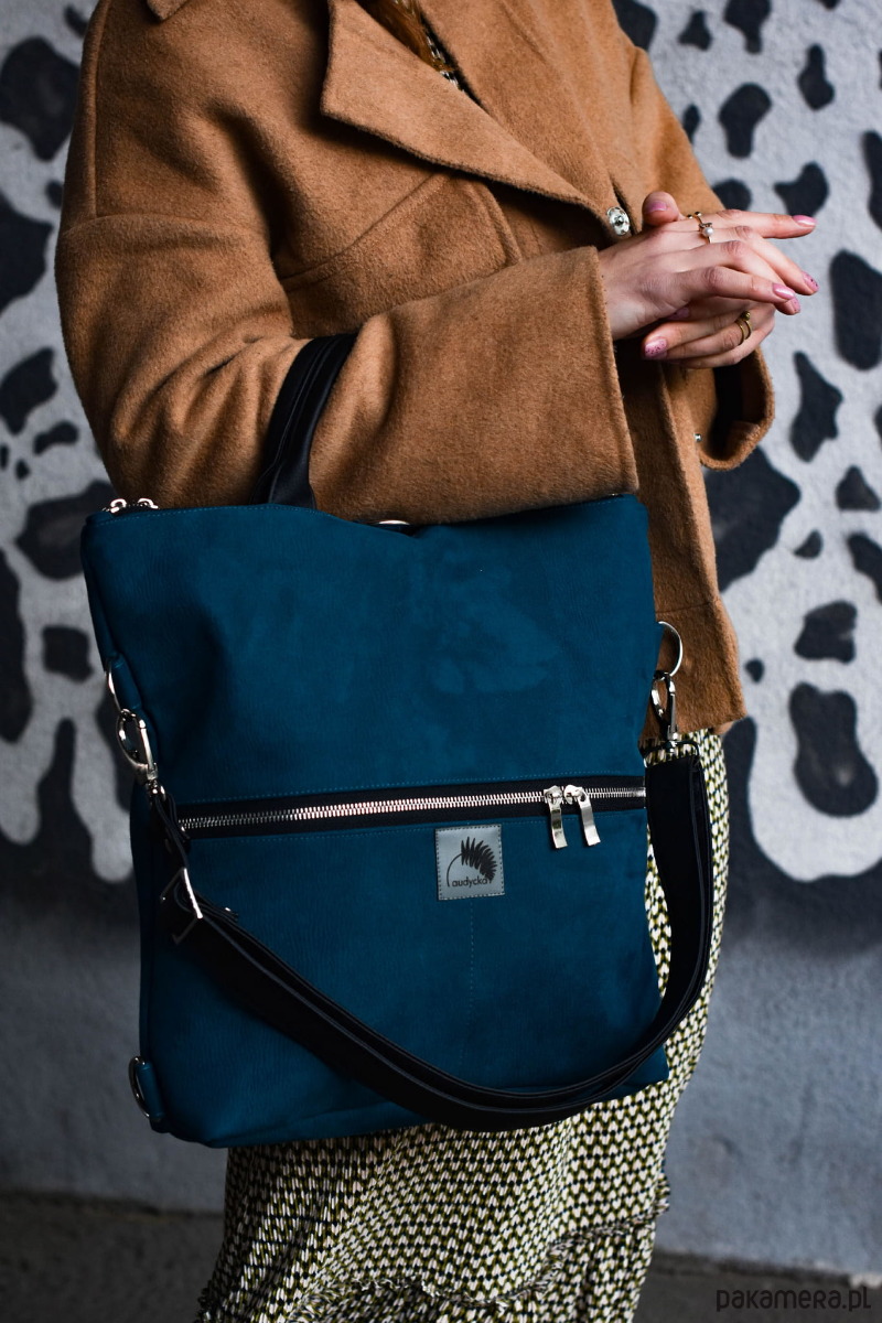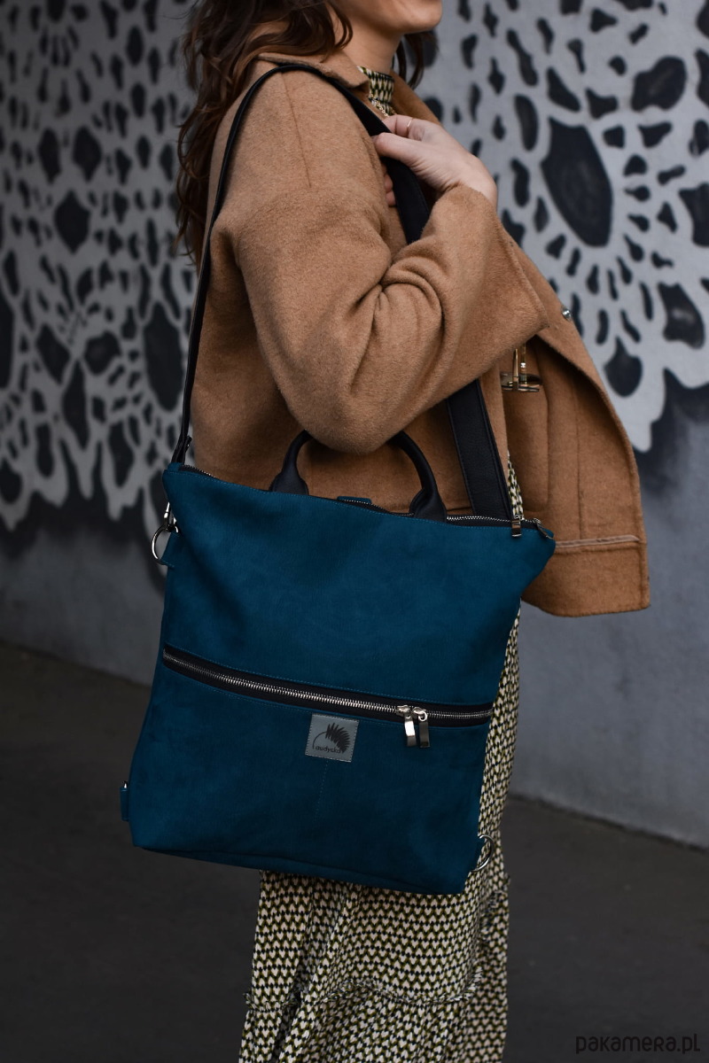 Wodoodporna torba, która staje się plecakiem, lub plecak, który staje się torebką:-). Wystarczy tylko odpowiednio przepiąć paski (długość regulowana), które raz są szelkami plecaka, innym razem paskiem torebki. Wygoda plecaka, elegancja torebki, miejski look. Mieści format A4 i świetnie sprawdzi się w pracy, szkole i na uczelni. Zabierzesz ją na rower i spacer z dzieckiem. Zmieści tablet, dokumenty, książki lub notatki, a w dwóch zewnętrznych kieszonkach wszelkie mniej cenne drobiazgi. Doskonała alternatywa dla aktywnych kobiet, którym ortalionowe plecaki są nie po drodze;-)