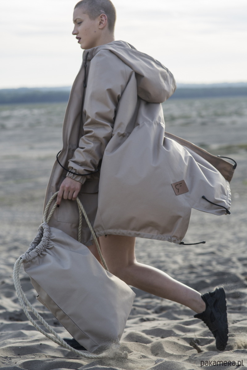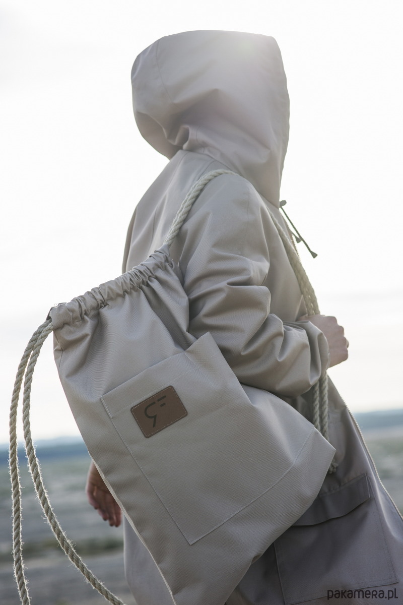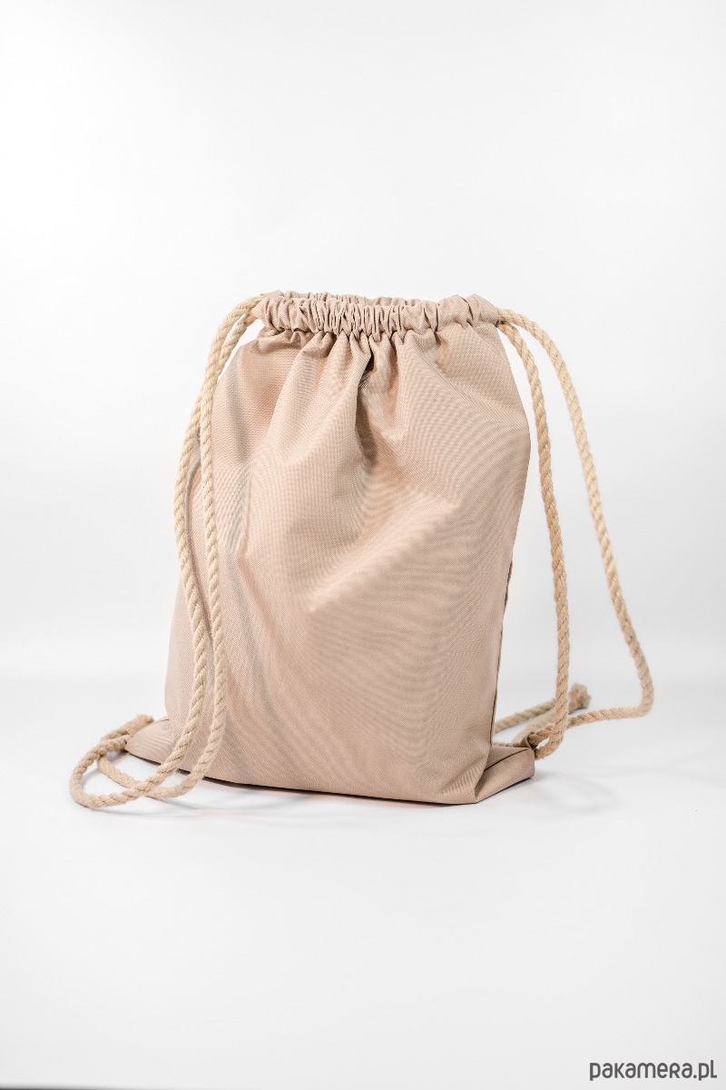 Worek/plecak wykonany z wodoodpornej tkaniny kodura w kolorze mocca/ beżowym