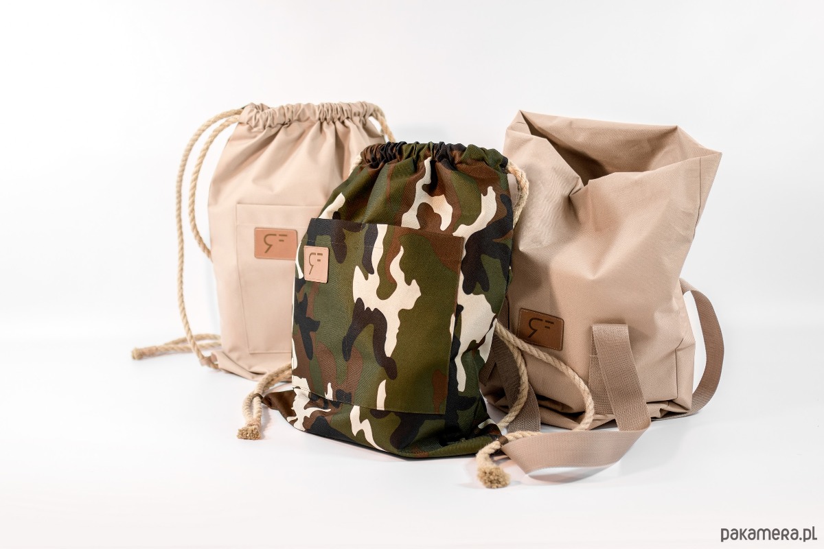 Tkanina charakteryzuje się bardzo dużą wytrzymałością na rozciąganie, wszelkiego rodzaju przetarcia oraz działanie mechaniczne. Minimalistyczny krój, z przodu pojemna, dzielona kieszeń ze skórzaną aplikacją z logo RF, uchwyty z grubego jutowego sznura- regulacja długości.