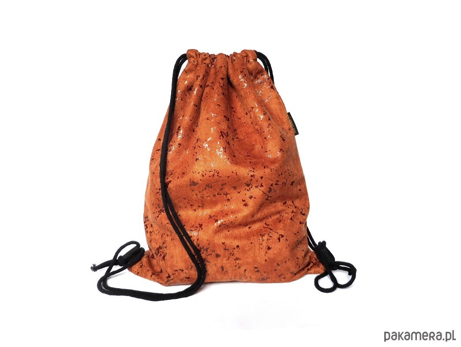 Miękki i lekki plecak /worek wykonany z zamszu typu alcantara w kolorze ceglanym.