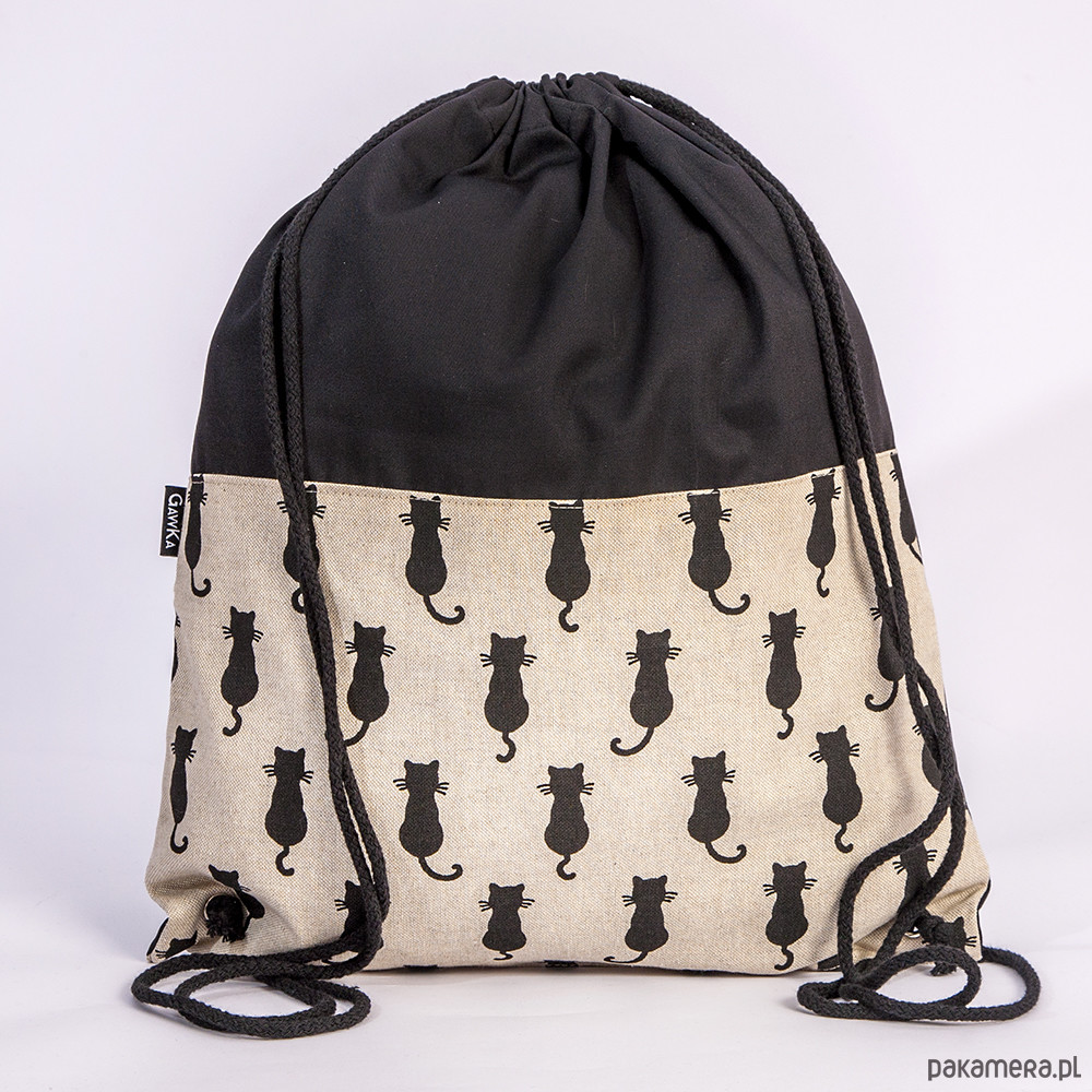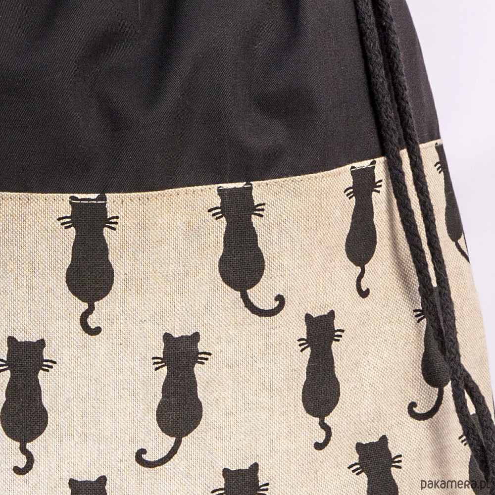 Worek z bawełnianej tkaniny z naszytym materiałem w koty.