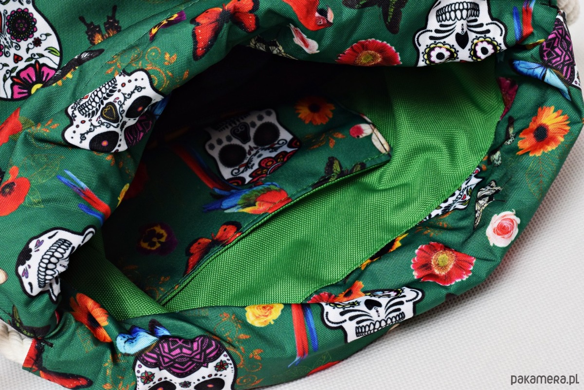 W środku worka jest także wodoodporna podszewka oraz kieszonka która pomieści drobiazgi takie jak klucze, telefon itp.