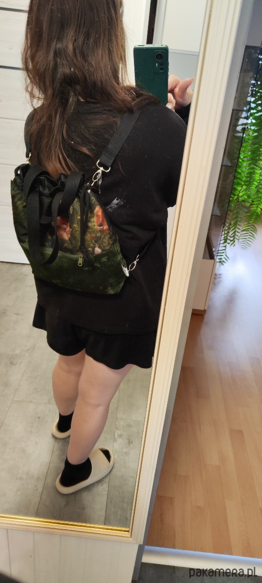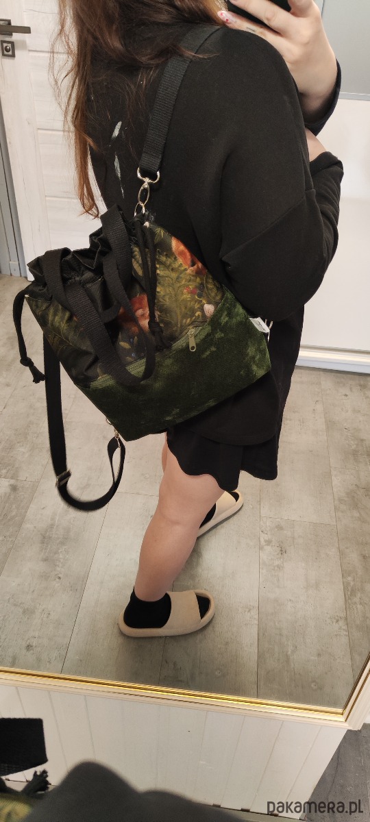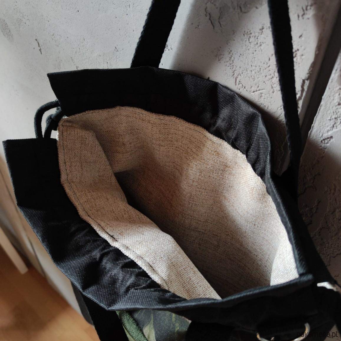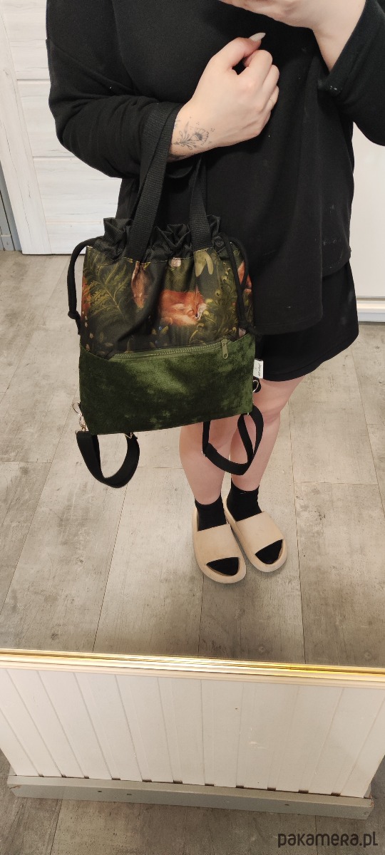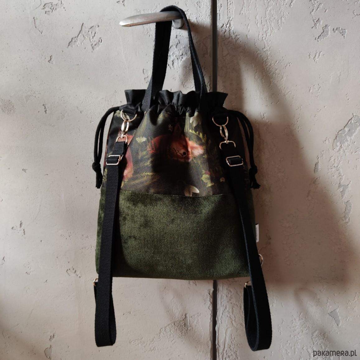 Plecak uszyty z unikatowej tkaniny wodoodpornej z nadrukiem oraz tkaniny tapicerskiej w kolorze ciemnej zieleni khaki wewnątrz wszyta lniana wodoodporna beżowa podszewka. Na przodzie plecak ma kieszonkę zapinaną na zamek po stronie zewnętrznej. W komplecie regulowane szelki z taśmy bawełnianej czarnej 25mm z możliwością odpięcia i wymiany na inny kolor lub przepięcia i zrobienia taśmy, która będzie przez tułów (plecak wtedy staje się torebką). U góry zaciąganie na sznurki jak typowy plecak worek. Szerokość plecaka 32cm, wysokość plecaka 30cm, poszerzone dno 7 cm.