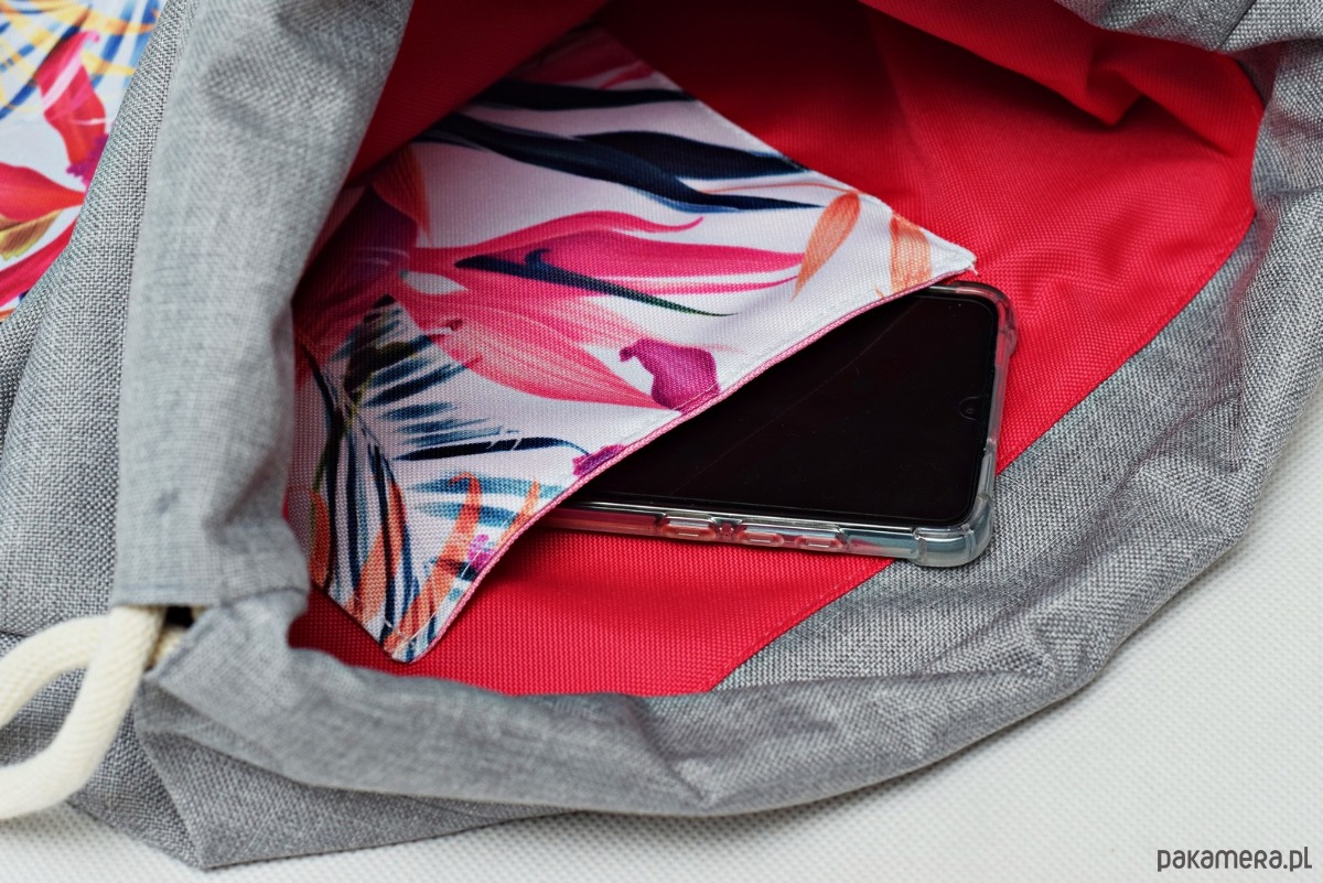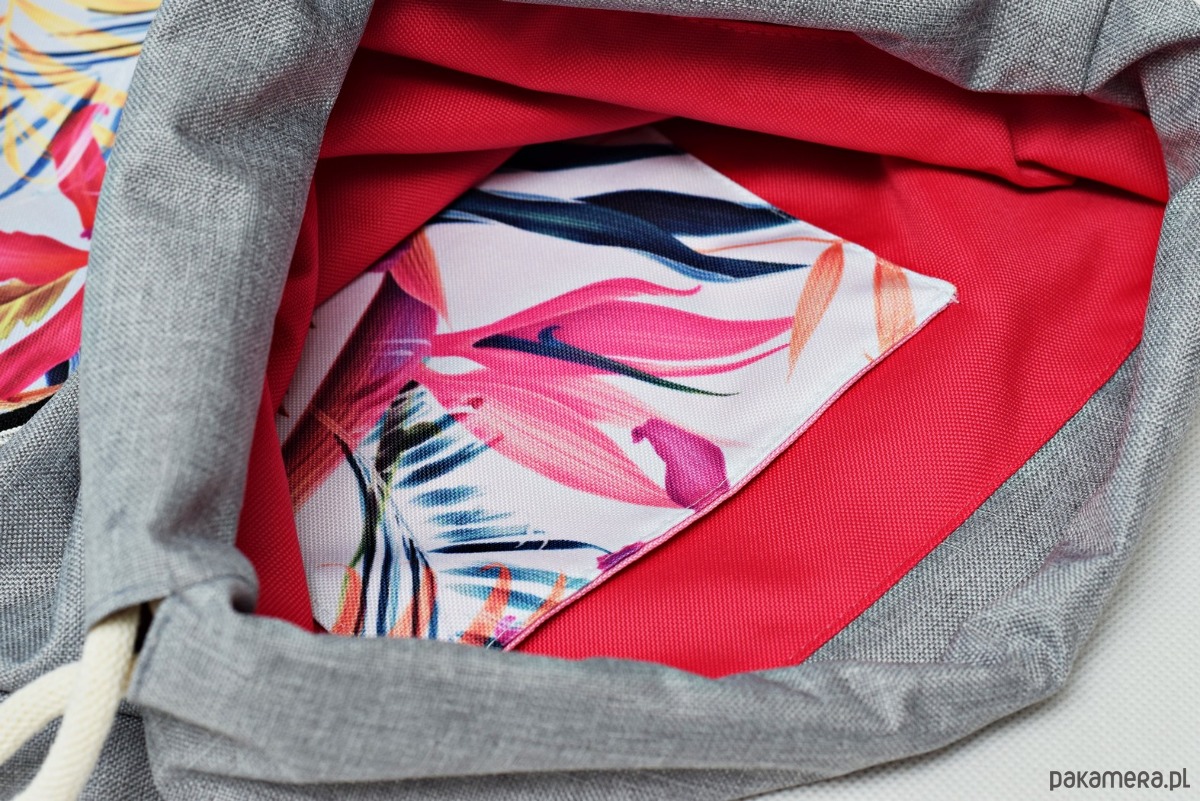 W środku worka jest także wodoodporna podszewka oraz kieszonka która pomieści drobiazgi takie jak klucze, telefon itp.