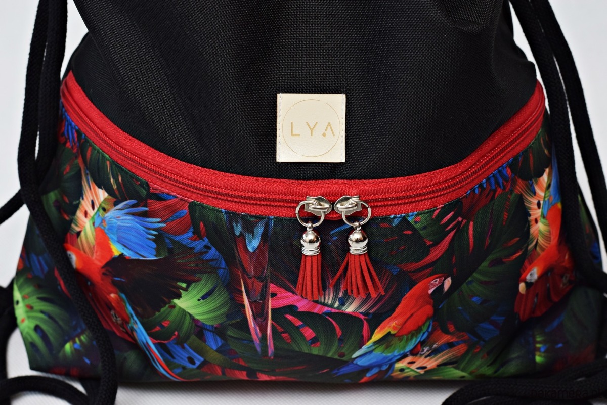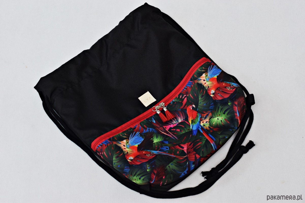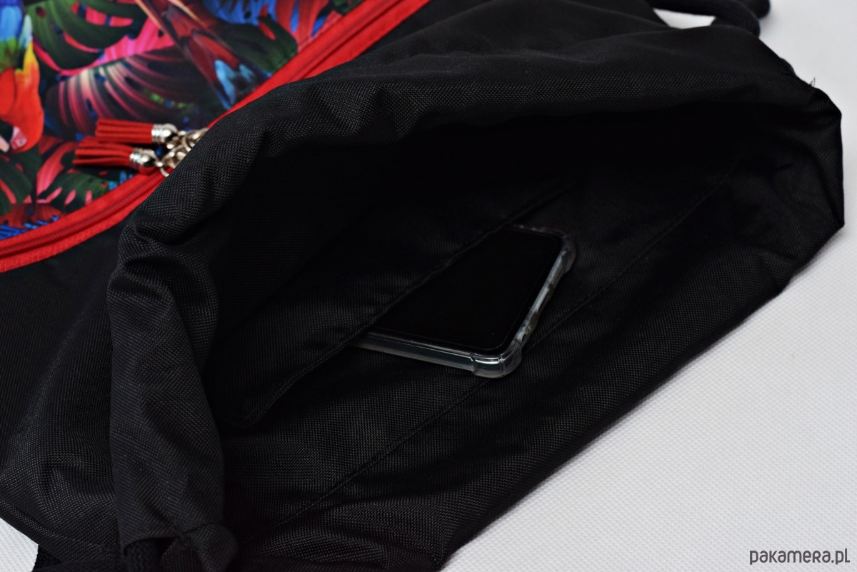 W środku worka jest także wodoodporna podszewka oraz kieszonka która pomieści drobiazgi takie jak klucze, telefon itp.
