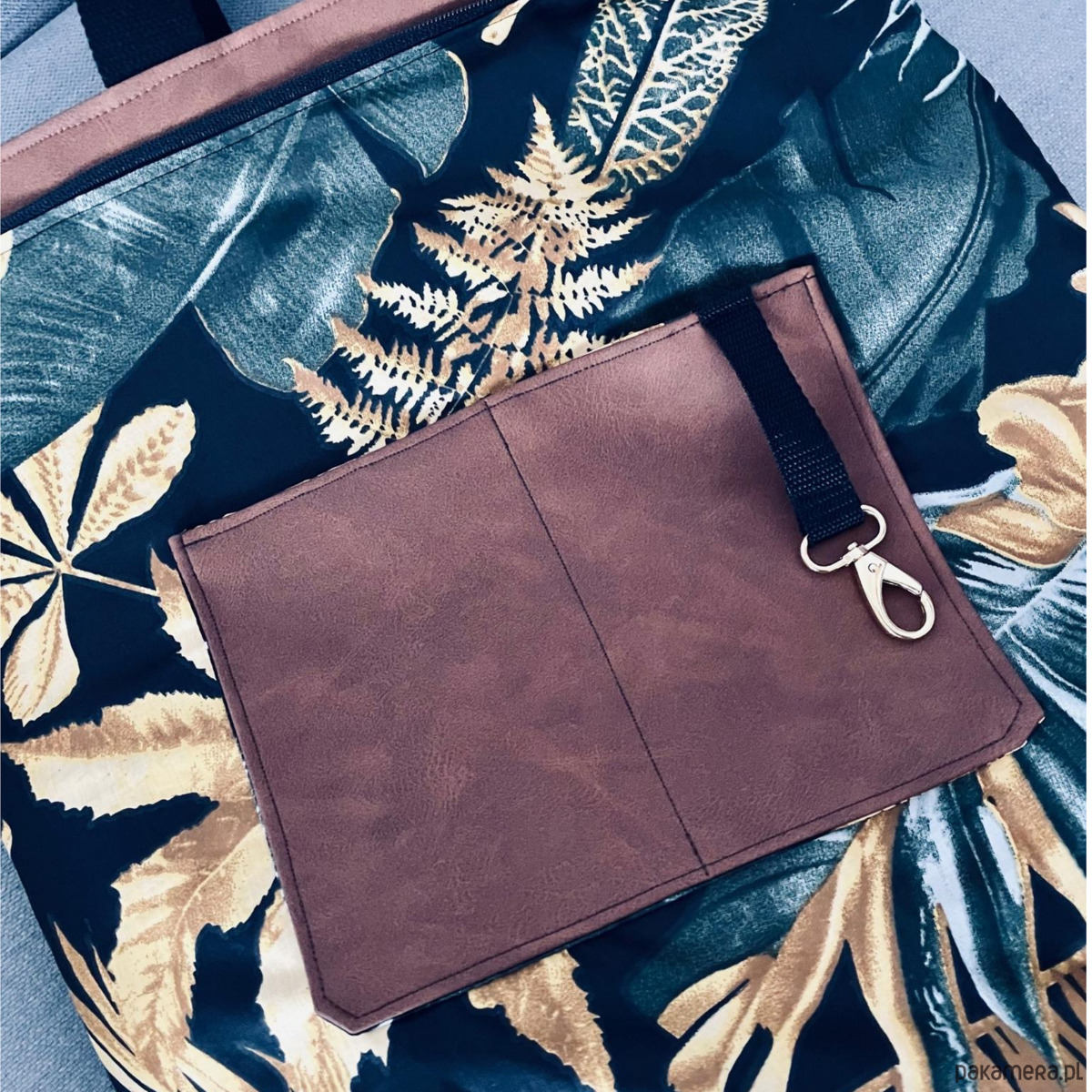 Środek: bawełniana podszewka. Kieszeń zasuwana na suwak. Dwie otwarte kieszonki na drobiazgi i telefon. Karabińczyk na klucze.
