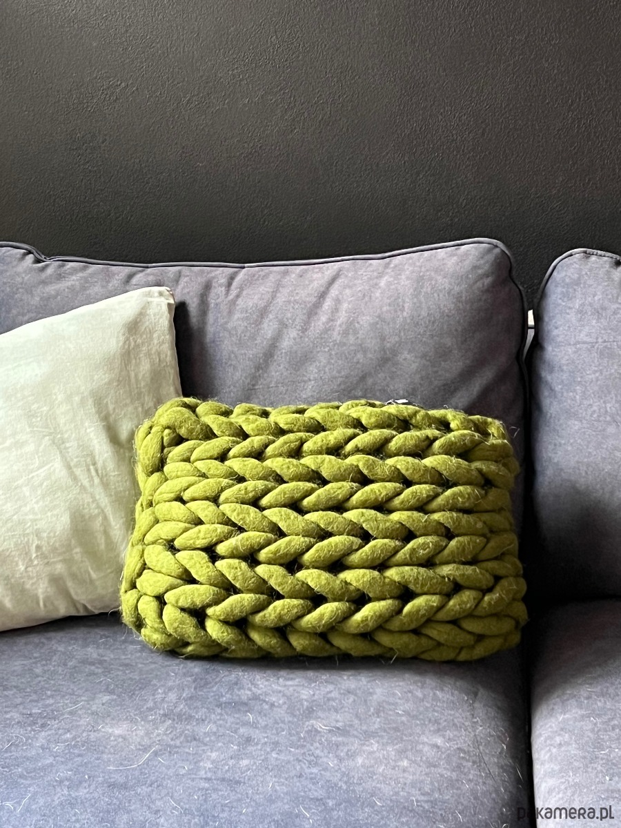 Miękka i puszysta pleciona dekoracyjna poduszka wykonana ręcznie na grubych drutach ze 100% wełny.