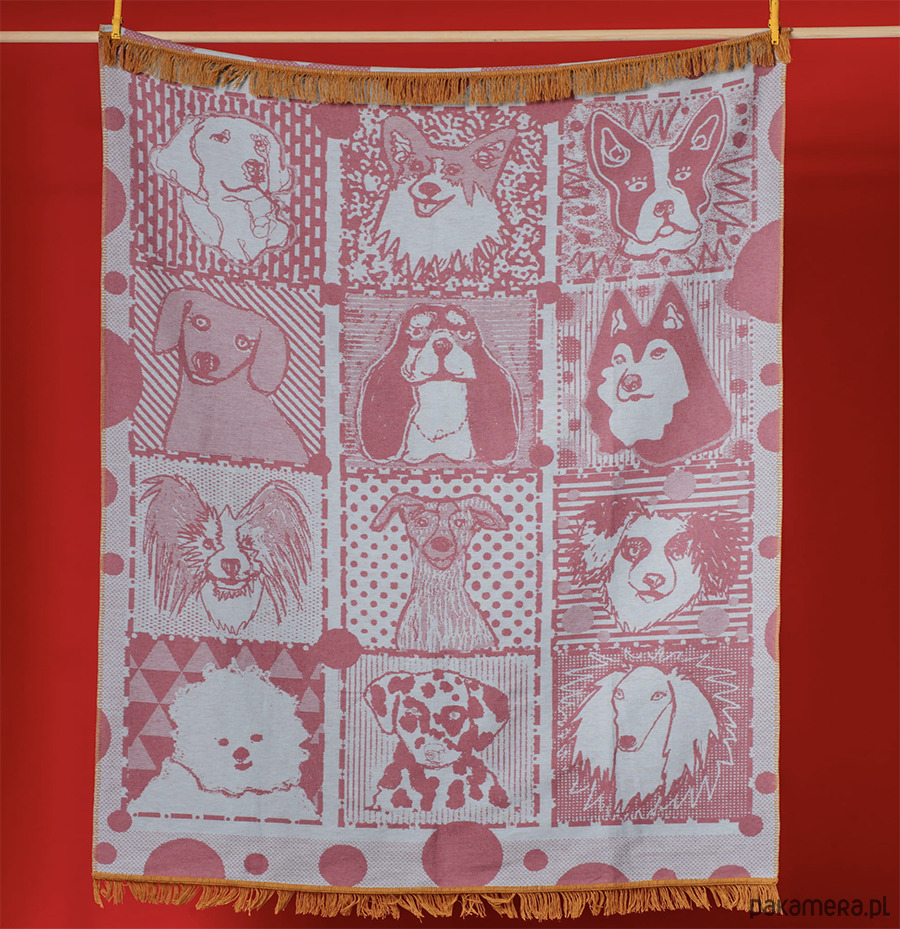 Pled żakardowy błękitno-fioletowy z pieskami i żółtym frędzlem