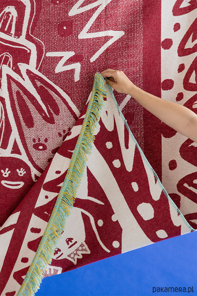 Pled “Pocztówka z Pizy” to tkane selfie w bordowo-beżowej odsłonie z miętowym szydełkiem oraz miętowo - żółtymi frędzlami. Świetnie się odnajdzie we wnętrzu jako narzuta na ulubiony fotel czy w parku jako pled piknikowy.