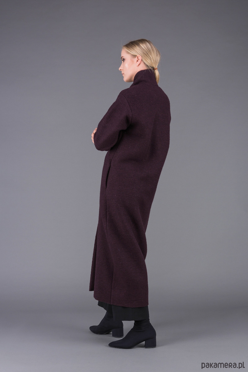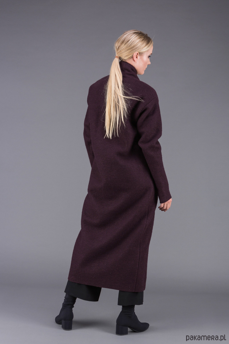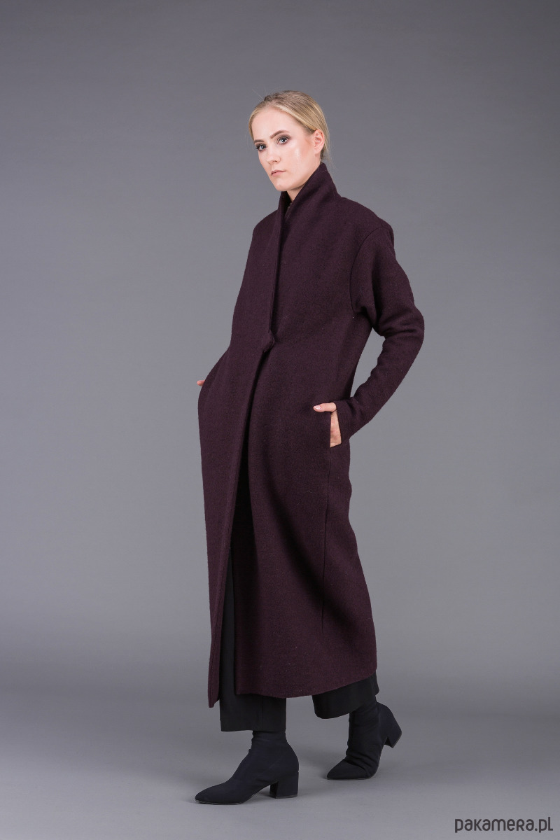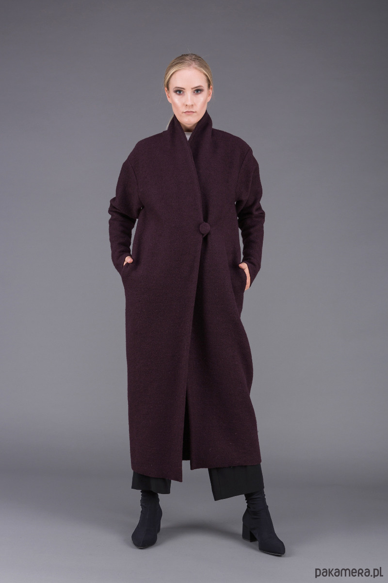 stylowy, bardzo ciepły, klasyczny płaszcz uszyty z ciepłej, sfilcowanej wełny gotowanej w kolorze śliwkowym z wyższym kołnierzem szalowym, zapiętym na 1 guzik,