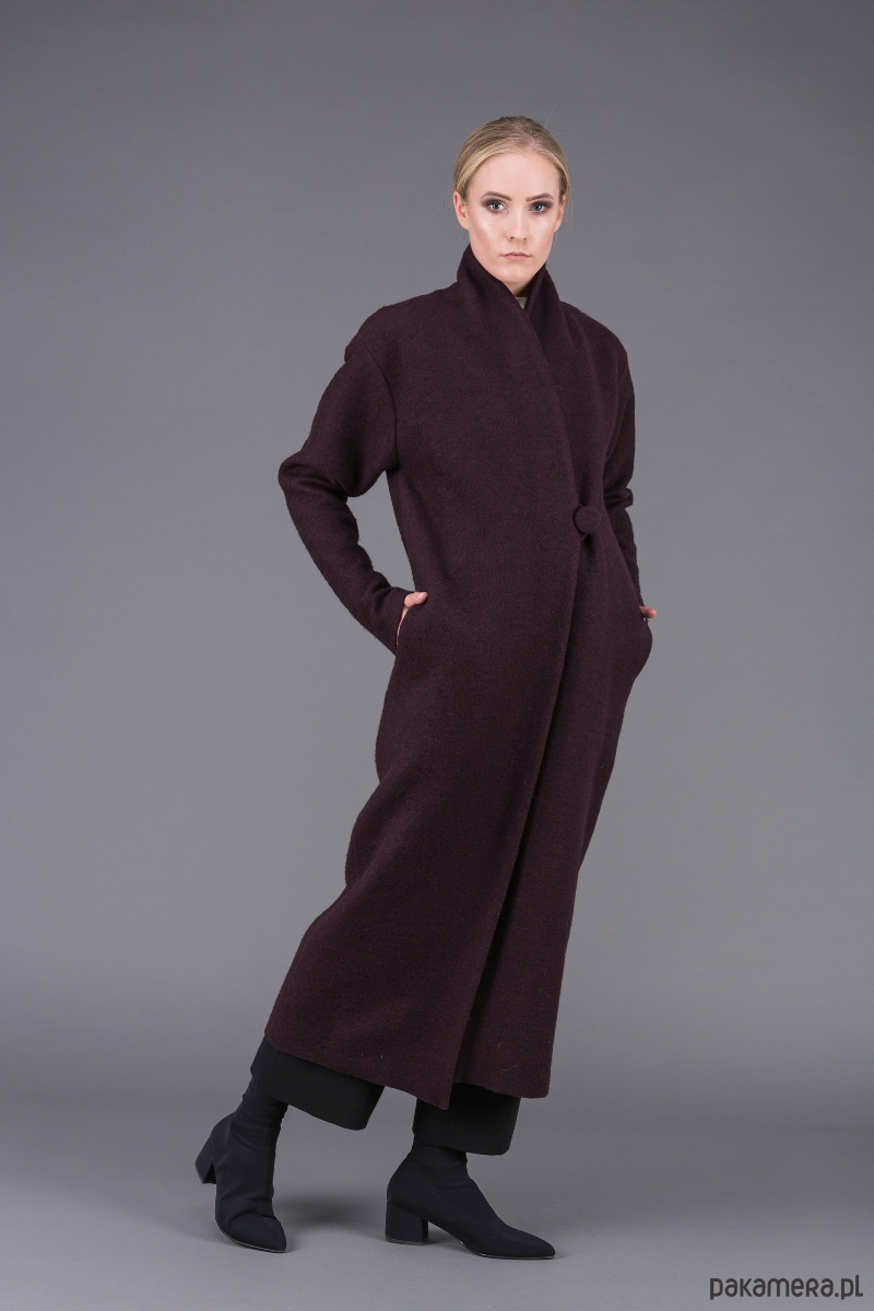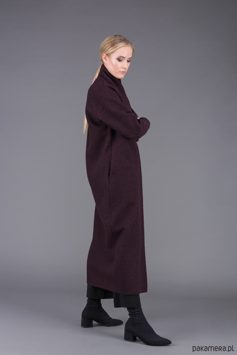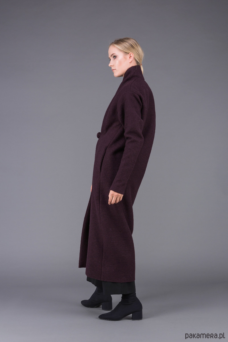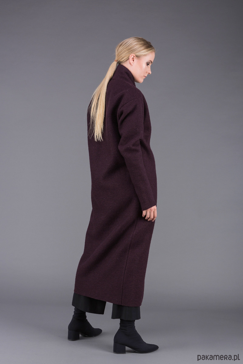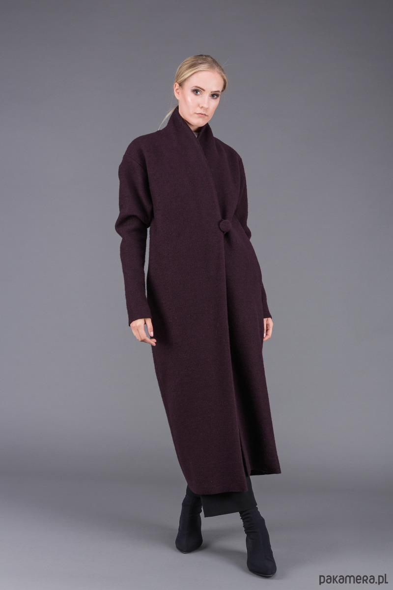 stylowy, bardzo ciepły, klasyczny płaszcz uszyty z ciepłej, sfilcowanej wełny gotowanej w kolorze śliwkowym z wyższym kołnierzem szalowym, zapiętym na 1 guzik,