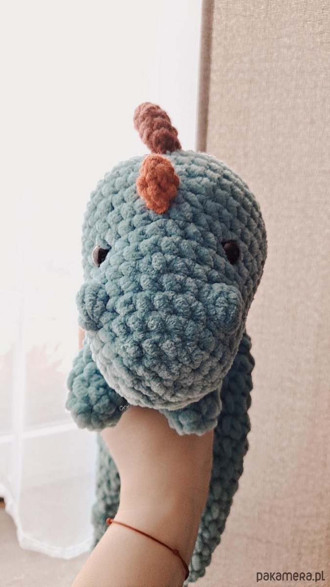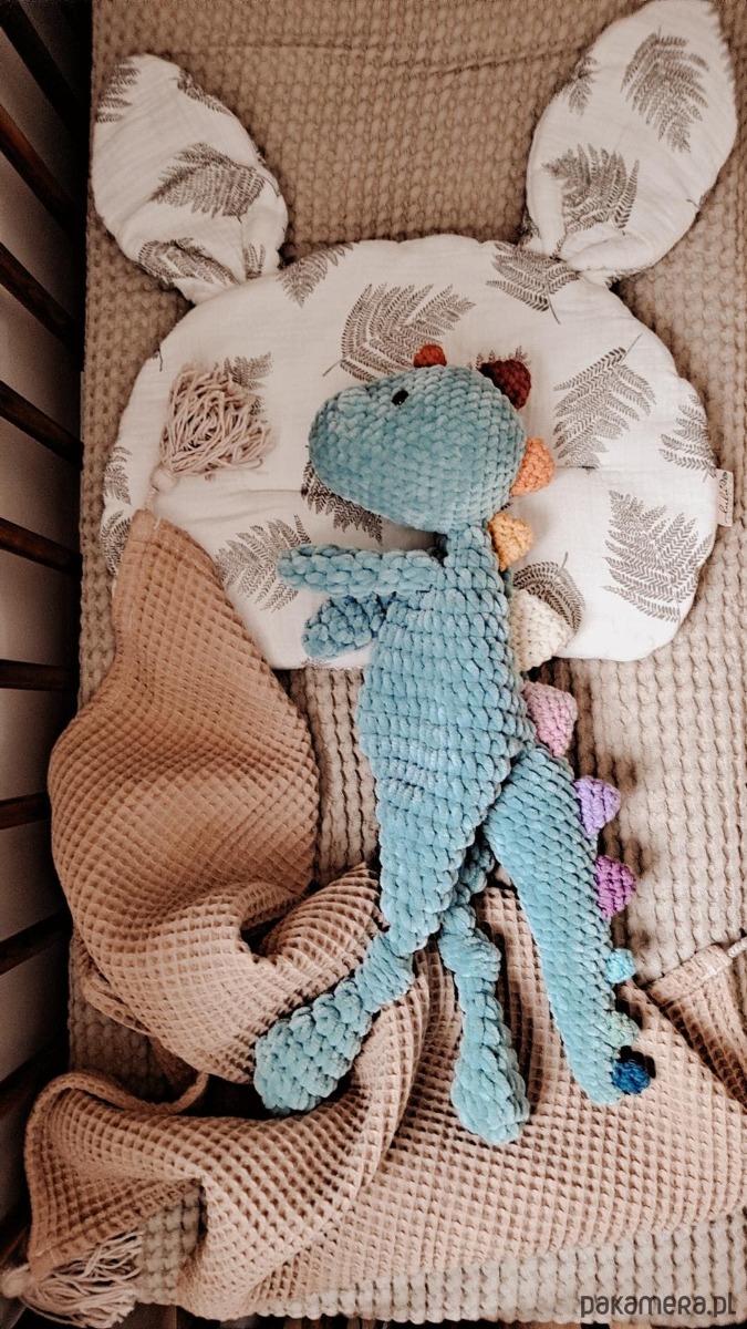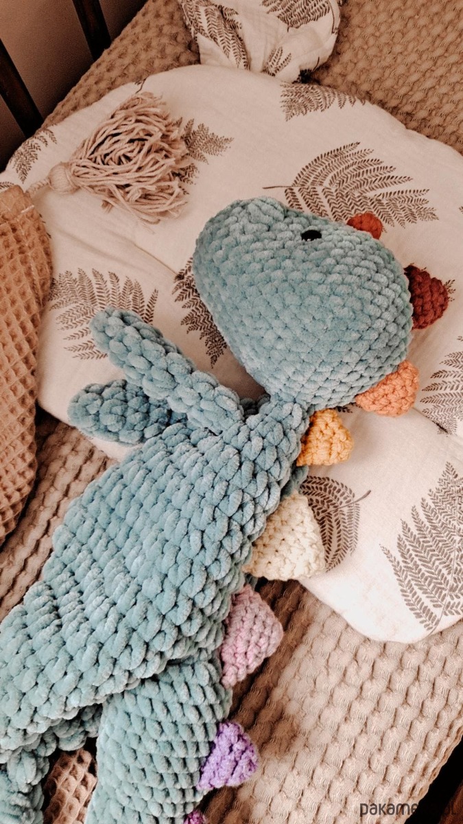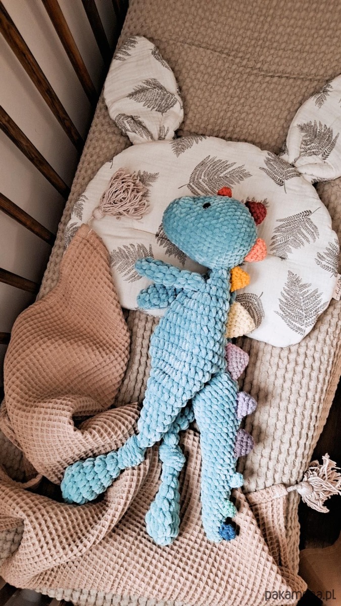 Dino wykonany jest z pluszowej włóczki. Głowa i ogon są wypełnione antyalergicznym wypełnieniem, natomiast brzuszek Dina pozostaje niewypełniony. To połączenie mięciutkiego kocyka z ulubioną maskotką!