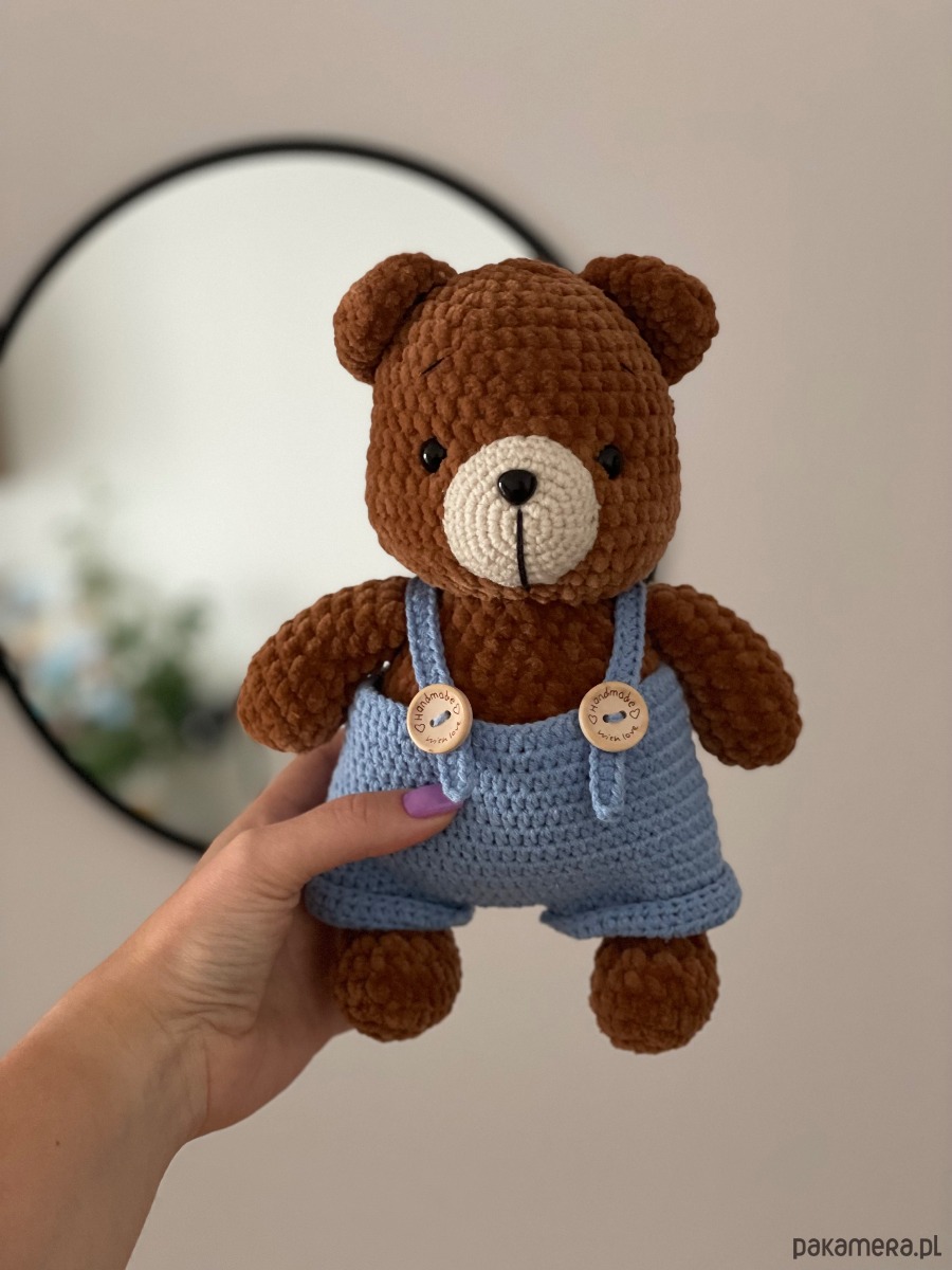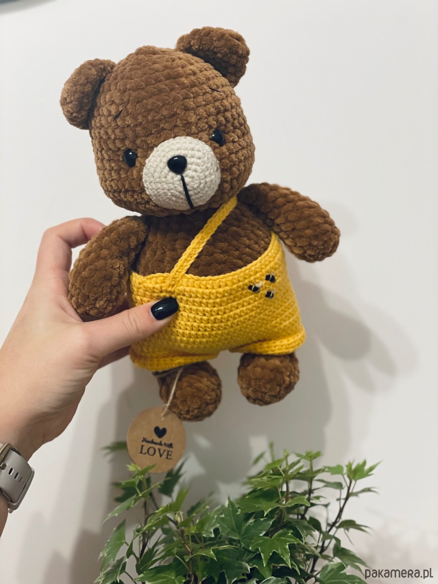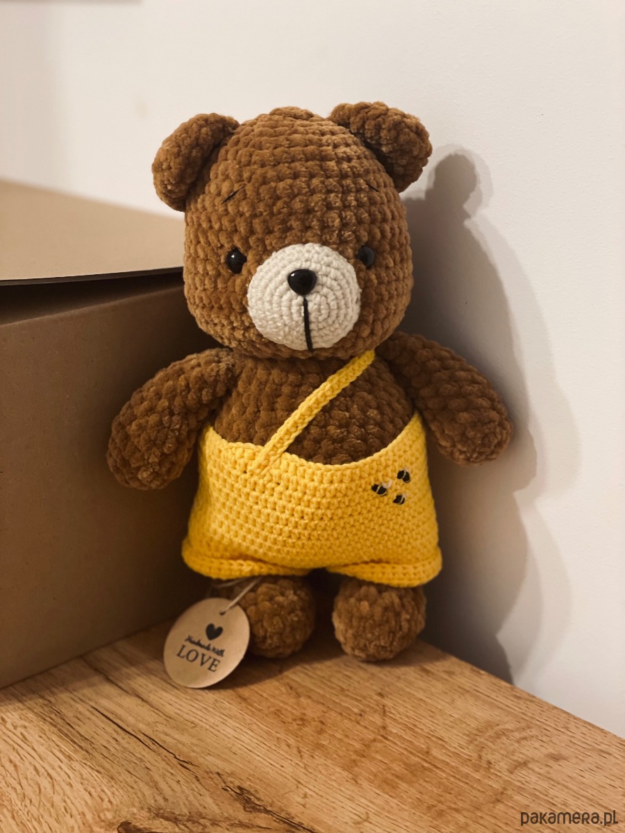 Piękny pluszowy mis, wykonany ręcznie na szydełku z bardzo milej w dotyku włóczki (Himalaya Dolphin Baby). Miś ma kolorowe gatki, kolor do ustalenia. Zabawka posiada bezpieczne oczka, wypełnienie kulka silikonowa. Wysokosc misia ~24cm.