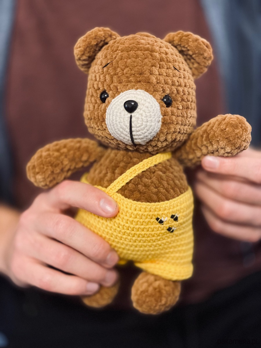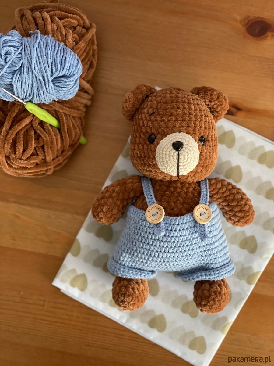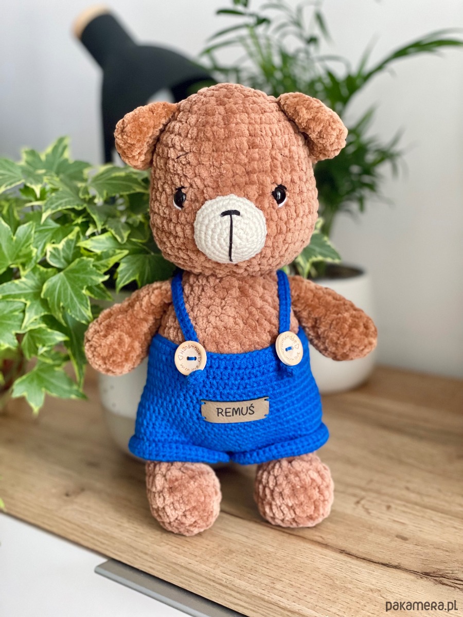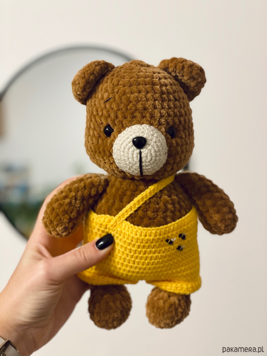 Piękny pluszowy mis, wykonany ręcznie na szydełku z bardzo milej w dotyku włóczki (Himalaya Dolphin Baby). Miś ma kolorowe gatki, kolor do ustalenia. Zabawka posiada bezpieczne oczka, wypełnienie kulka silikonowa. Wysokosc misia ~24cm.